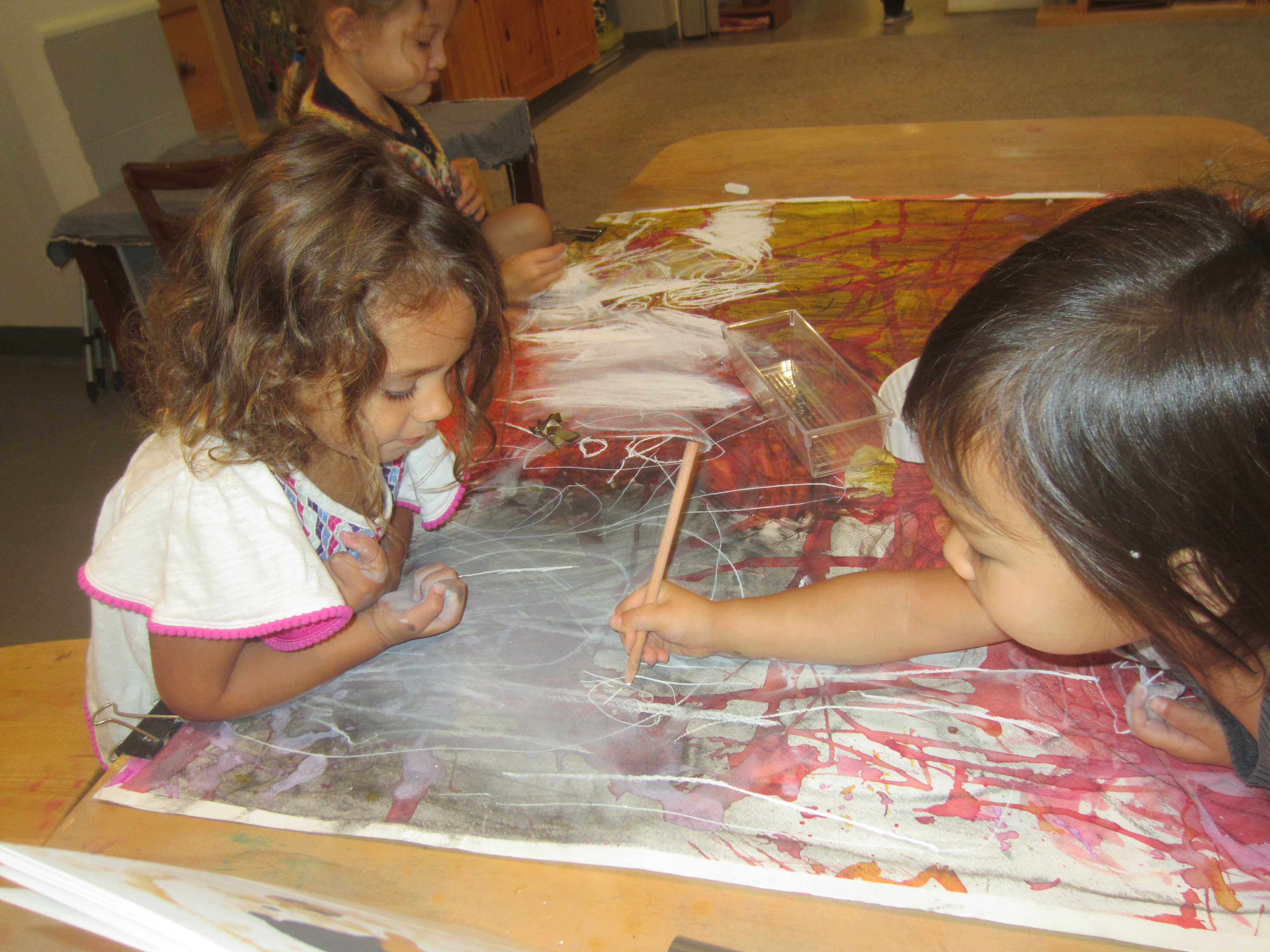 The West Wing teachers are introducing the word “support” to our common classroom language. We added it to highlight a difference between “Helping”, having someone do it for you while you become a passive observer, and “Support”, being an active participant as someone comes alongside you as you work together. Rather than simply drawing her idea of a mommy for Olive, MJ was able ask questions and involve Olive in the representation of her idea. Because Olive was an active participant when she came to a part she could do, she felt comfortable to move forward with the work.