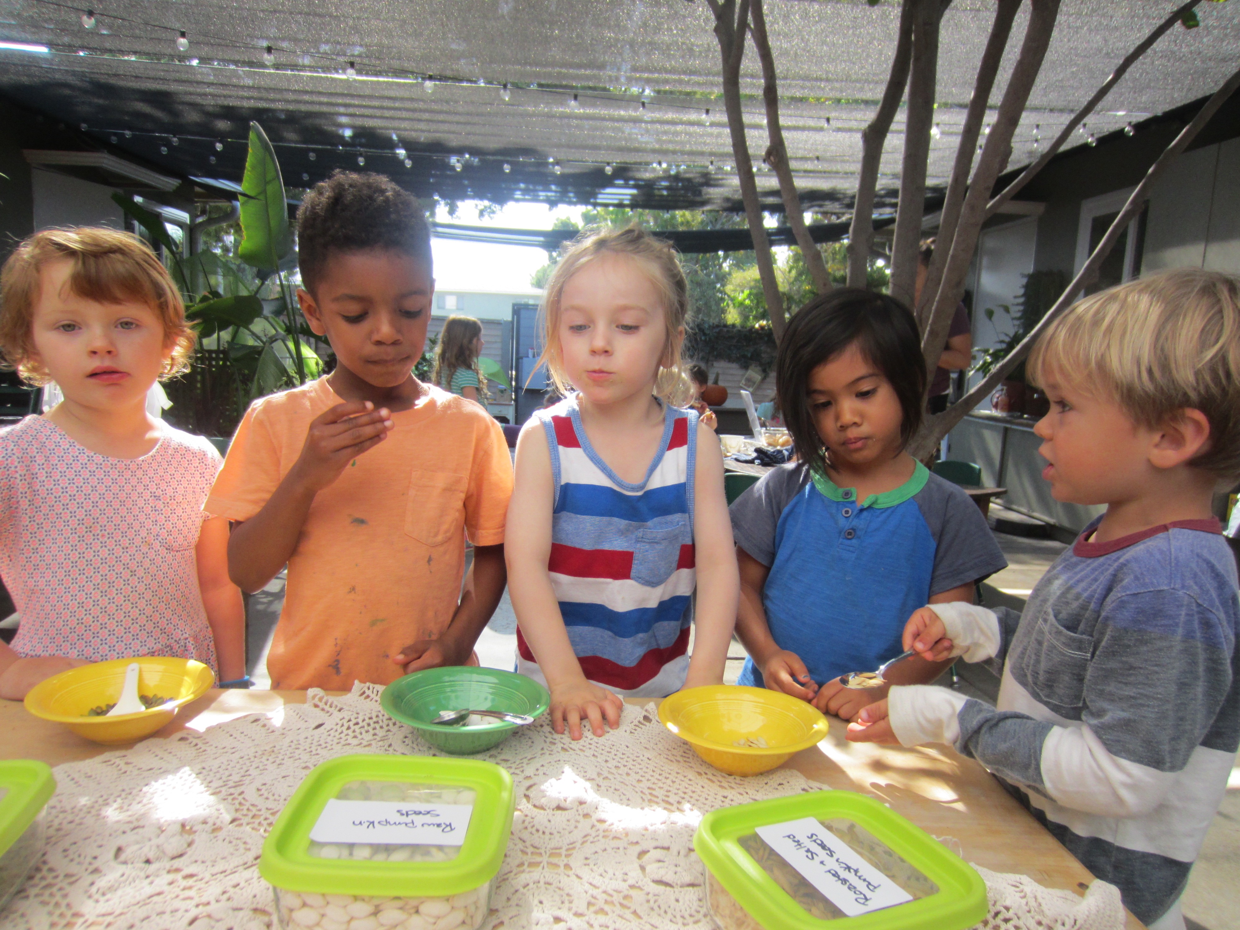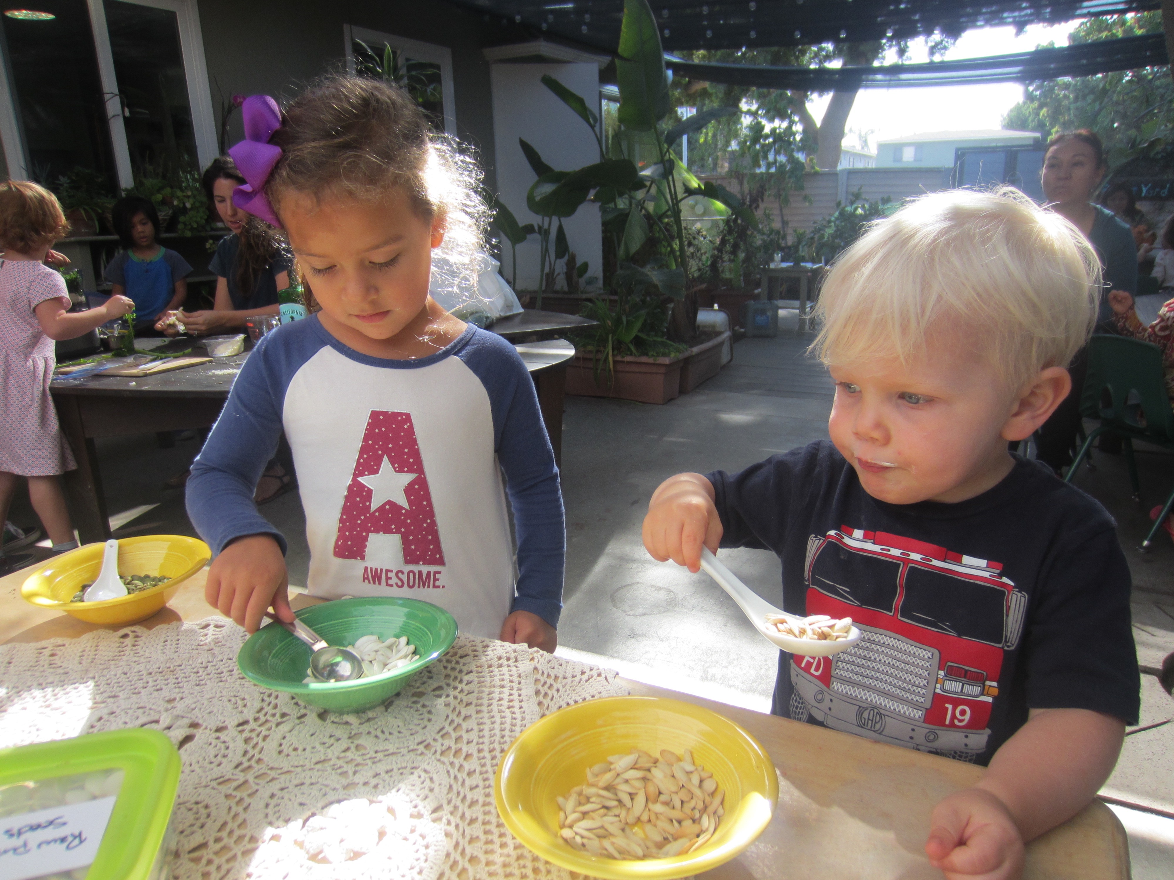 Today, Laz’s mom Jess came to make snack with the children. She brought a selection of seeds, zucchini, pasta, kale, and ingredients for pesto. The children tasted the seeds.