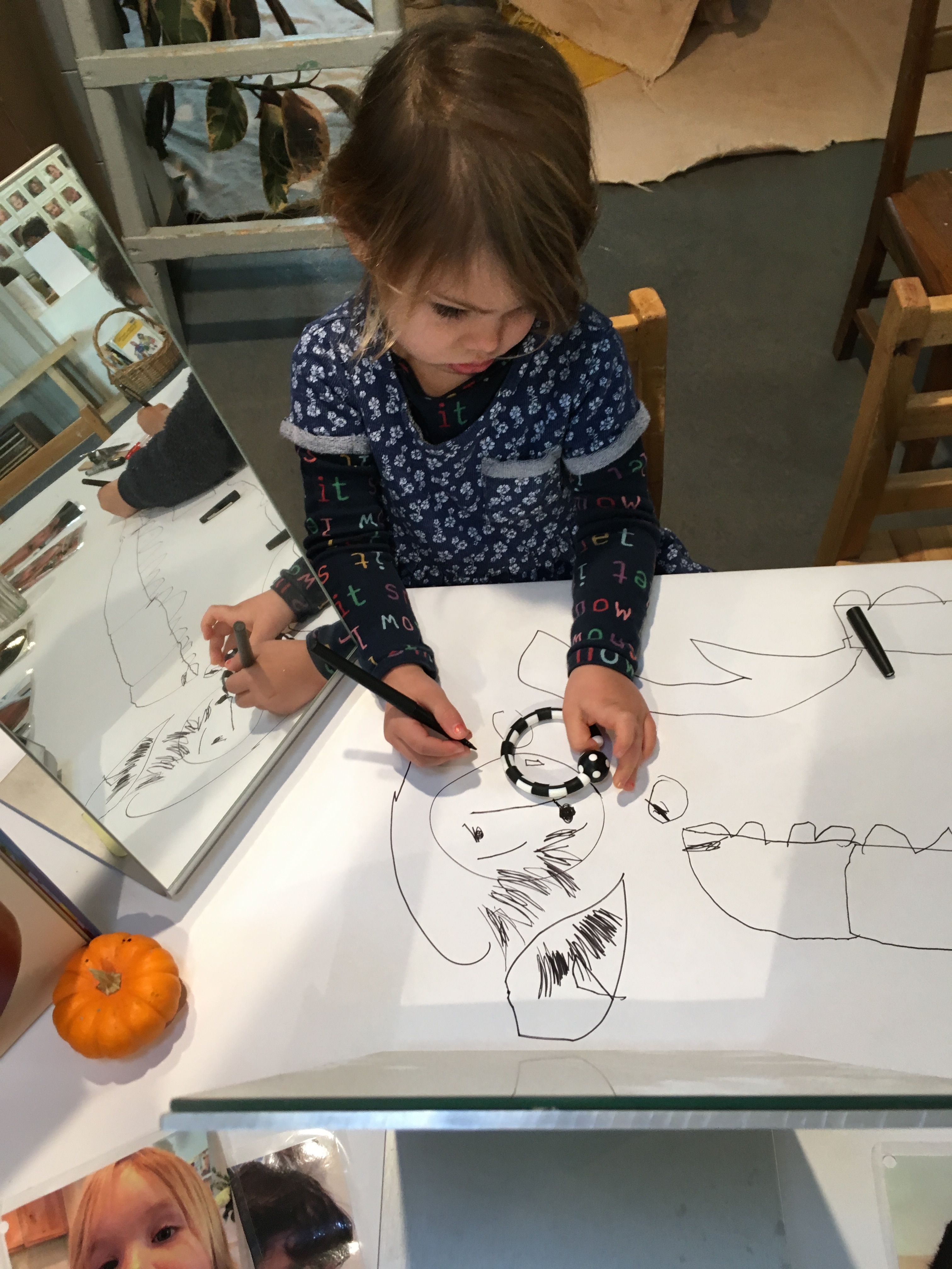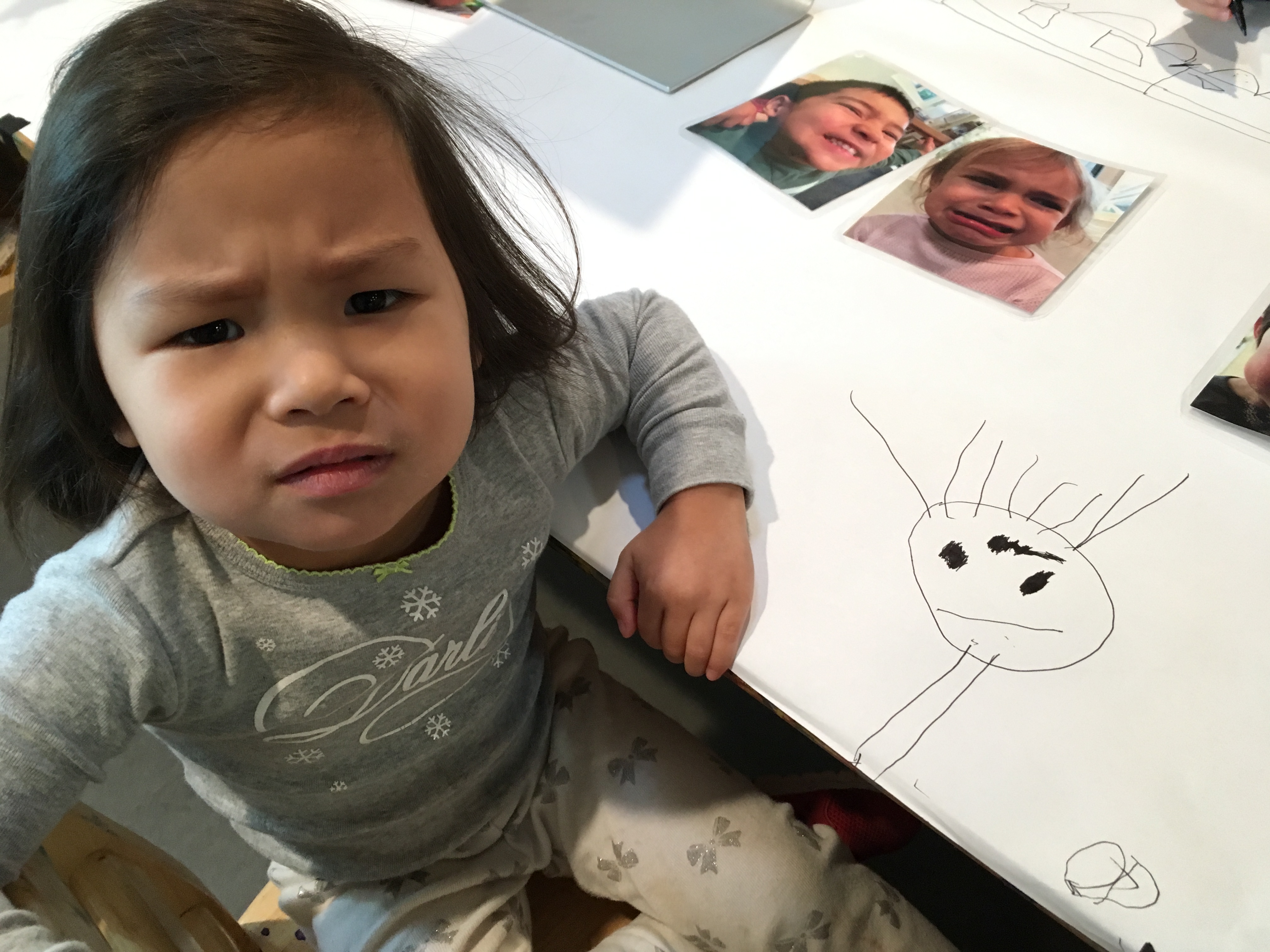 As the West Wing children have been playing the “Sign Language Game”, we have noticed them closely observing pictures of their peers expressing emotions. One morning, we provided mirrors, paper, and pens and we took new pictures to add to the Game and to facilitate the discussion of their feelings.
