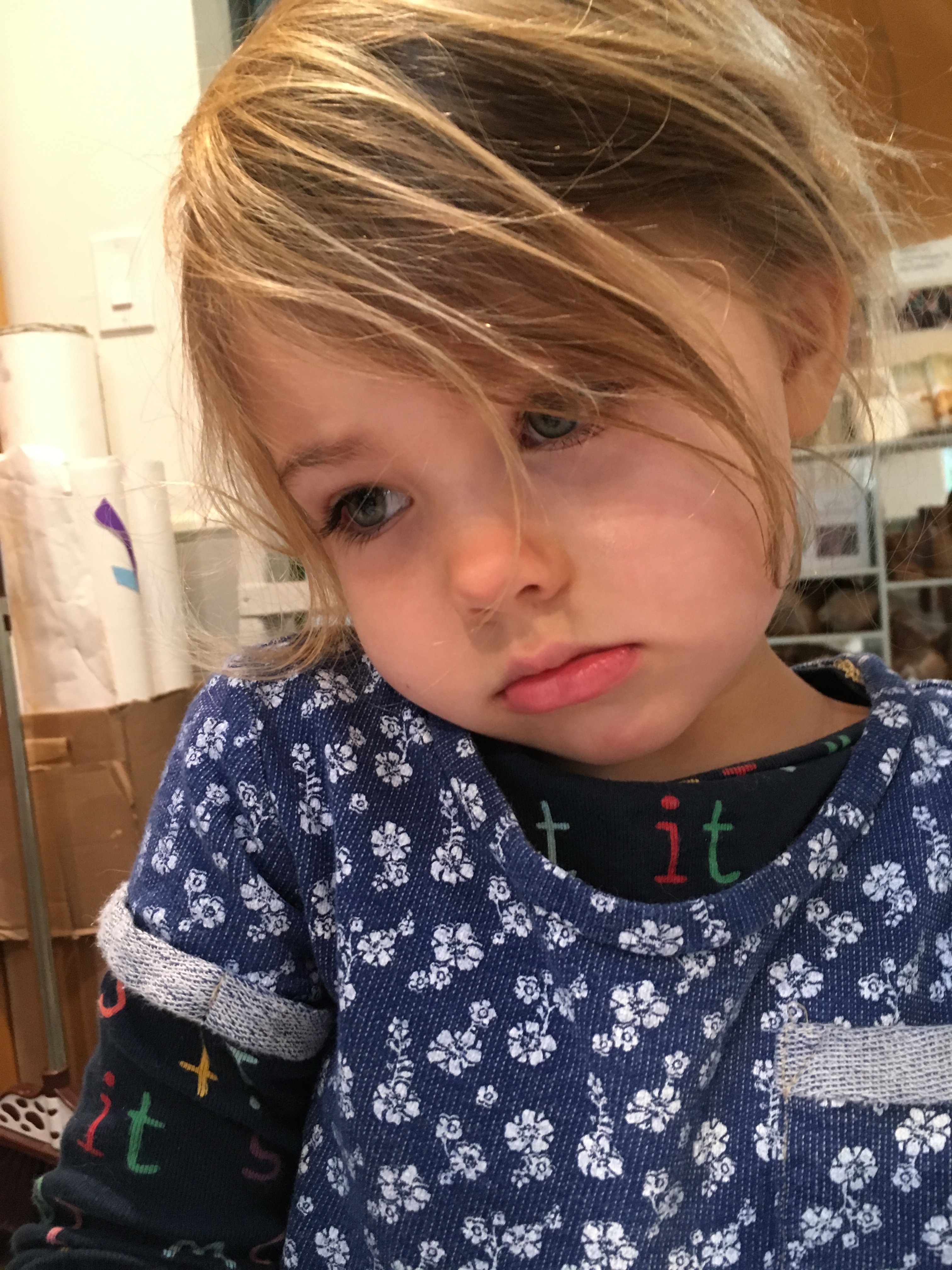 Everly looks in the mirror and tilts her head, furrows her eye brows, and draws her sad face. She wants to take a picture of her expression.