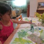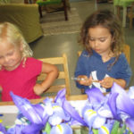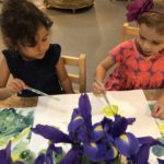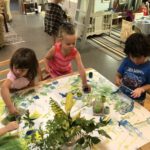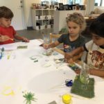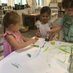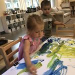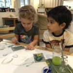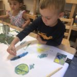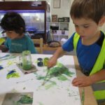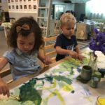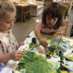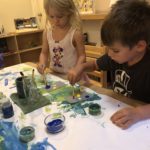 Materials like paint, paper, wire, clay and more are used in the Reggio approach as a vehicle of communication. So, when teachers propose questions like the one above, they are not looking for literal answers but layered meaning. In the beginning of the year, the teachers focused their year’s intention on creating a community from individuals meeting for the first time. The primary colors in this case, yellow and blue, stand for individual children. What happens when they play together? The colors create the secondary color, green. The children make connections to each other forming new relationships.