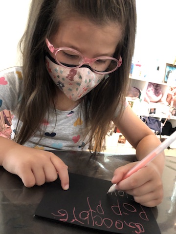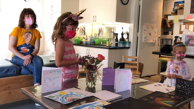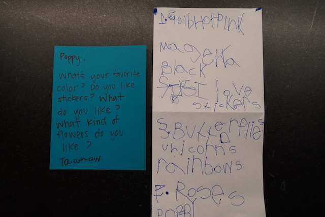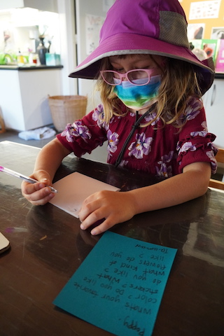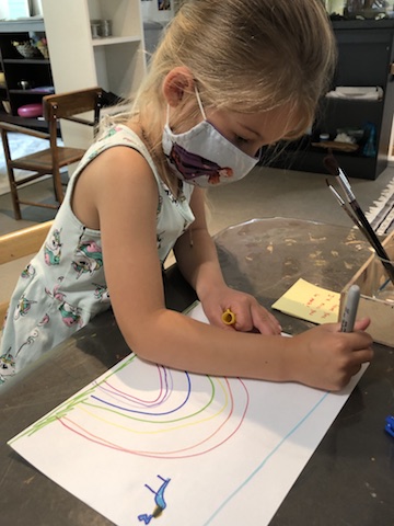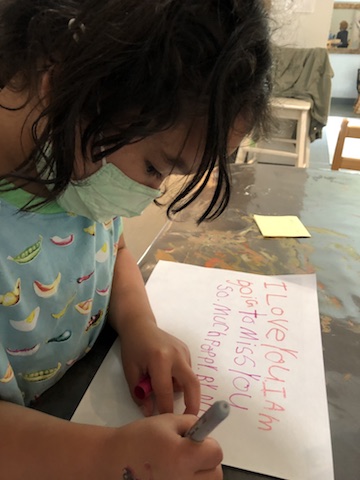 Mia: I hope you have a great time. I’ll miss you. I like making drawings of rainbows with you and working on the building space with you. I love you.