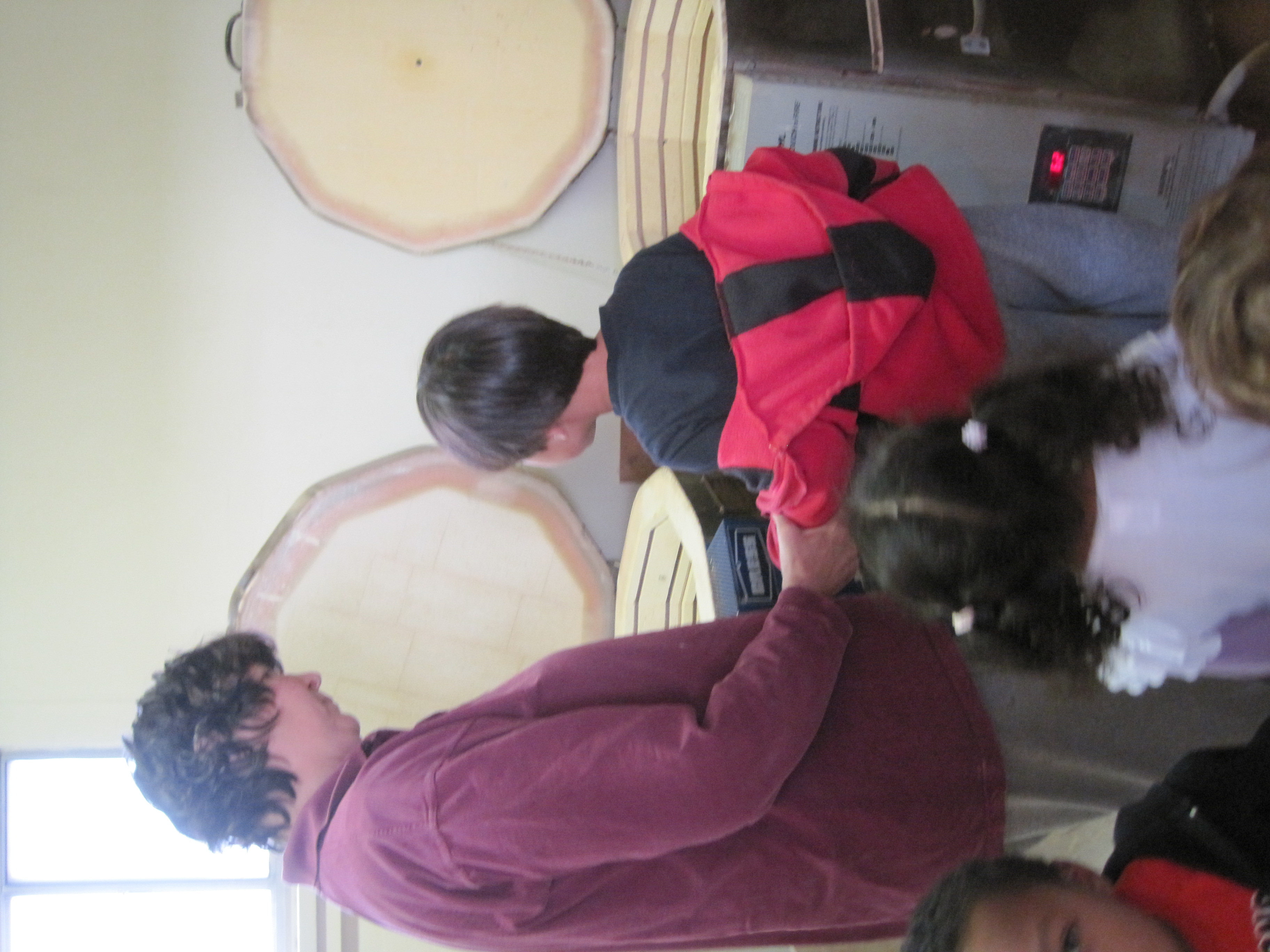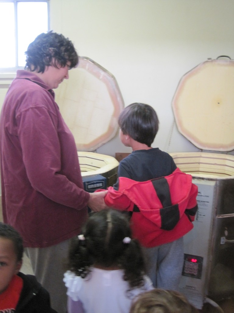 Linda took us into the kiln room to pick up our buttons and had all the children peek into an empty kiln.