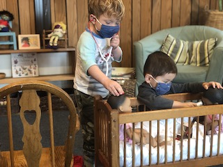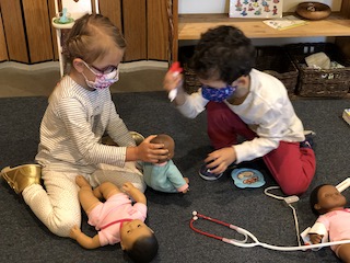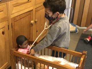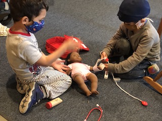 Doctor play is always popular in young children while they process the immunizations they are scheduled to take, get regular checkups, and visit when sick and hurt. In a year where so much of the adult conversation around them has to do with health and sickness — Covid19, tests, vaccines, germs, etc — it is no wonder that the children are exploring these topics through their dramatic play. Psychologists say,