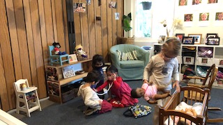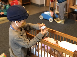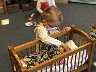 We can also see how emotionally connected these children are with one another and what comfort that those connections can bring. Their play with the babies, who are not necessarily “sick” but are “sad,” underscores that emotional feeling is just as important to take care of and nurture as physical feeling. We recognize the importance they give offering support and helping a friend feel better by holding their hand, checking in on them, and being there for them through tough emotions. It’s a beautiful look into the hearts of these children as they explore feelings of empathy, compassion, and caring for the babies as a “family,” bringing them closer in their relationships as a school group/community.