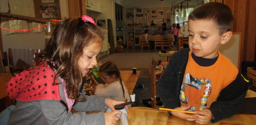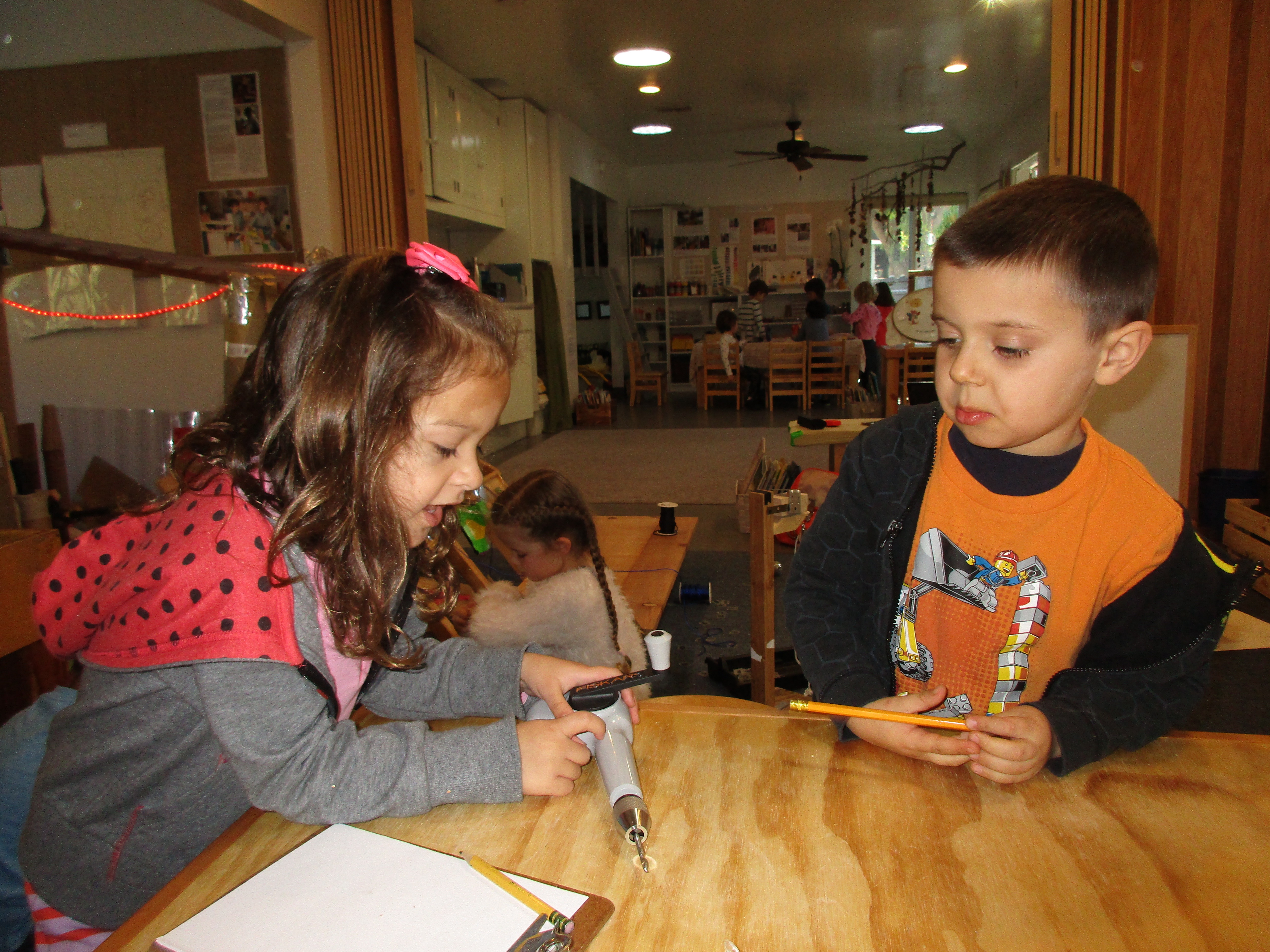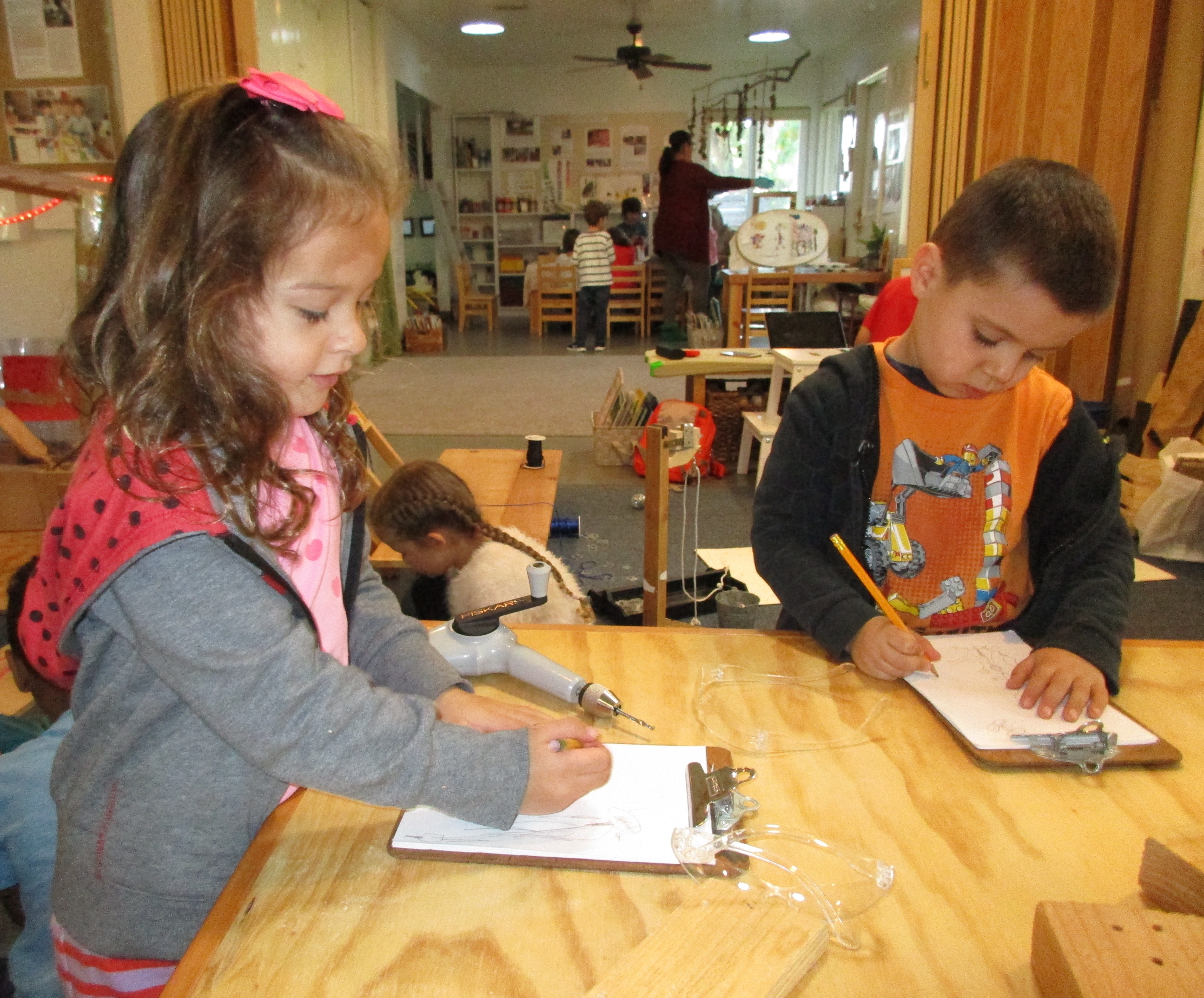 During a morning appointment, a group of children in the East Wing used a variety of woodworking tools to construct a balance scale. After an active morning of construction, most of the children were ready to transition to a different space. Eloise wished to continue and while she wielded the hand drill she asked, “How does that (drill bit) twist?” I asked her what she thought. After spending some time to ponder, she proposed a hypothesis: “I think there’s a little thing right here (pointing to the crank) that goes all the way down and makes these ones (chuck and drill bit) turn.” Noticing Eloise’s potential for clarifying her thinking through representation, I encouraged her to draw her idea.