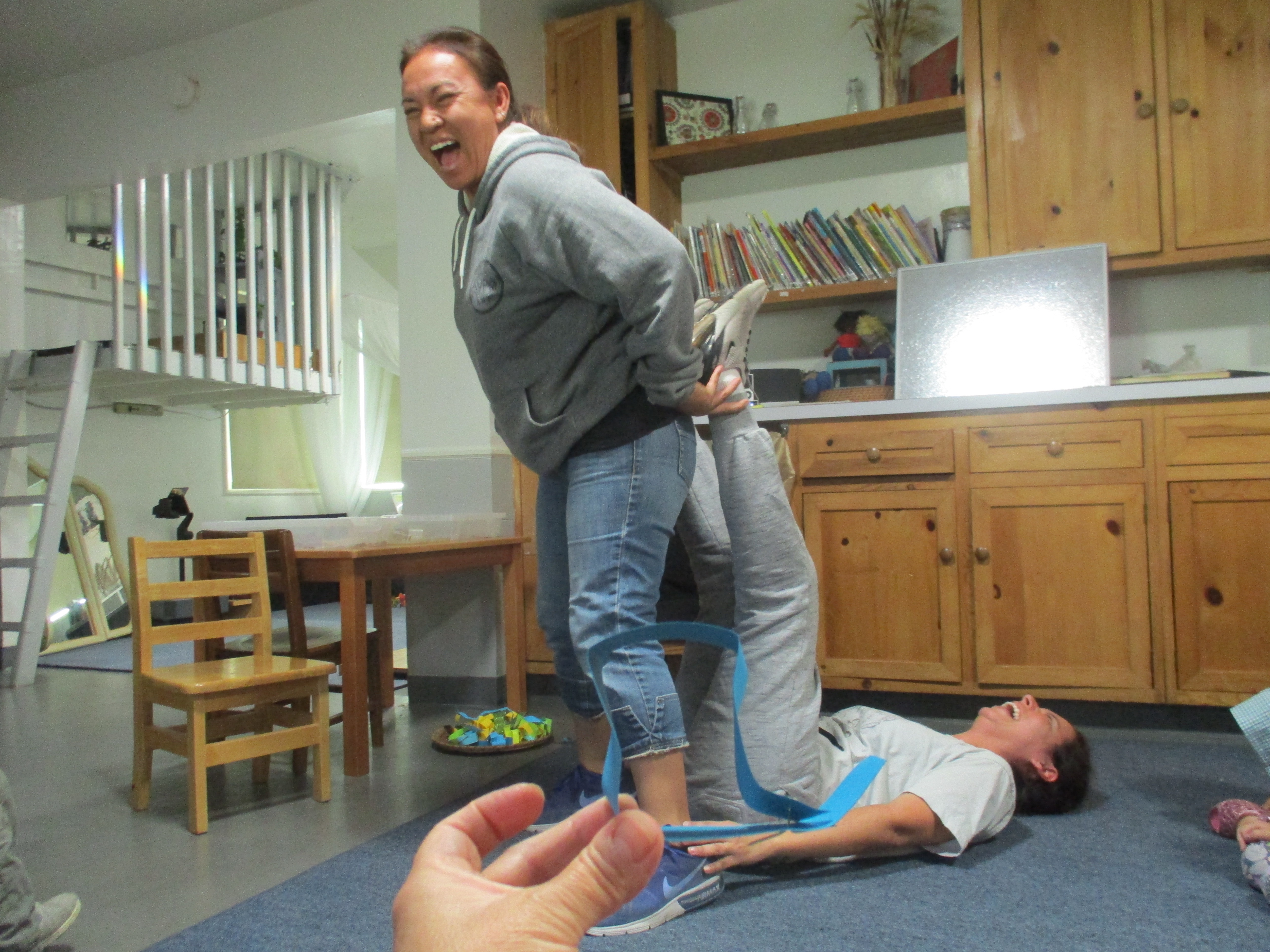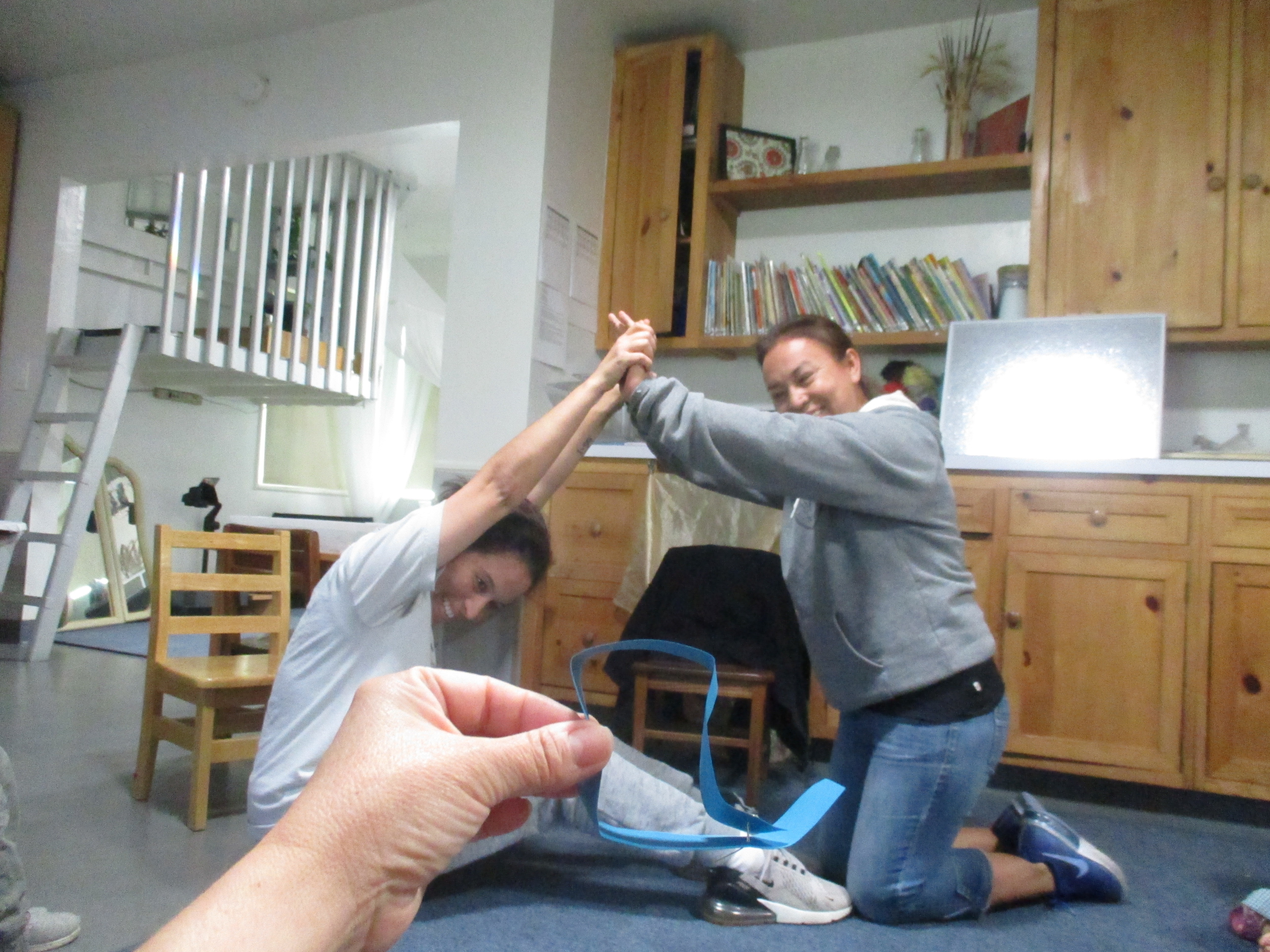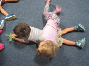 Jen strung the length of the paper connections, now pasted with friends pictures to depict who wanted to connect to whom, around the Communication Center walls and across the ceiling. She then brought the concept to the circle rug after learning that this group of children likes physical expression. They remember the paper connections and relate them to movements.