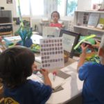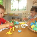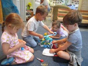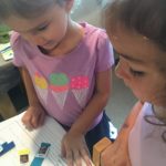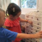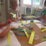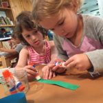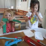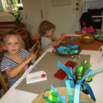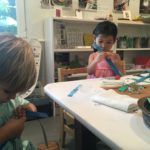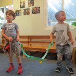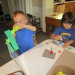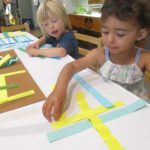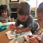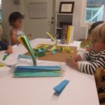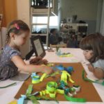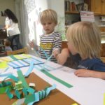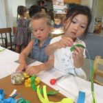 Luca left a message for the next group of children to work here: “Build Something New.”Teacher Flora: I wonder what new thing you will build?Diego, Ennio, and Finn concentrated on connecting pieces of paper strips together to make it “Longer, as tall as Ennio or Diego.”Mika who was observing first said (picking up a yellow paper strip): The Yellow isn’t connected. I want to make a crown for elephant (her lovie).Finn heard her and started adding decorations on the elephant. Mika looked at her and smiled (welcoming the idea). Then Diego and Ennio also started putting more decorations on the elephant. The four of them were connected at that moment by the same idea to decorate the elephant and in the end, they built something new together, a decoration for a lovie and a relationship as a group. -Teachers Jen, Flora, and Kristin