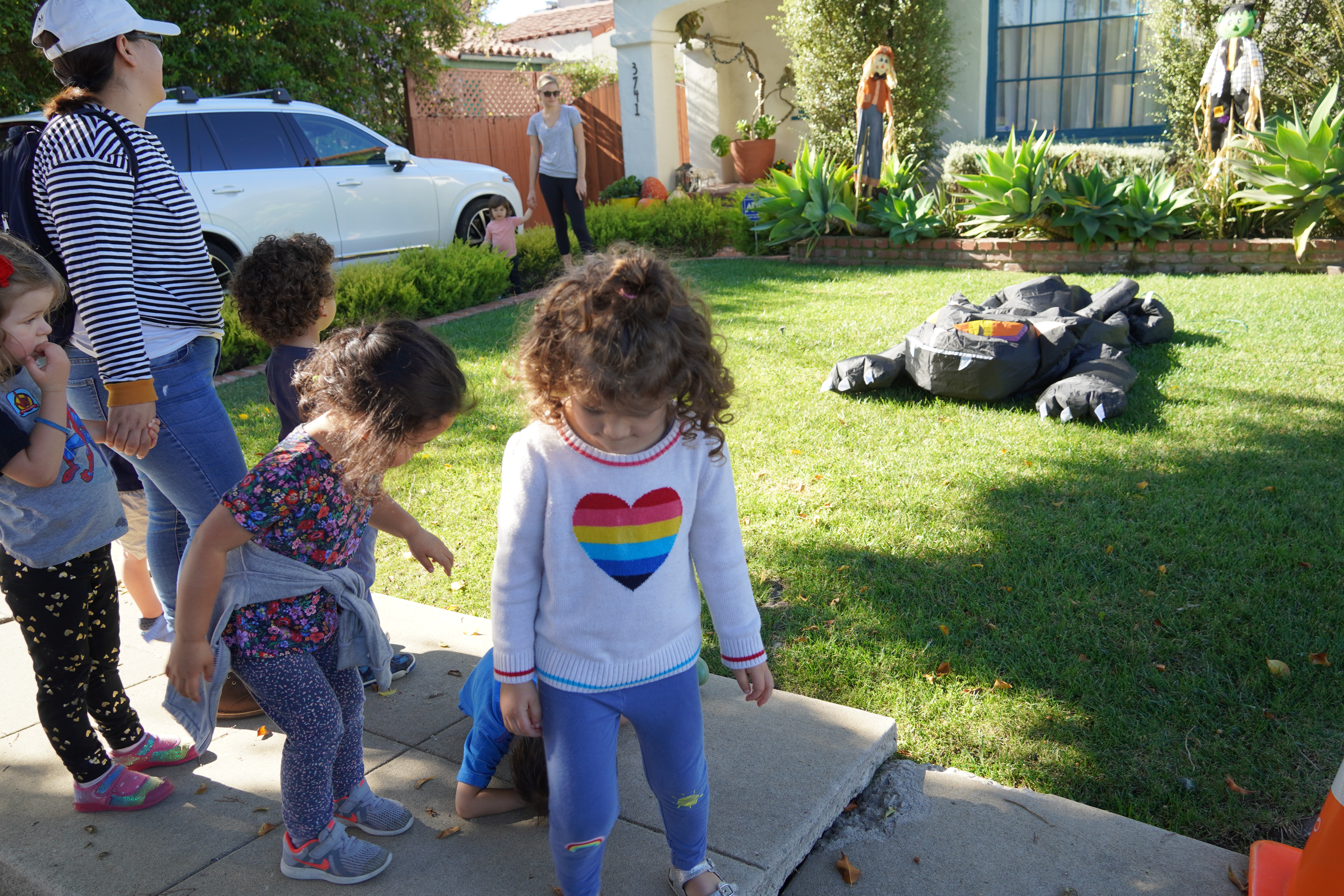 Our community walks are to develop a sense of place with our community and right now, because it’s halloween, we understand that our children need time to process their emotions about the changes present this holiday. When Poppy encountered her feelings, her peers immediately supported her by checking in and asking questions of the neighbor creating a more intimate moment to process emotions while we walk toward calm feelings together.
