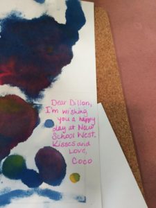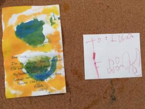 Together, the children have begun to write notes to each child in the West Wing. Their messages are closely linked to their mantra with welcoming themes like invitations to play dates and suggestions of spaces for appointments.