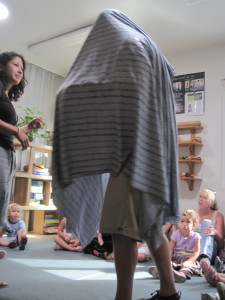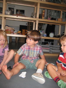 This sound exploration is a way for the children to notice and use their bodies as a tool for making sound, and also to practice in verbally descriptions of what they are hearing. At reflection meeting time, Sam asked the group what they enjoyed about their experience.