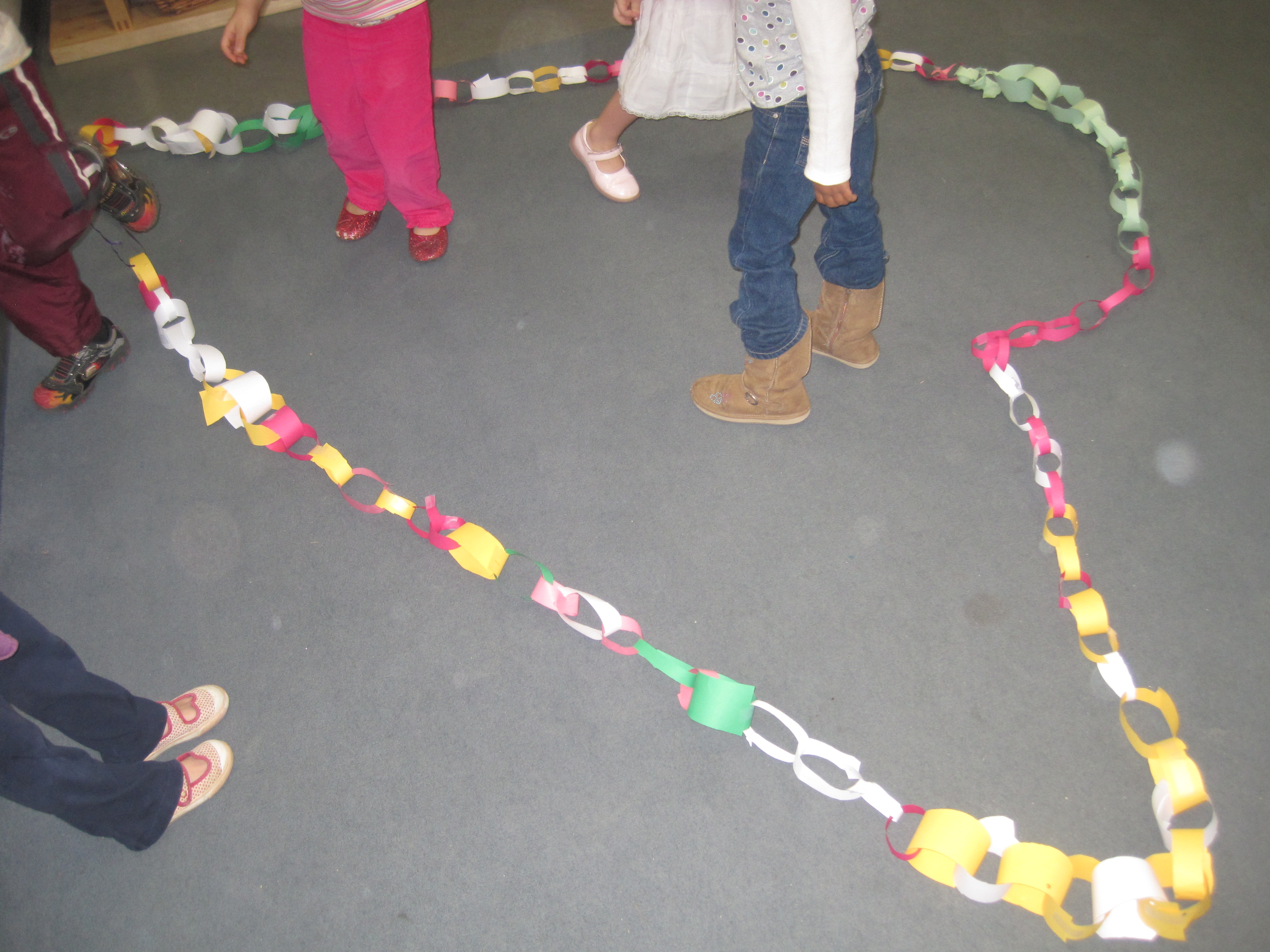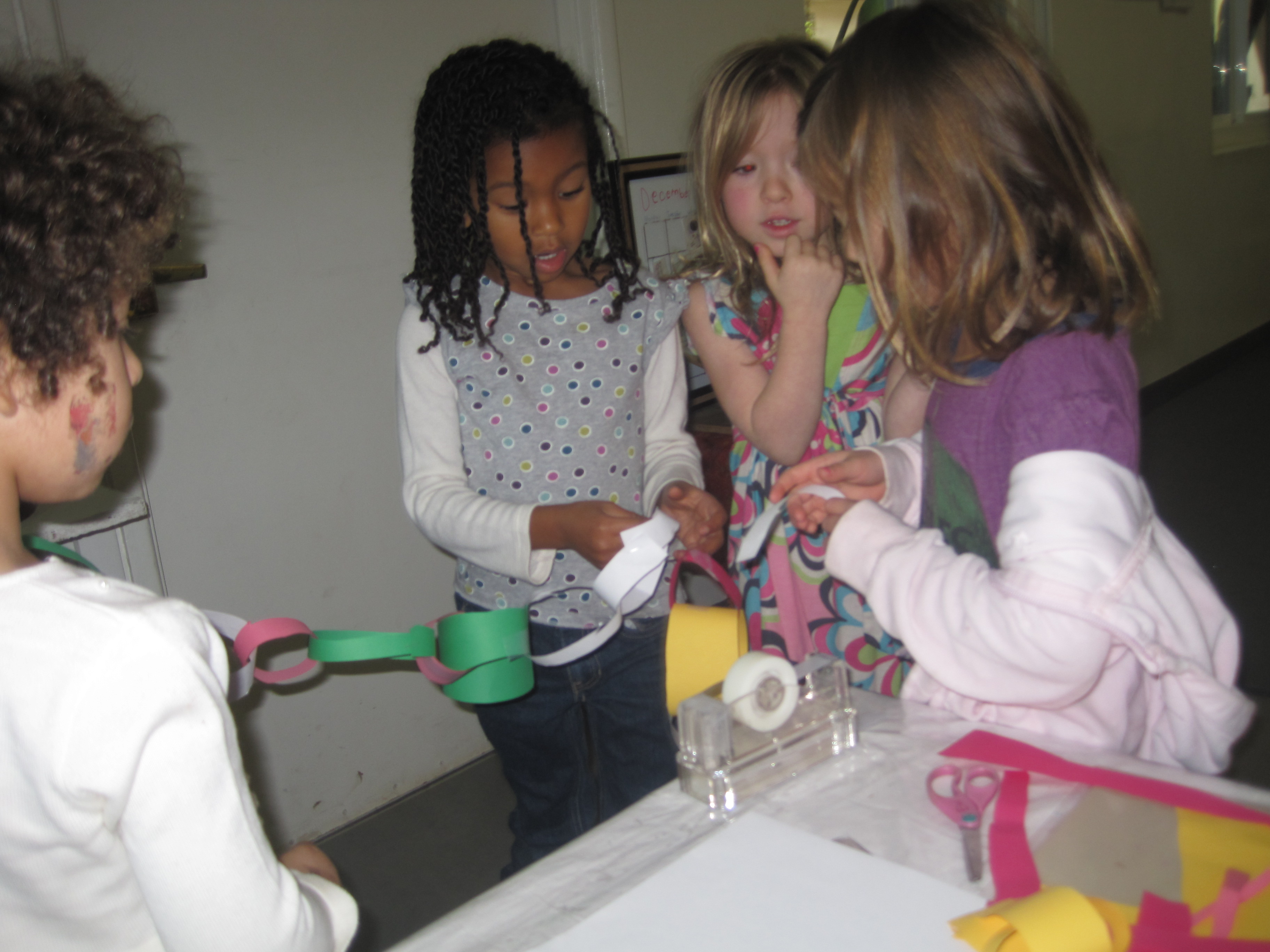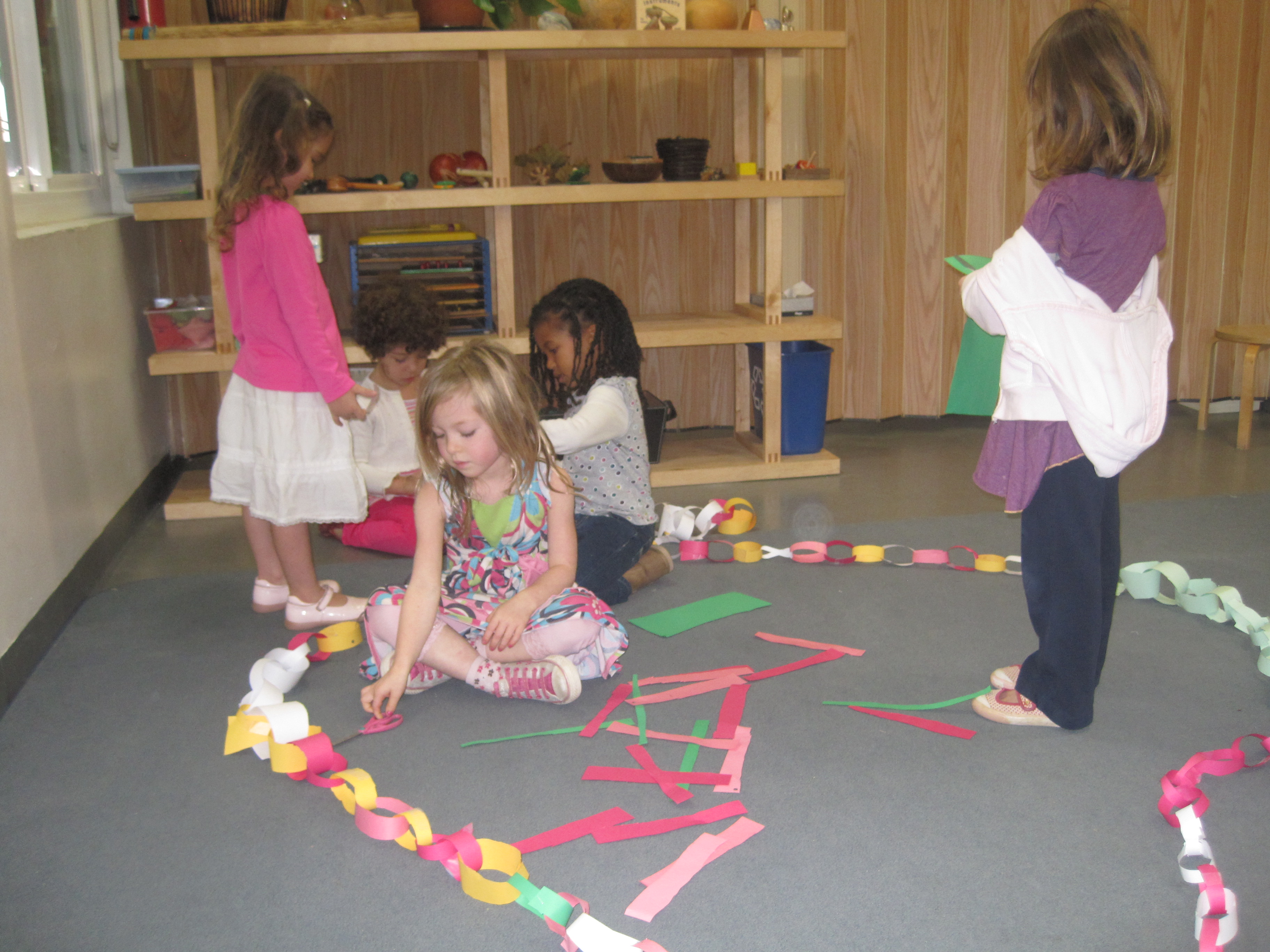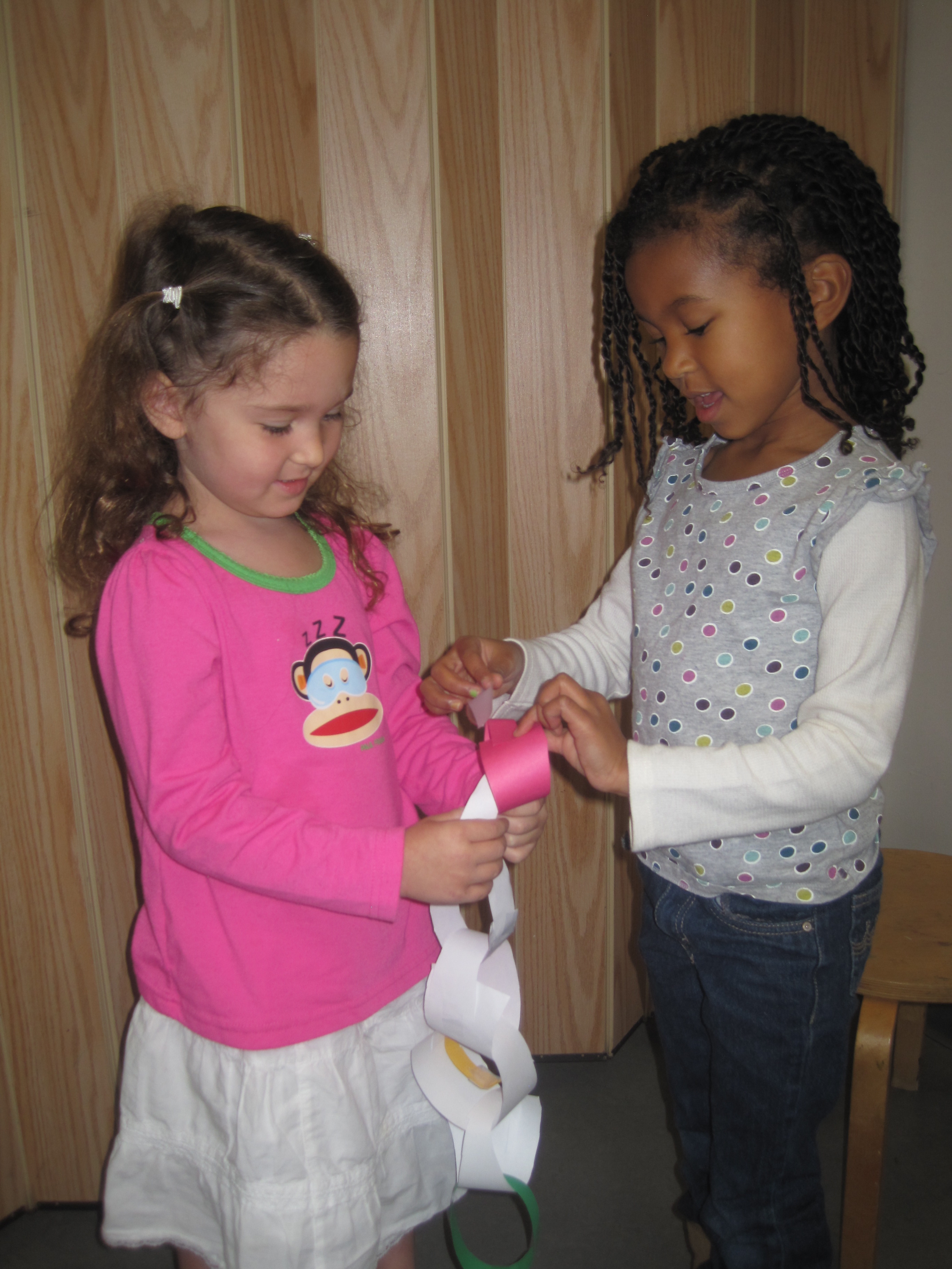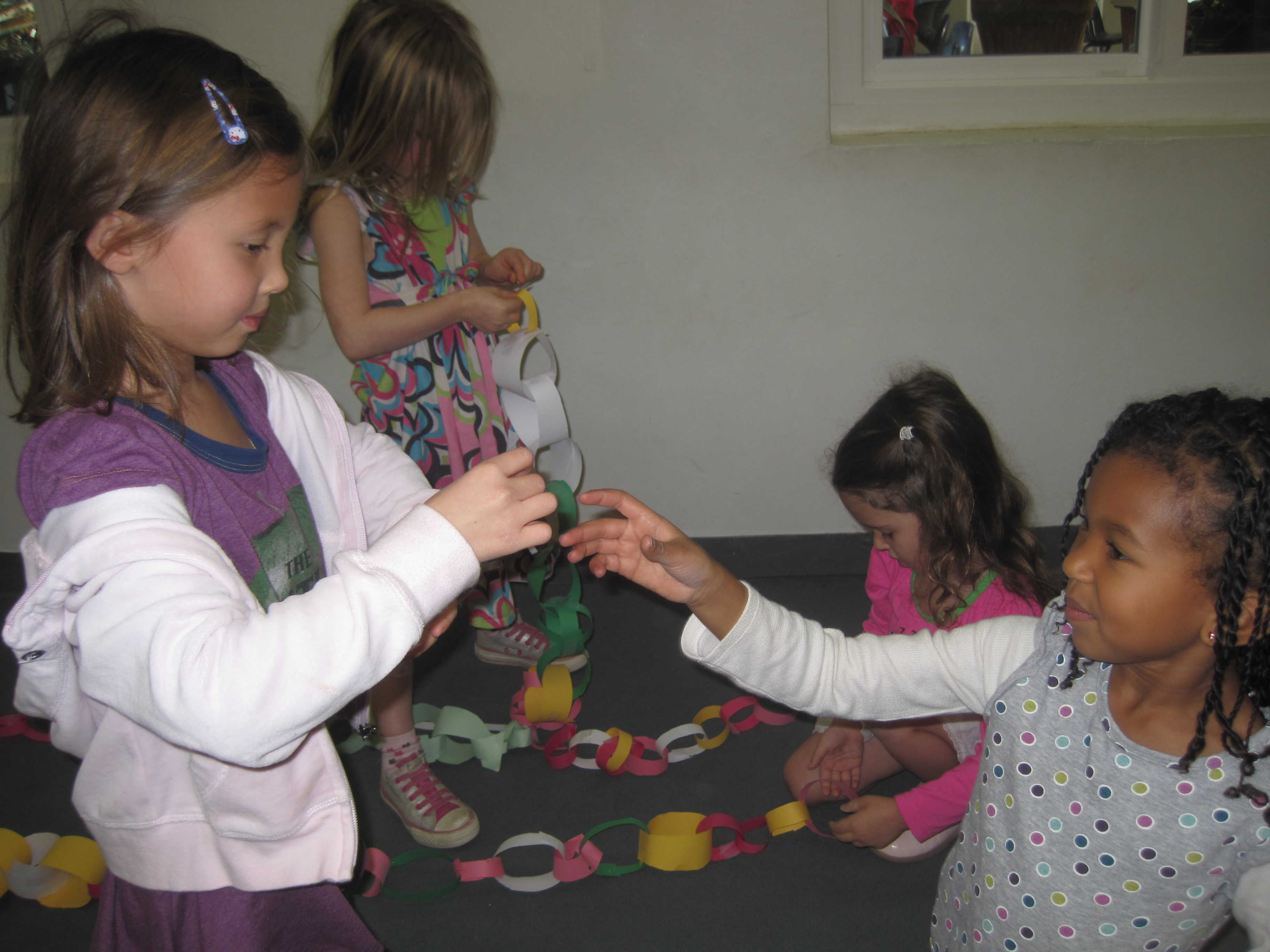 Jessica observed Cookie making a paper chain in the back patio this week: 12/7/10. Thinking the children would enjoy learning this skill, Jessica asked her to share it at the gathering circle in the East Wing.