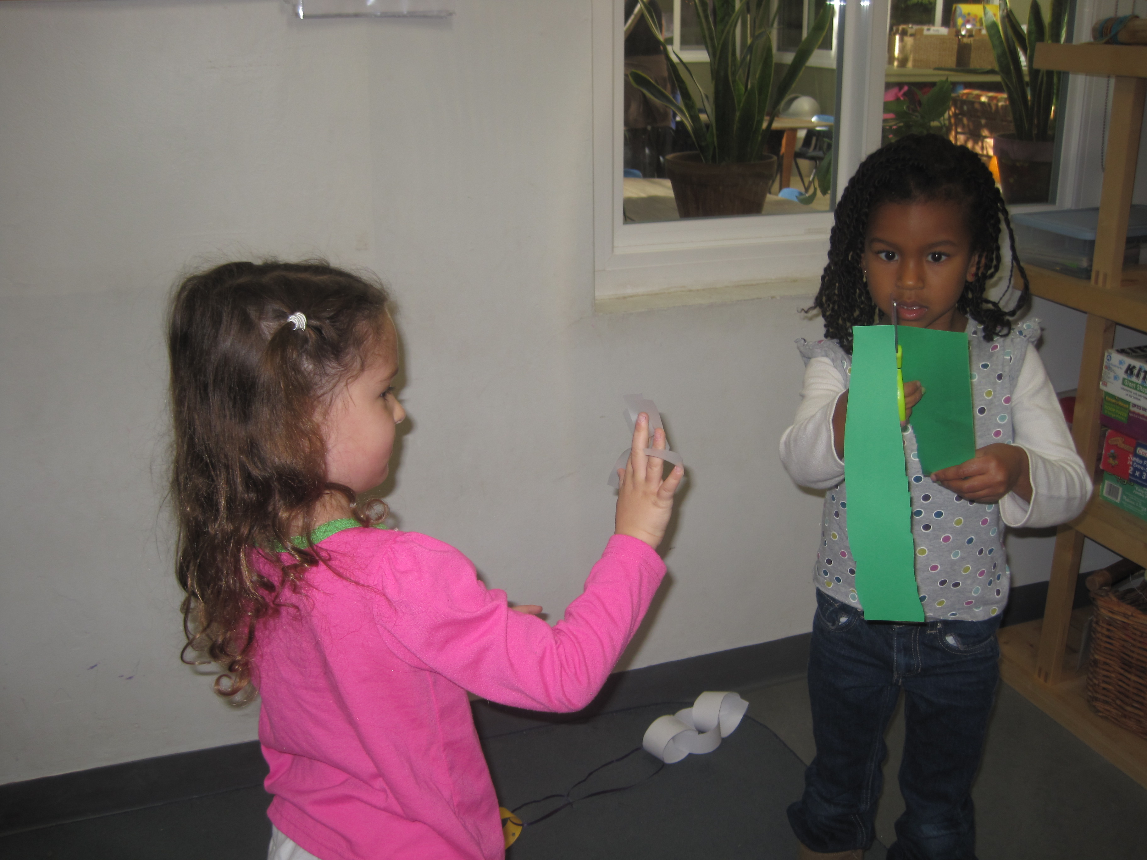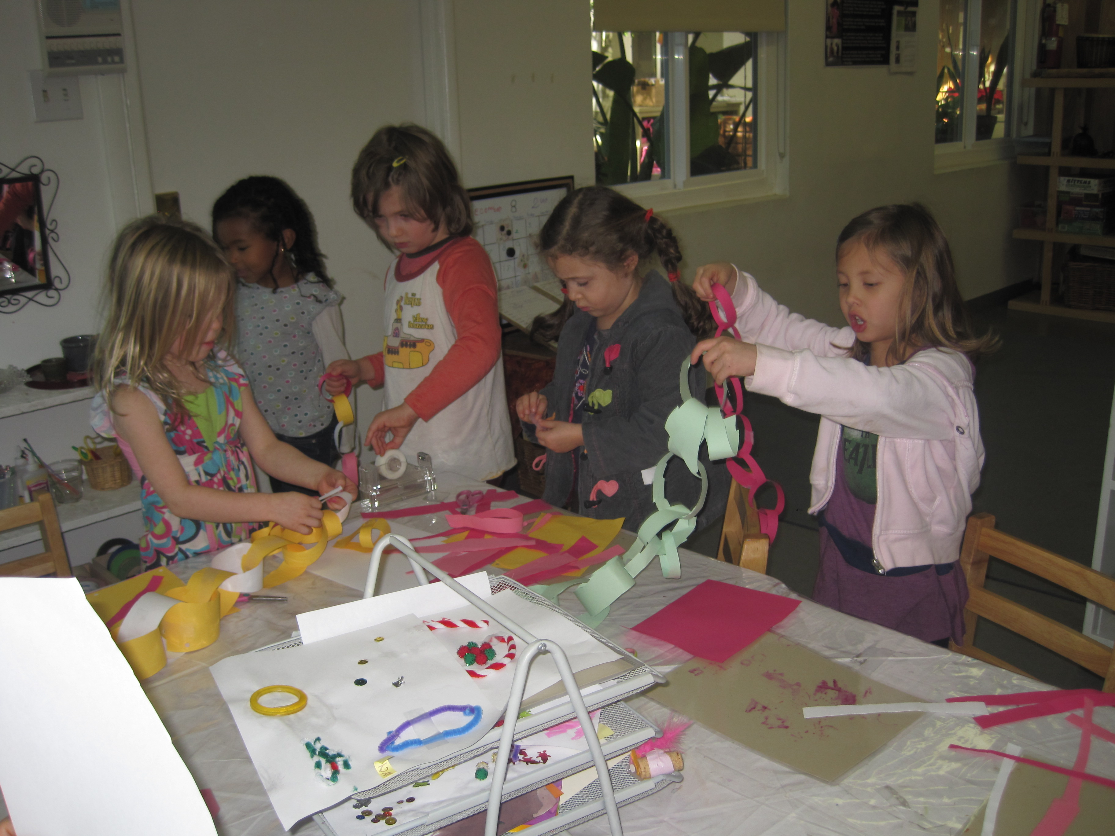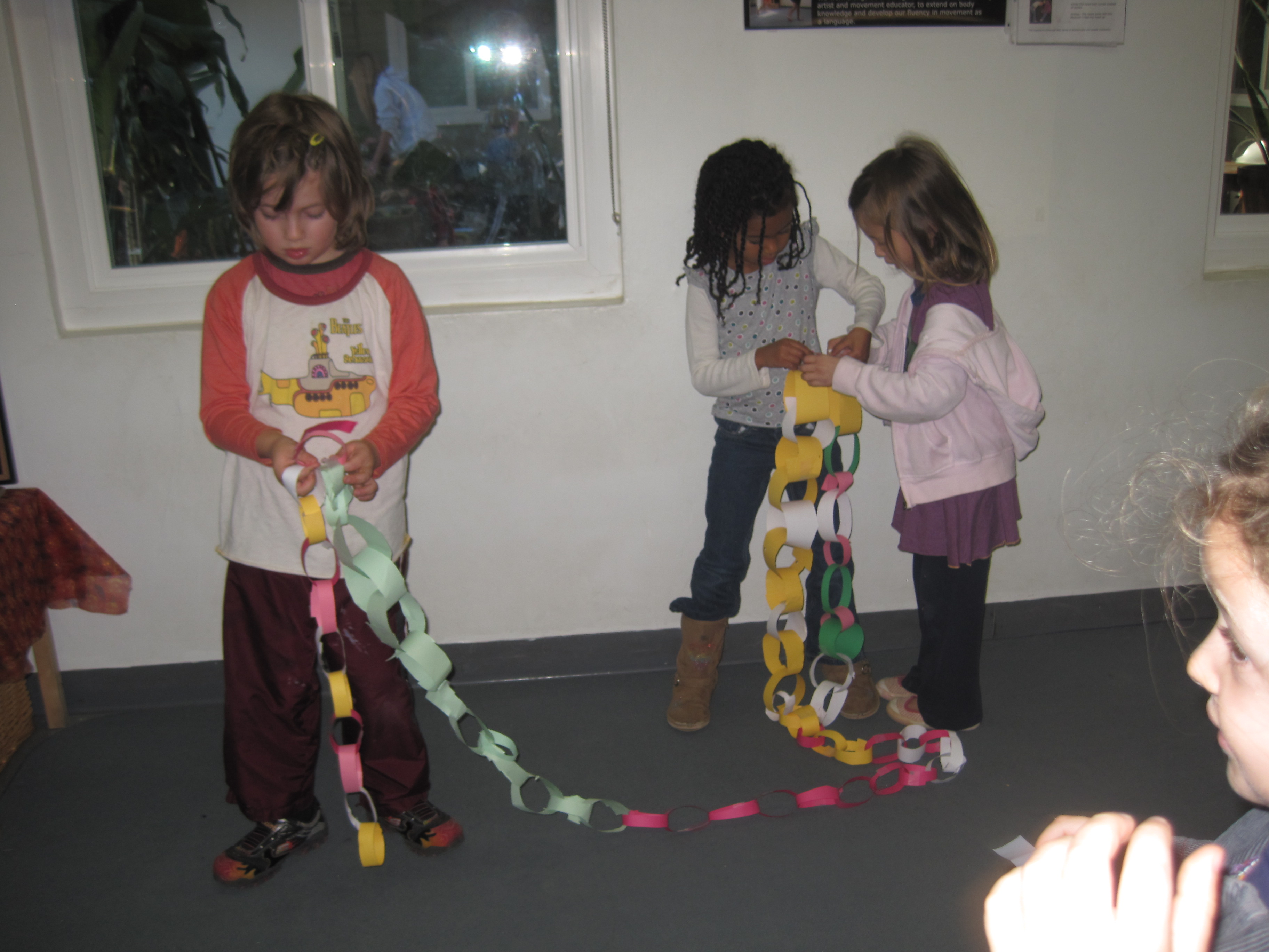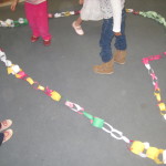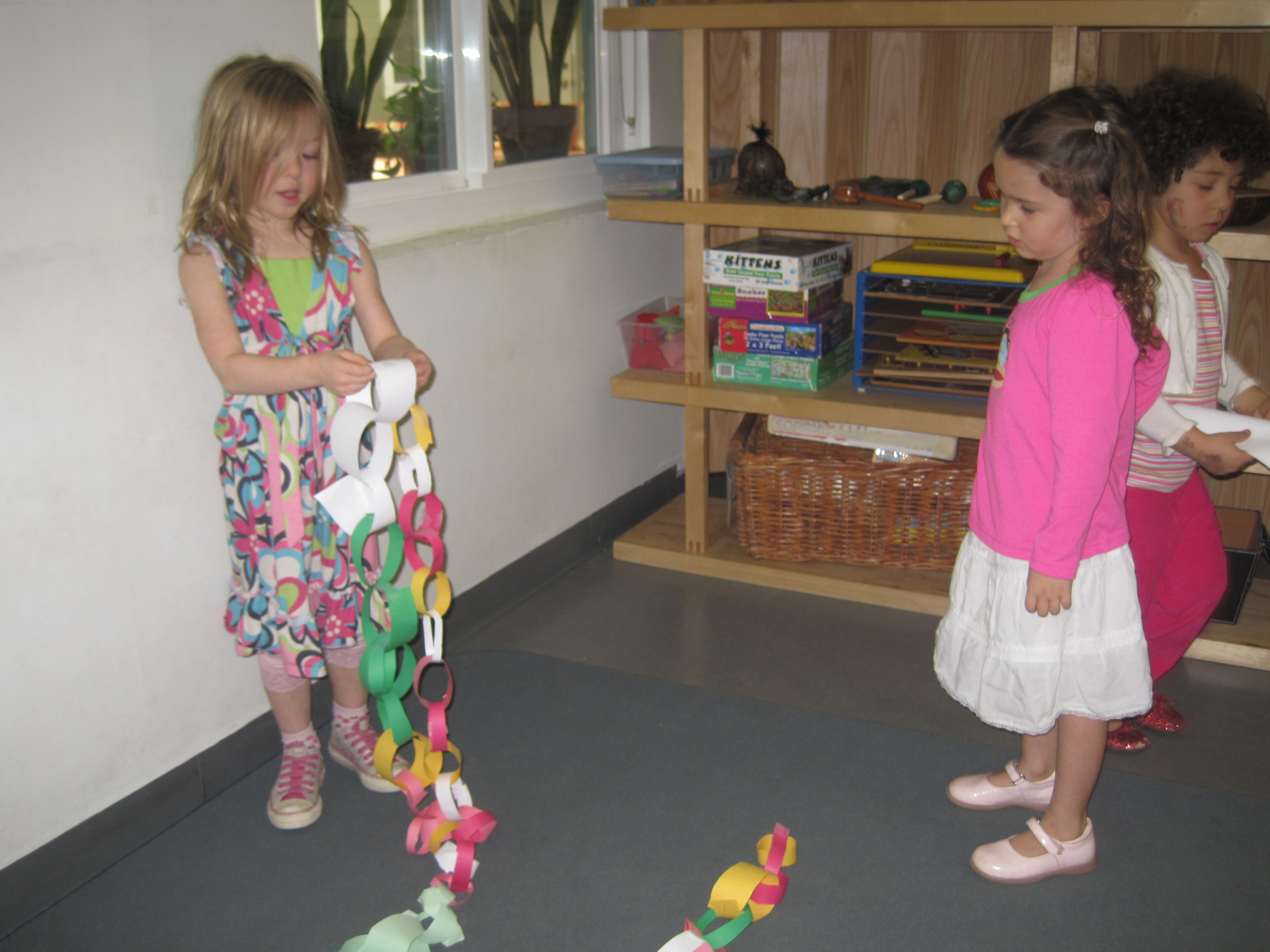 Jessica observed Cookie making a paper chain in the back patio this week: 12/7/10. Thinking the children would enjoy learning this skill, Jessica asked her to share it at the gathering circle in the East Wing.
