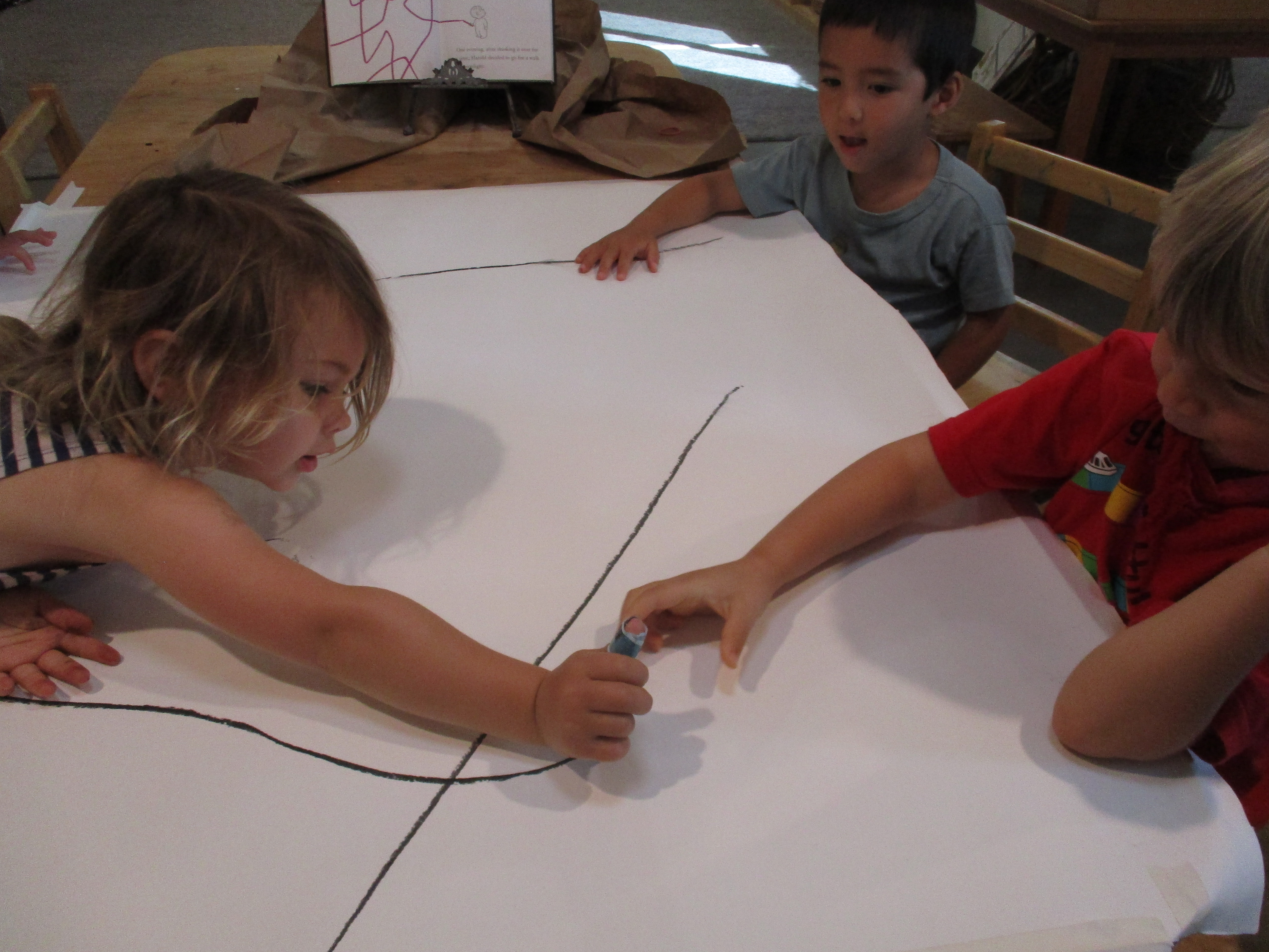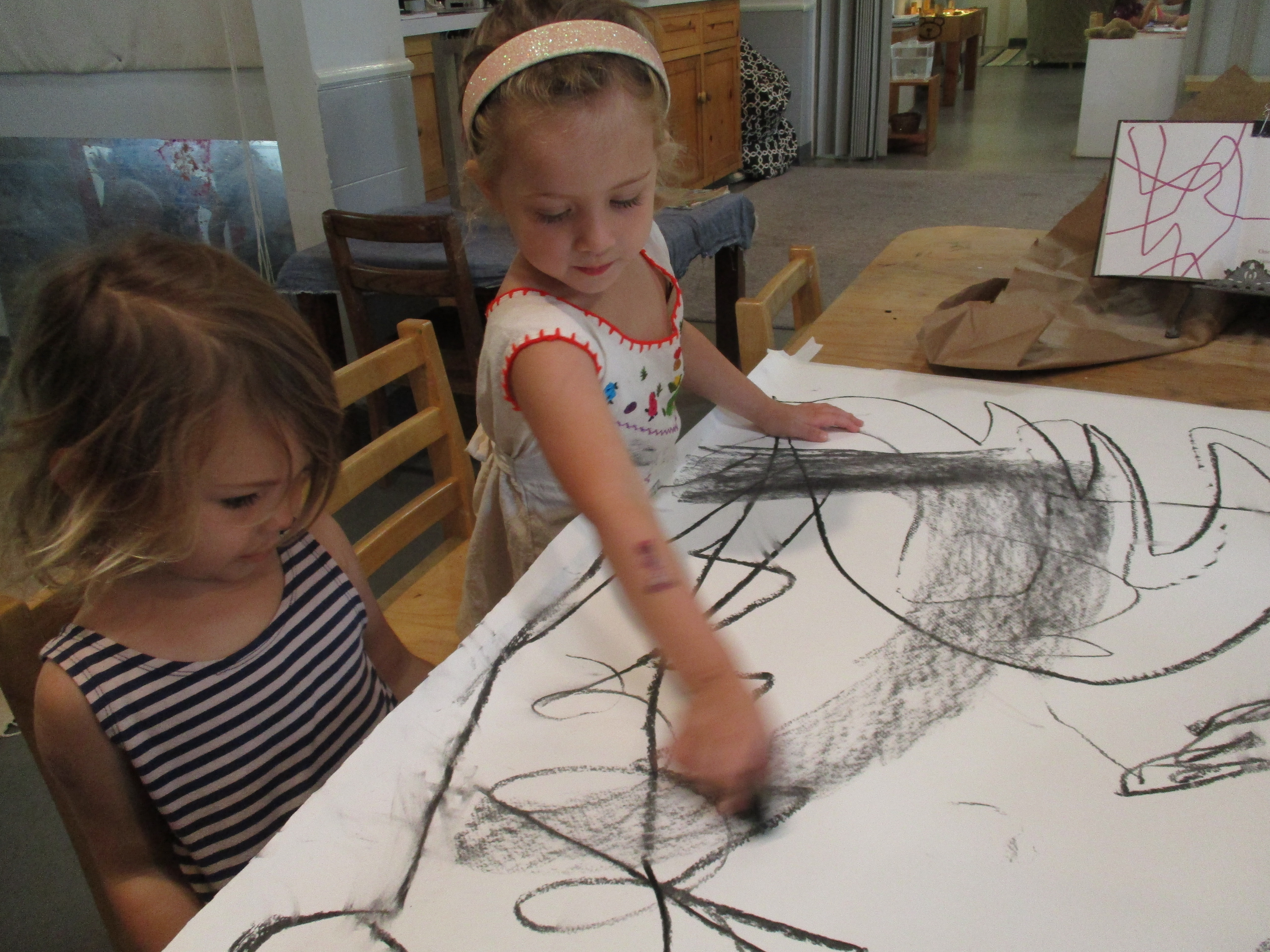 By engaging in turn taking with one piece of charcoal and having a shared experience on one large piece of paper, the children are better able to observe each other’s discoveries and techniques with the material and practice thinking of the work we do in the classroom as “ours” rather than “mine”.   Sharing discoveries and experiences means we will, in time, be able to share ideas and theories and allow the influence of others into our learning process.  –Studio Teacher, Amy