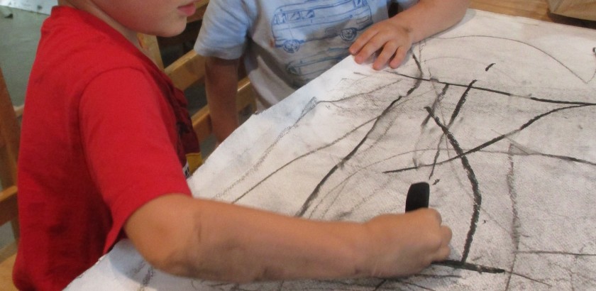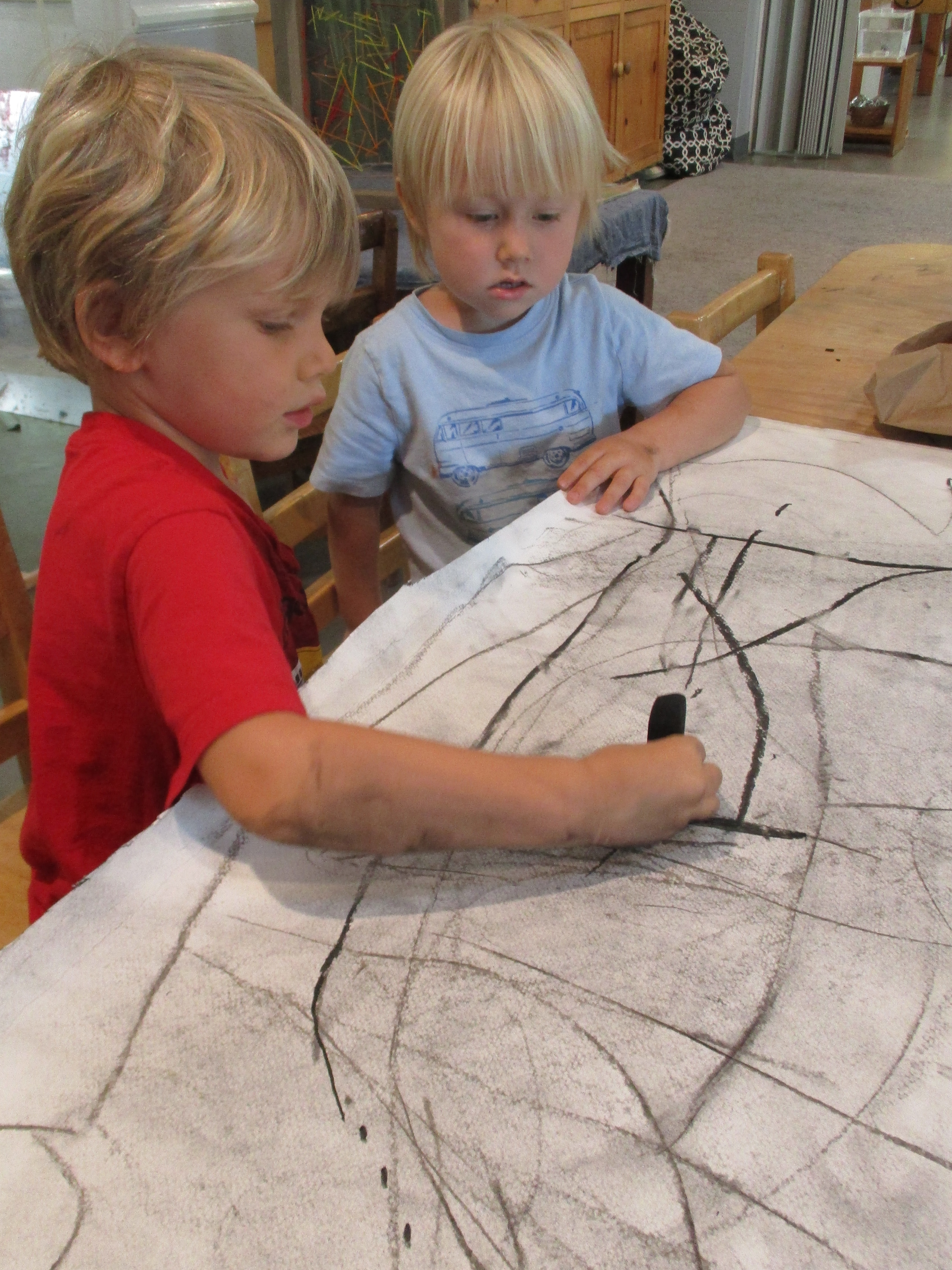 “Pass the line to a partner”.  With this simple and open ended invitation, a group of children sat down in the West Wing with charcoal and a large piece of paper to play a game.