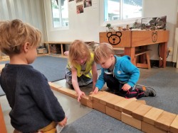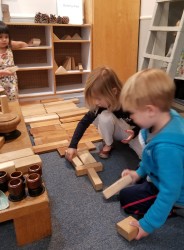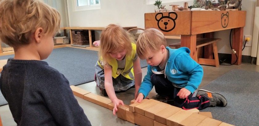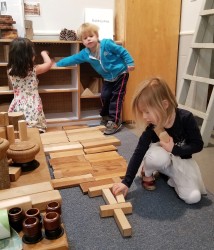 The West Wing Building Area is a space where children have opportunities to collaborate. Sometimes these experiences begin with a common idea and other times children begin with individual ideas and are challenged to figure out ways to connect with the group. During a morning appointment, Coco begins to create a sidewalk next to the platform as Crosby and Estelle work together to build a tunnel nearby while Harrison observes.