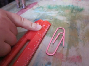 Asha noticed a pink paperclip and starts putting it on the horse – showing estimation skills of size and proportion. Yoli took this cue and introduced a ruler.