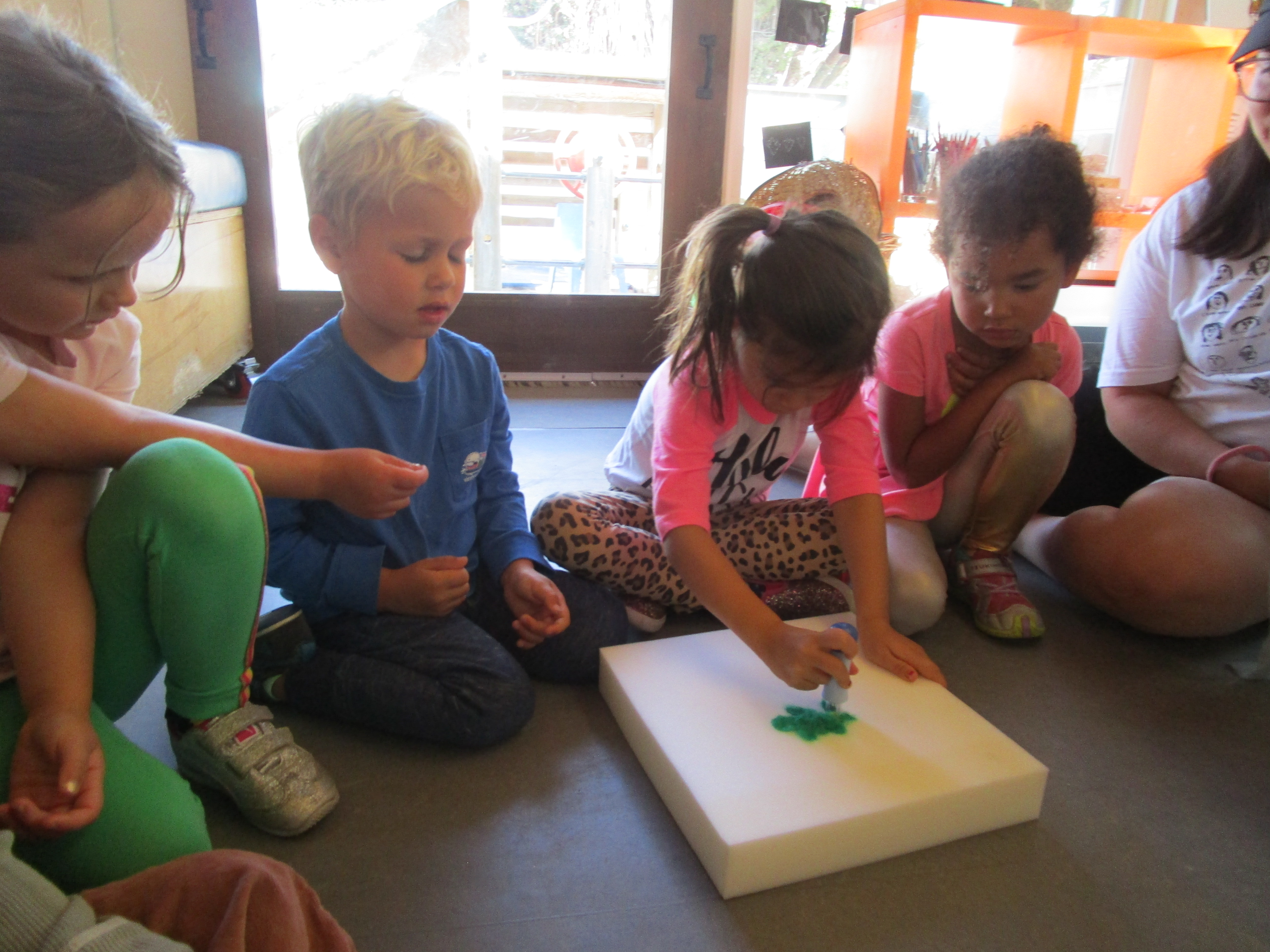 Though the initial intention was to introduce needle felting as a way to bring a new medium to this texture-loving group as well as to bring in a ‘prickly’ tool, I was soon reminded of the importance of working together on a common piece. What stood out was the fluid pace at which this group worked on a common idea that incorporated the skills of sharing ideas verbally as well as listening to another’s point of view. More significantly, I was reminded of the importance that collaboration plays in initial introductions. Witnessing this group pass a single paper around may not have been the case if each child was given a single foam on which to work. This canvas will ultimately challenge the East Wing in their relationships as they negotiate placement, story, and materials and we anticipate being just as captivated by the journey as they are with the subject. Cindy