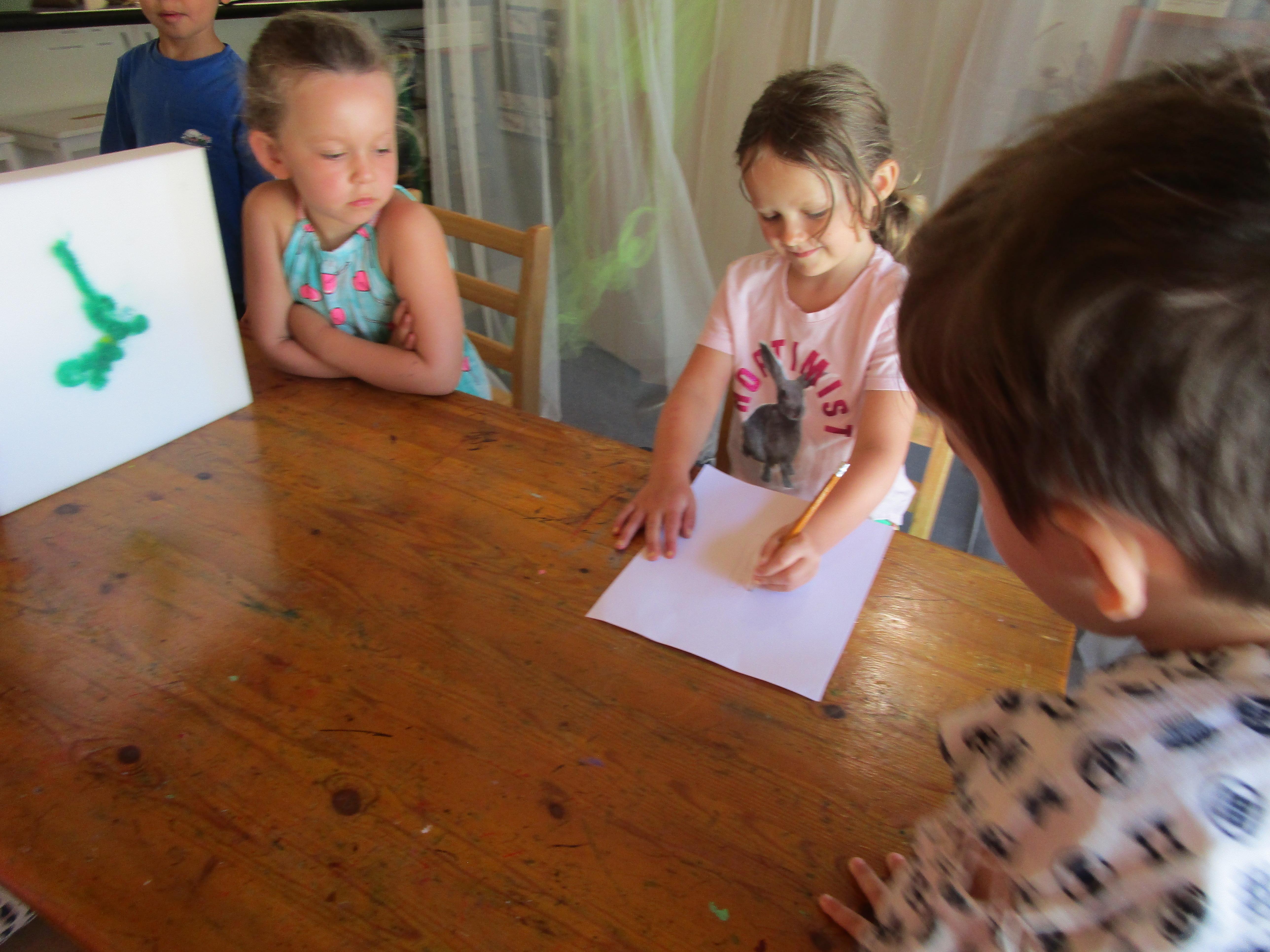 The group becomes engaged and continues passing the single paper around the table and each child watches while another adds an idea. Together they watched a cacti scene emerge. The group discussed the possibilities of how to share the work and I introduced the idea of transferring the images onto a larger canvas. This would allow for all the ideas and add the opportunity for other children to join in. We made a plan to meet again to work on the transfer.