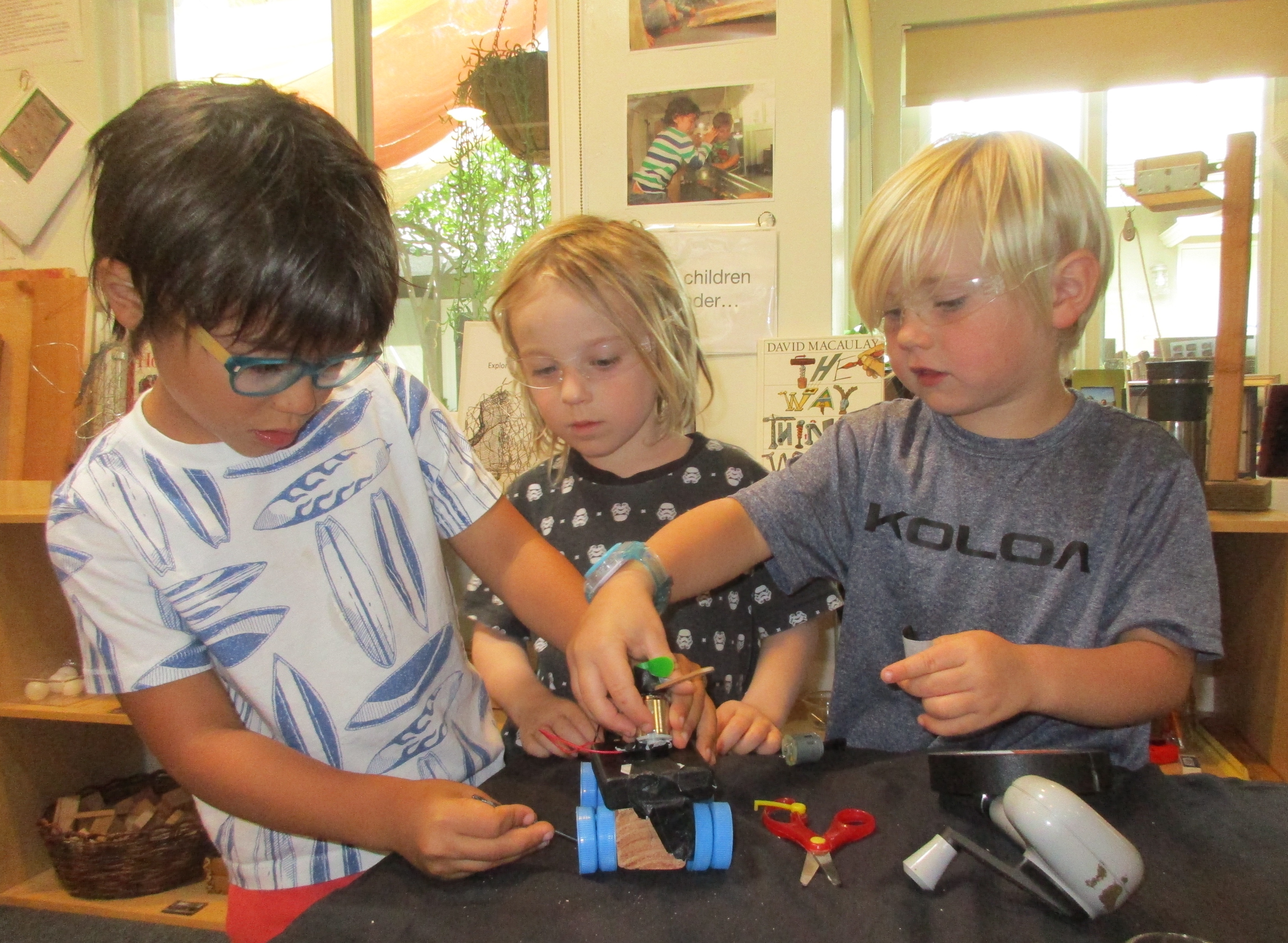 Last year, the current East Wing children investigated how motion, force, and incline interacted in their racetracks and boobytraps. As they tested race cars, they noticed how easily they moved down the ramps yet struggled to move up varying slopes. During reflection meeting, they described the obstacle they encountered. The discussion with peers elicited feedback which generated the idea of using a battery-operated car. Valuing the suggestion, we began to explore circuits.  This year, the children are building upon their knowledge of woodworking and circuits to construct a functional motorized car.