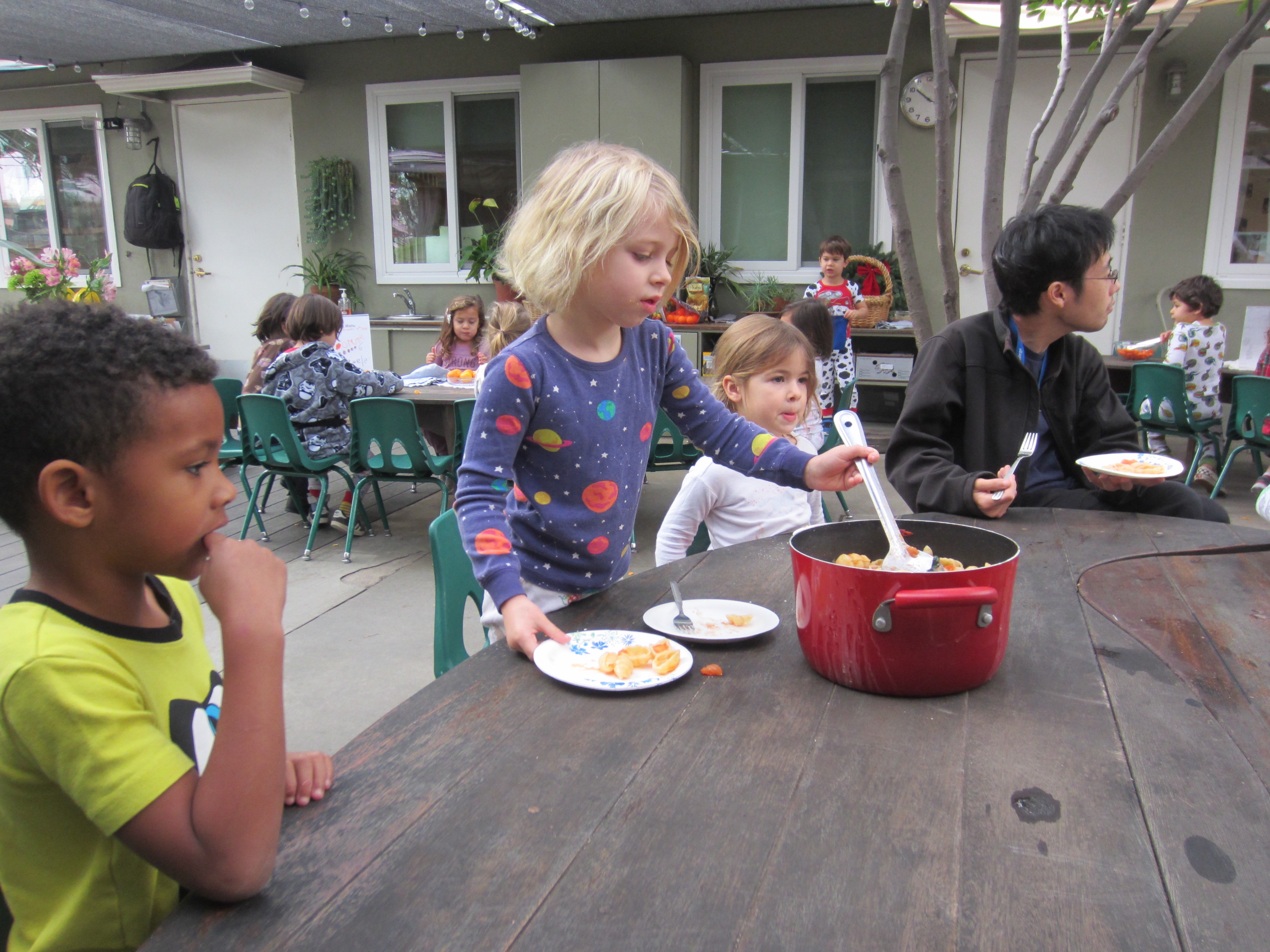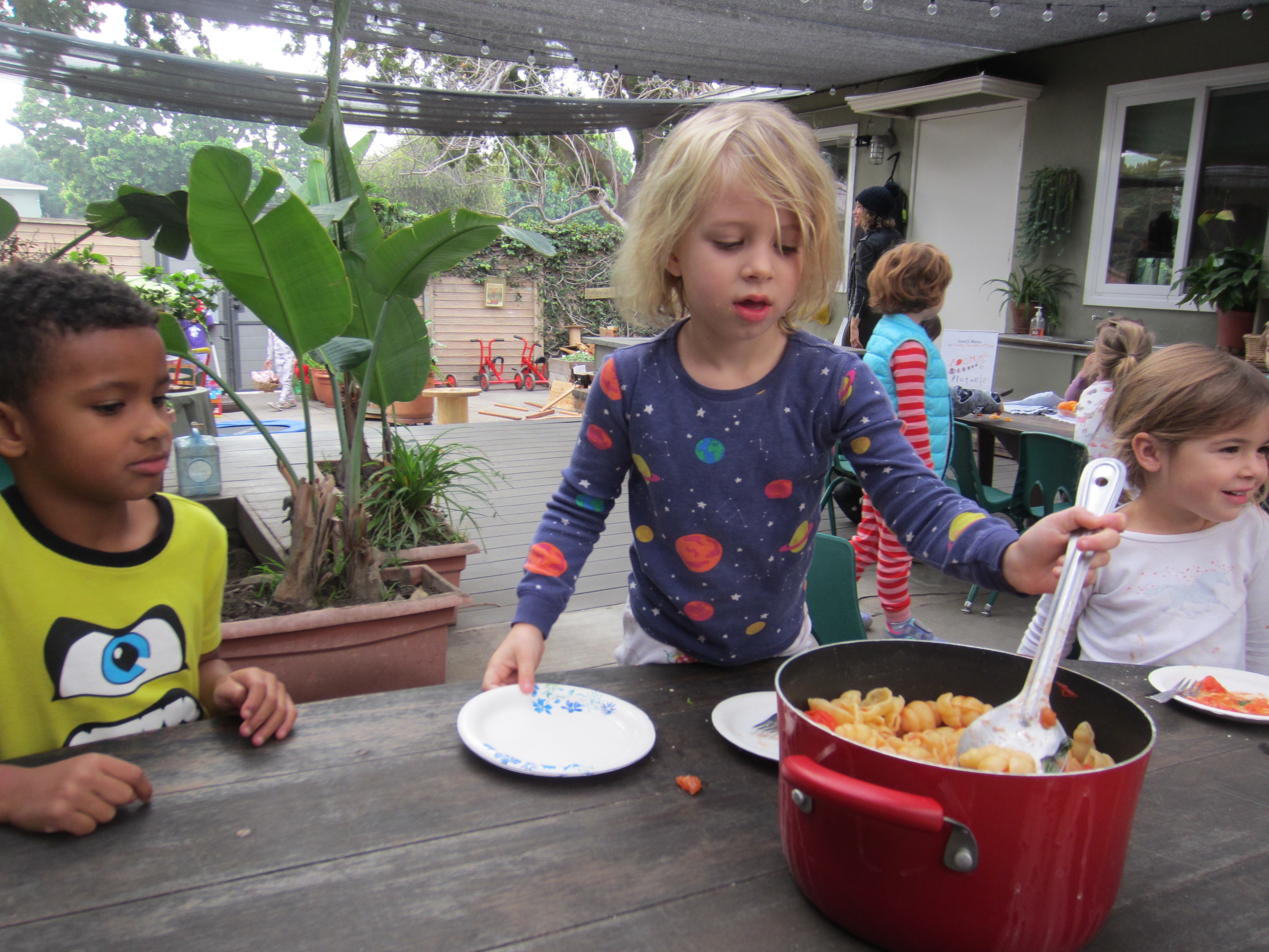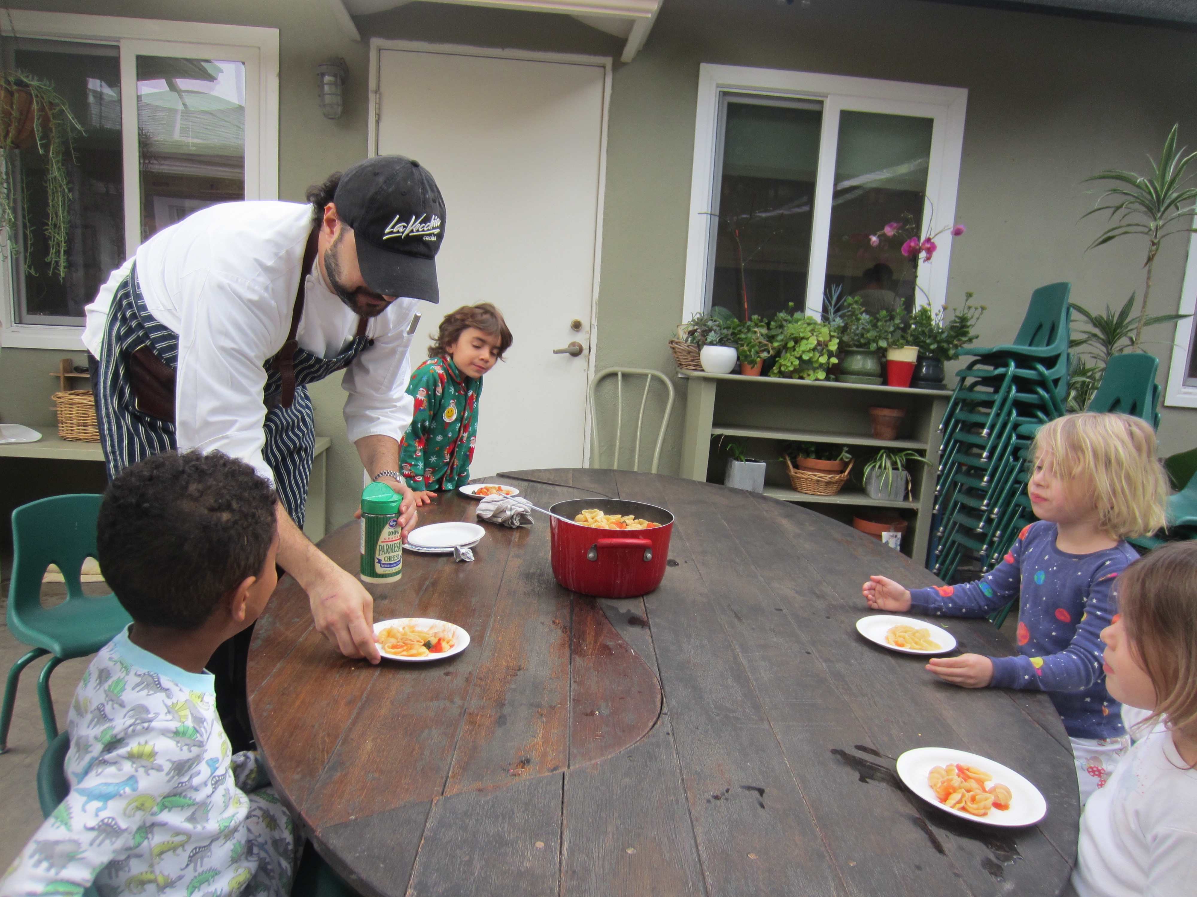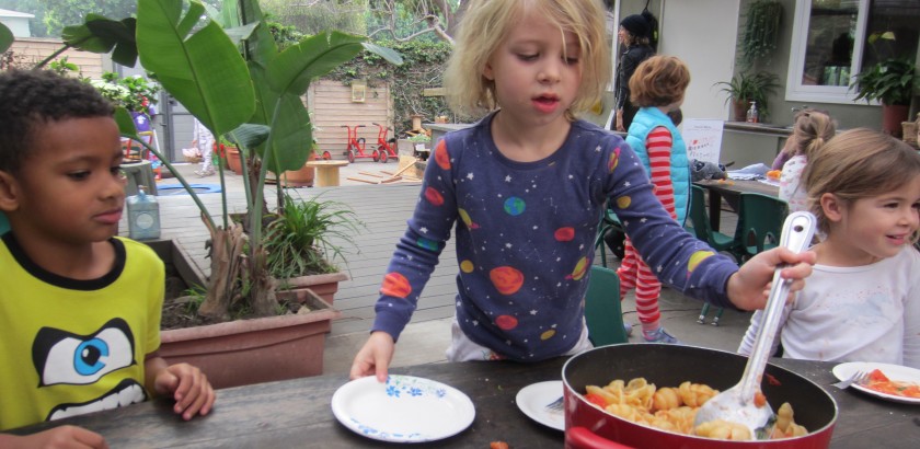 A boisterous crew assisted Mark Mollica (Luca, EW) with making pasta for snack today. Miles, Sammy, Lucy and Luca chopped, boiled and served a delicious basil, garlic, tomato pasta.
