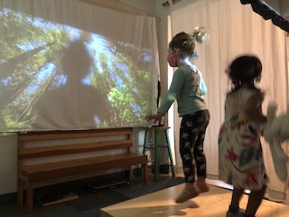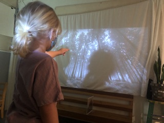 The Dandelion teachers, Flora, Evelyn, and Dana, were inspired by the East Wing’s play with transparency both literally (the free flow of light around our environment) and metaphorically (the open exchange of ideas within our community). We set up a provocation of light and shadow in the classroom’s Exploration Room. We turned on a video projector, aimed its light toward a sheet on the wall, and then we invited small groups of children inside. It became an accessible, fully immersive experience where both onlookers and active players were able to create shadows simply by joining the space.