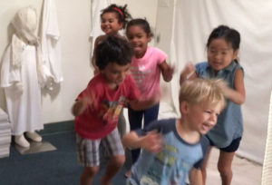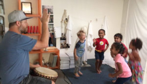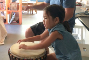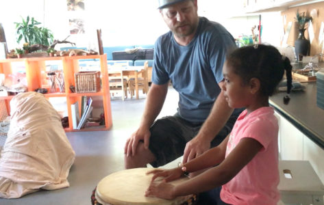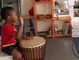 Jacob taps the djembe very lightly and the others lay down, pretending to sleep. He increases the tempo and volume and the children jump up with a shriek of delight and begin wild dancing. He returns to the gentle tapping and, again, the children pretend to sleep.