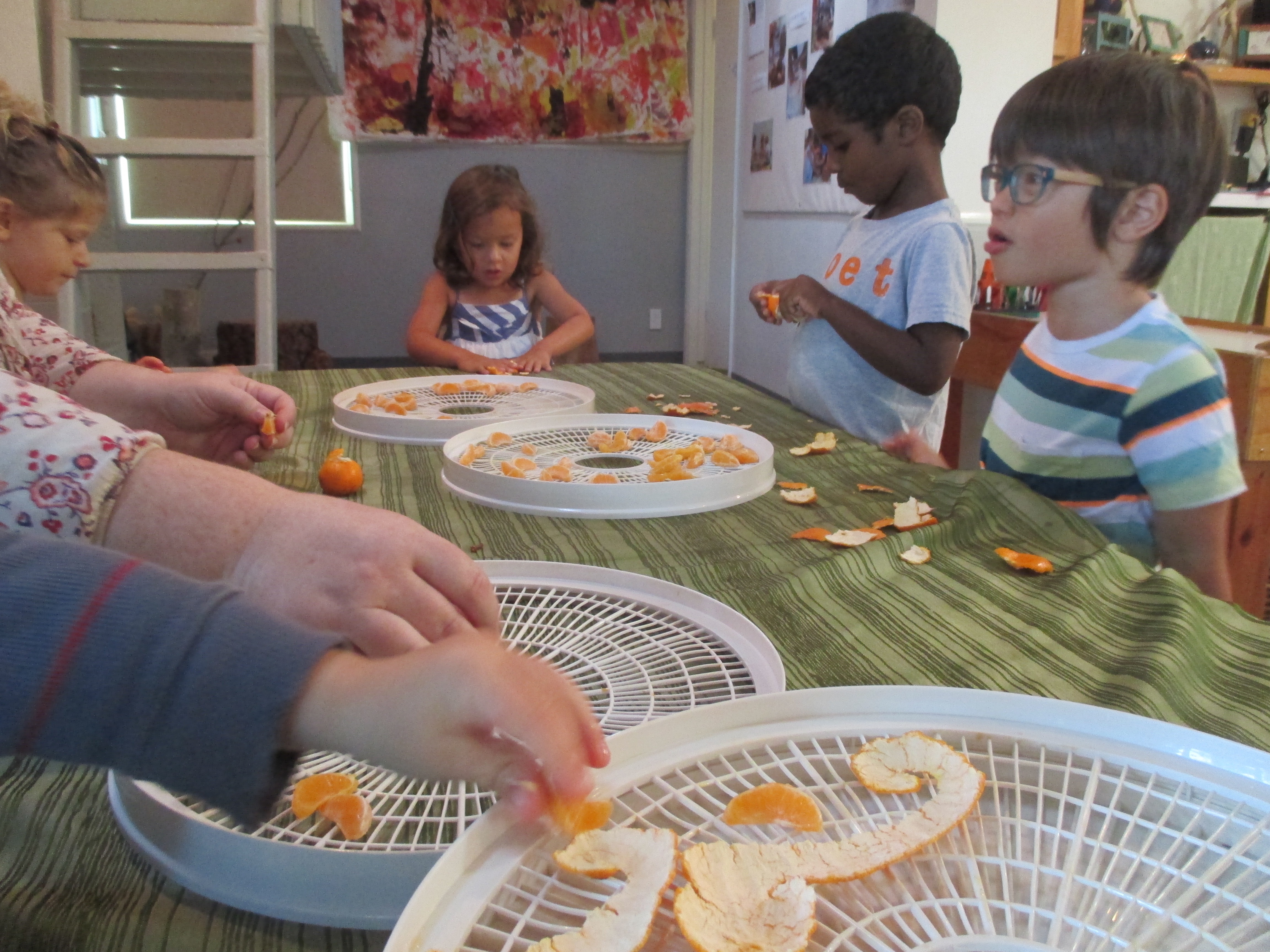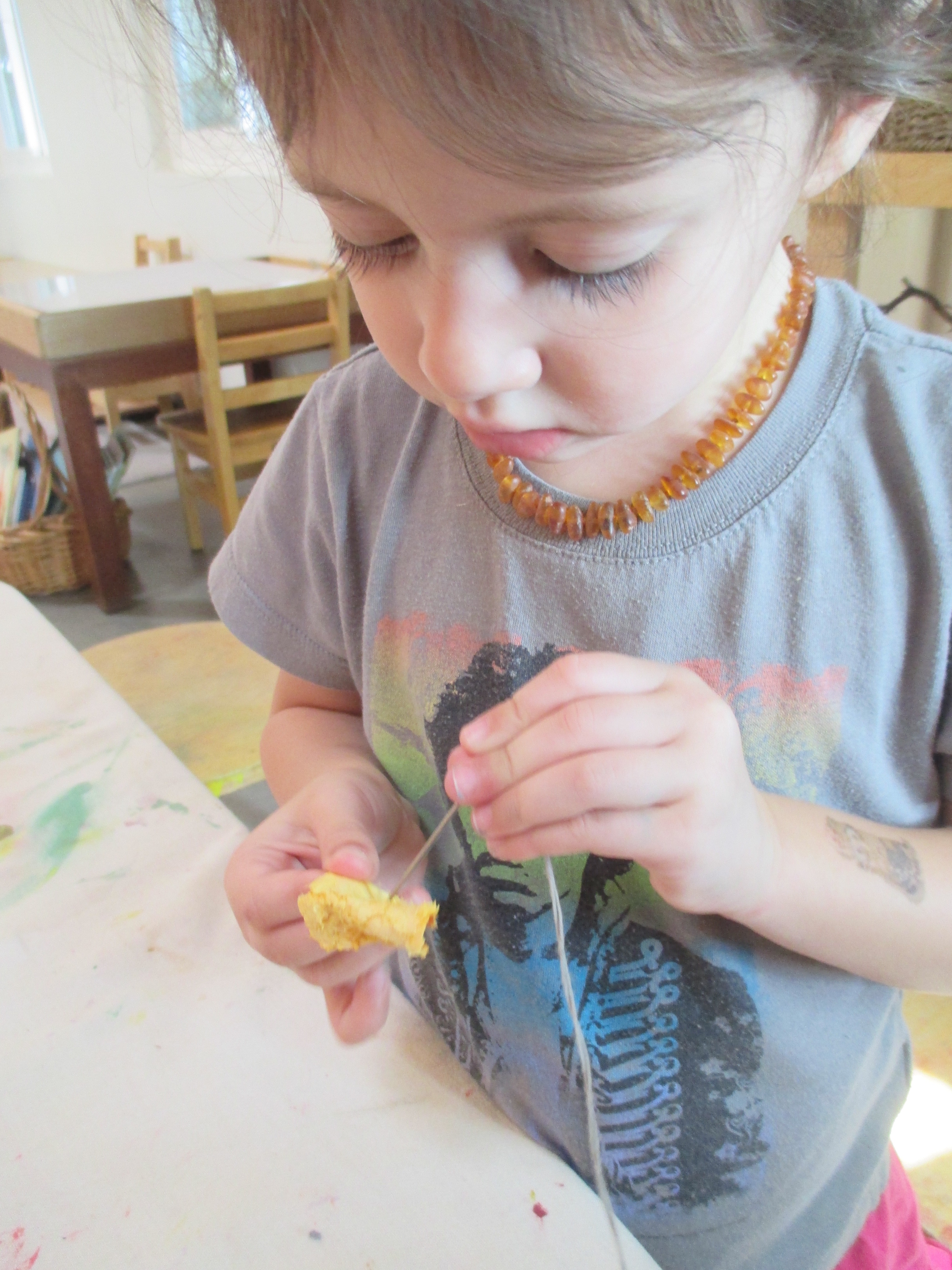 Since the dehydrator was a tool new to all of us, we sometimes had food that came through the process and was inedible.  Not wanting the food to go to waste and using their observations as inspiration, the teachers introduced needle and thread to challenge fine motor skills and create sweet smelling sun catchers.    -Teacher Amy