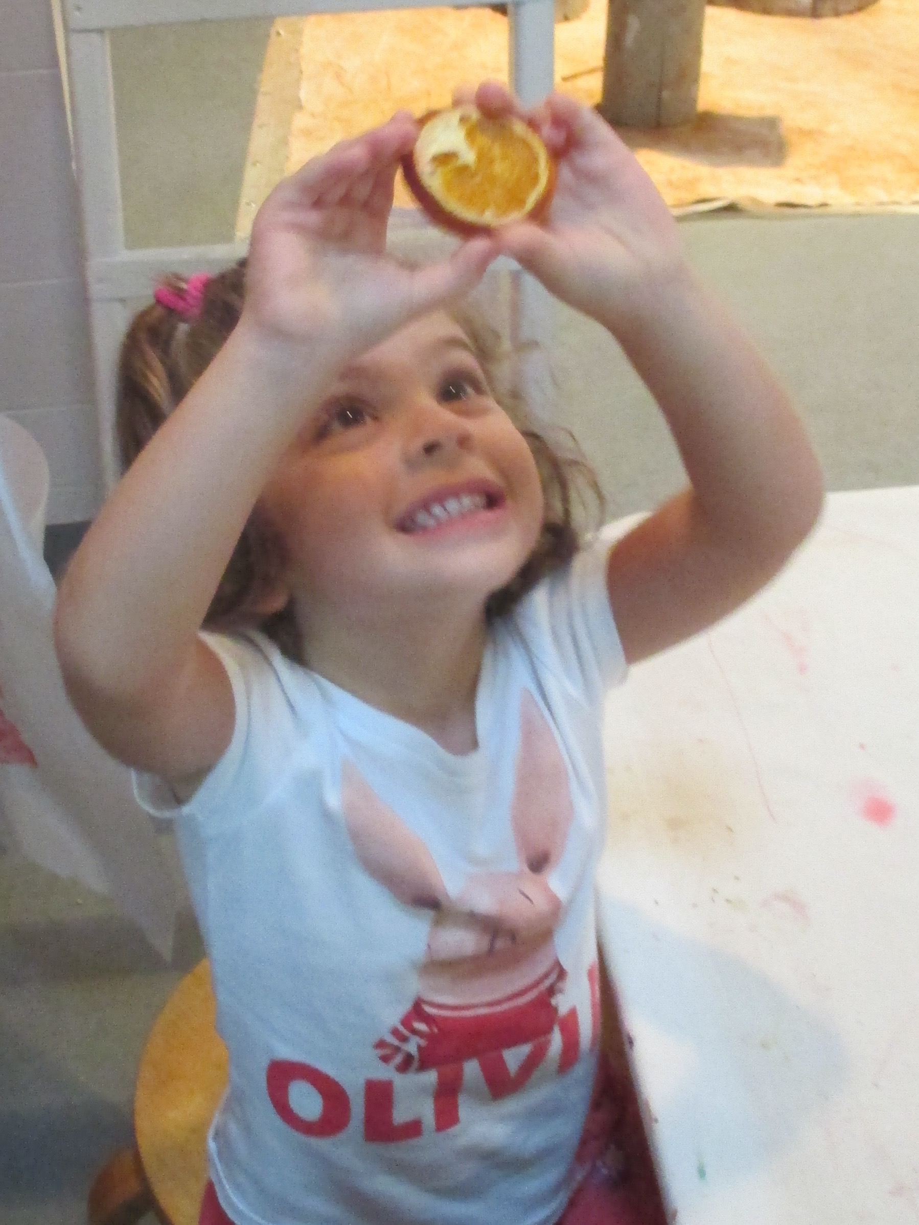 Lily: (holding the orange up to the skylight) Look at the color!