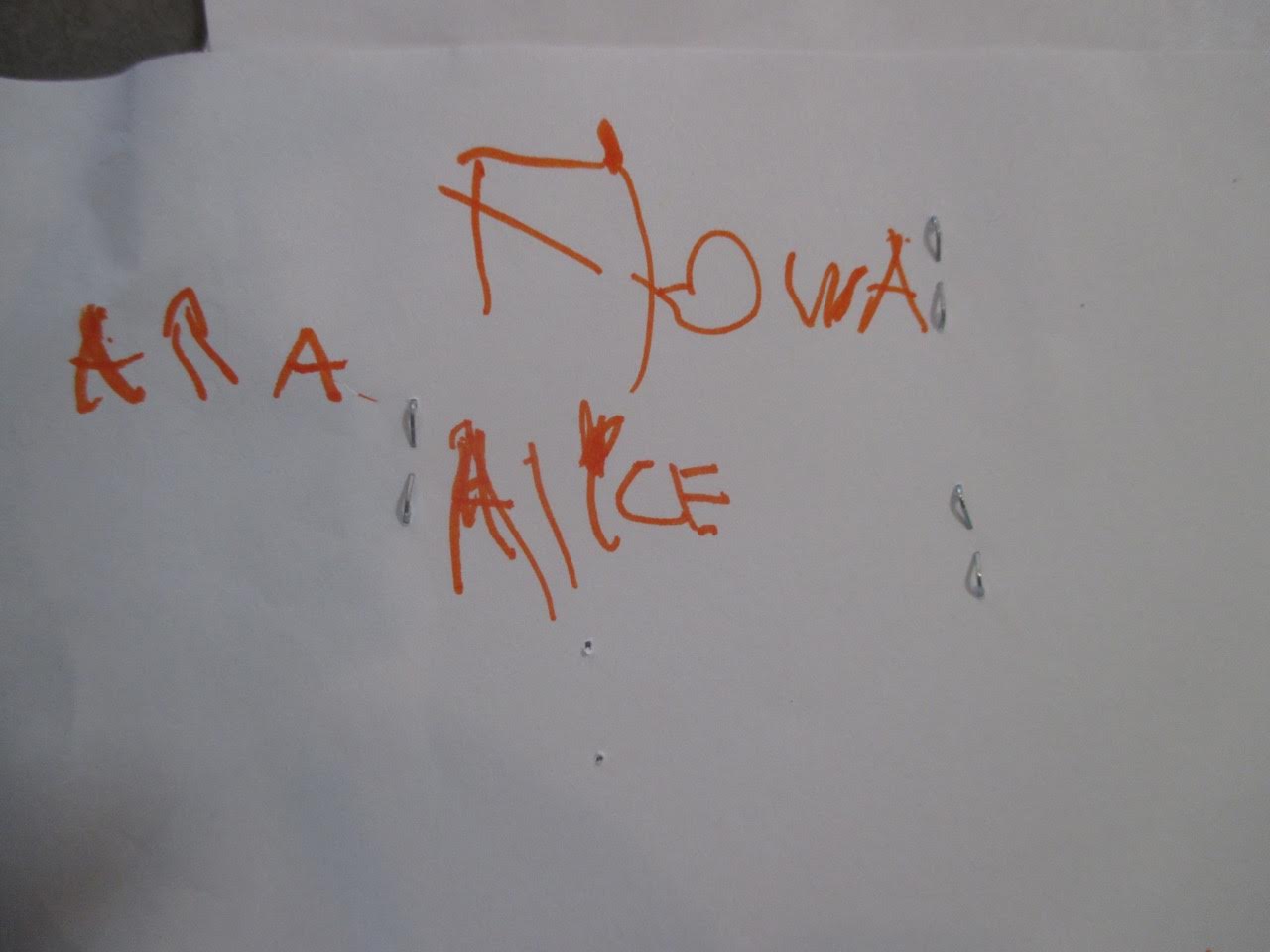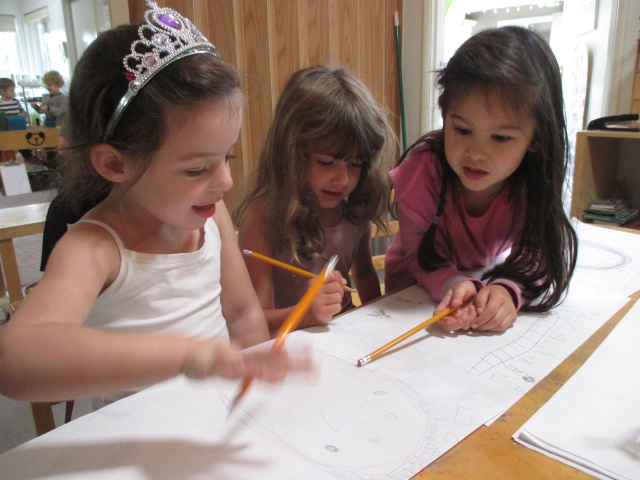 In the Communication Center, Ava, Alice and Fiona grabbed 3 pieces of partner drawing paper (11×17), put their chairs together, and started taping and stapling papers together.