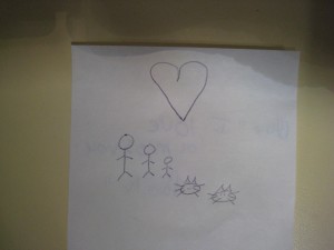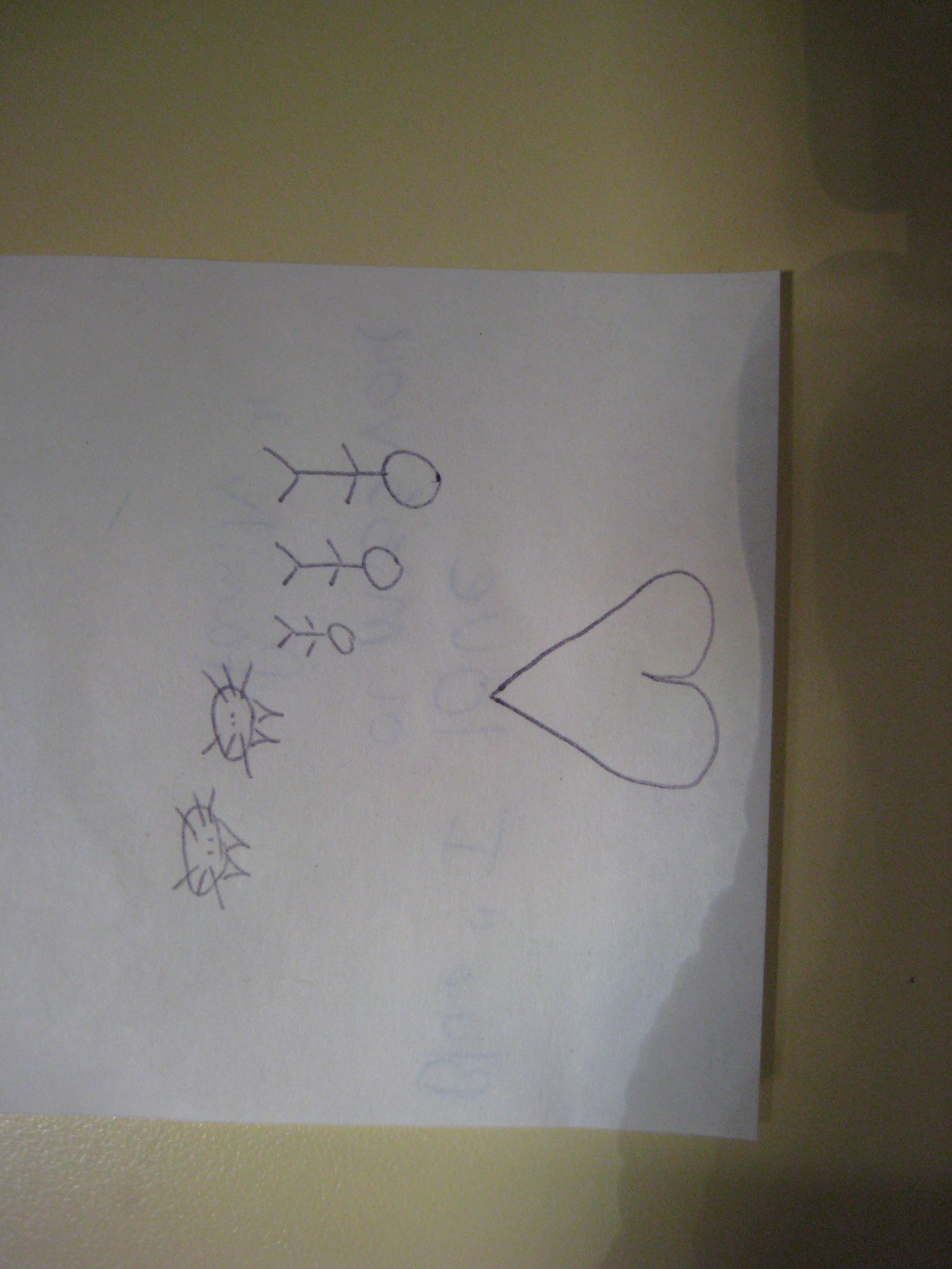 Blue- “The heart means I miss you and I love you. The other drawings