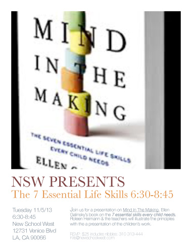 Next Week! 11/5/13 6:30-8:45 at New School-West. Roleen and the teachers will illustrate Ellen Galinsky’s Mind in the Making:The Seven Essential Life Skills Every Child Needs with anecdotes and images of the children’s work.