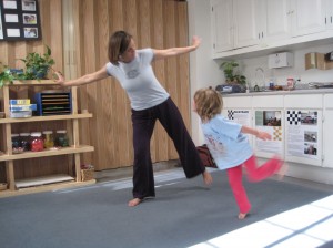 These classes are an exploration with our bodies as a means to gain agility, self-awareness, vocabulary to describe and understand our bodies, and knowledge of ourselves in space and in relation to others. We explore space, shape, velocity, time, levels, size and more through moving our bodies. To accomplish this goal, we play a lot of “dance games” that encourage the children to think, make choices for themselves, and interact with friends.