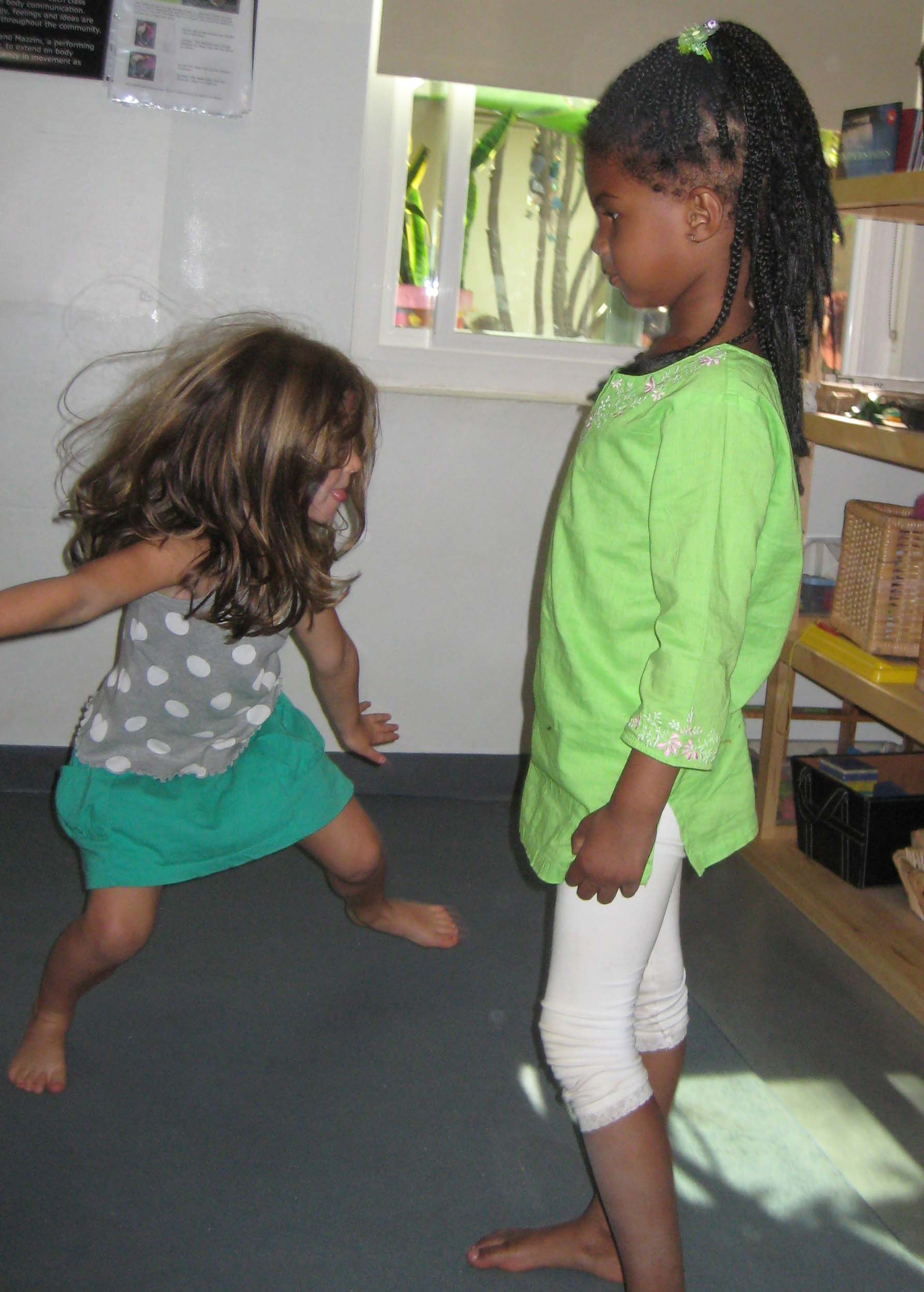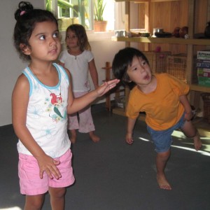 The focus of this group has been round shapes. This week the group played a game where one friend stood still while the other friend moved around them in a circle. Ilaan challenged them to find different ways to move their bodies around their friends.