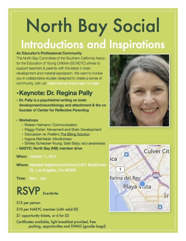 Because you’re an important part of our professional community, we will want to include you on many of our opportunities to study together. This fall, there will be many, many opportunities. They will all be discussed at the North Bay Social. North Bay is a geographic committee of Southern California Association for the Education of Young Children (SCAEYC). I’m the co-chair of North Bay. Our next meeting to plan this event is held at the Pedagogical Institute at 2940 Nebraska Ave, Santa Monica on October 7th, from 6:00-8:00. We would love for you to join us in planning or enjoying the day. Consider this a ‘save the date’ and we will be sending an Event Brite invitation to RSVP soon. xoxo Kris