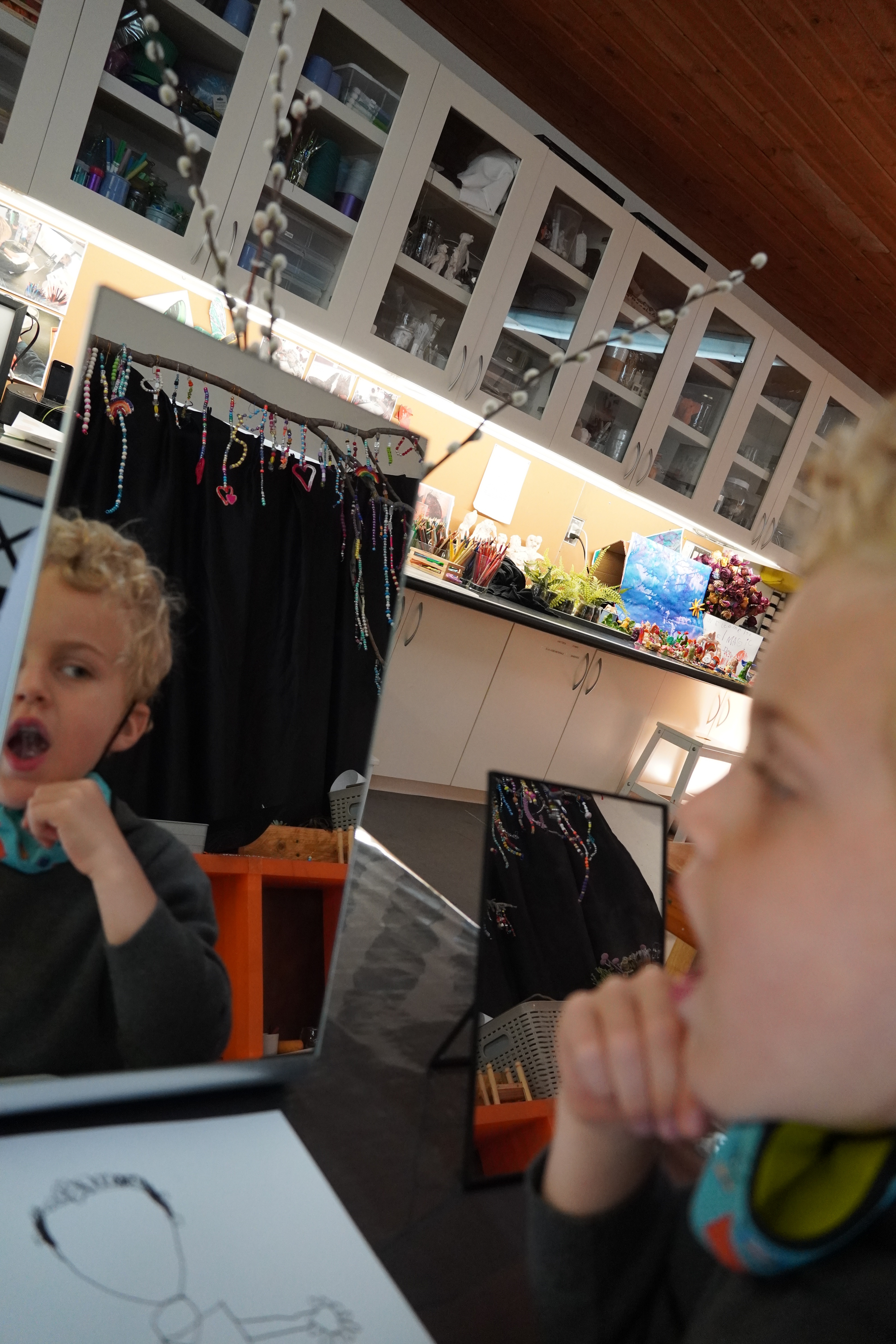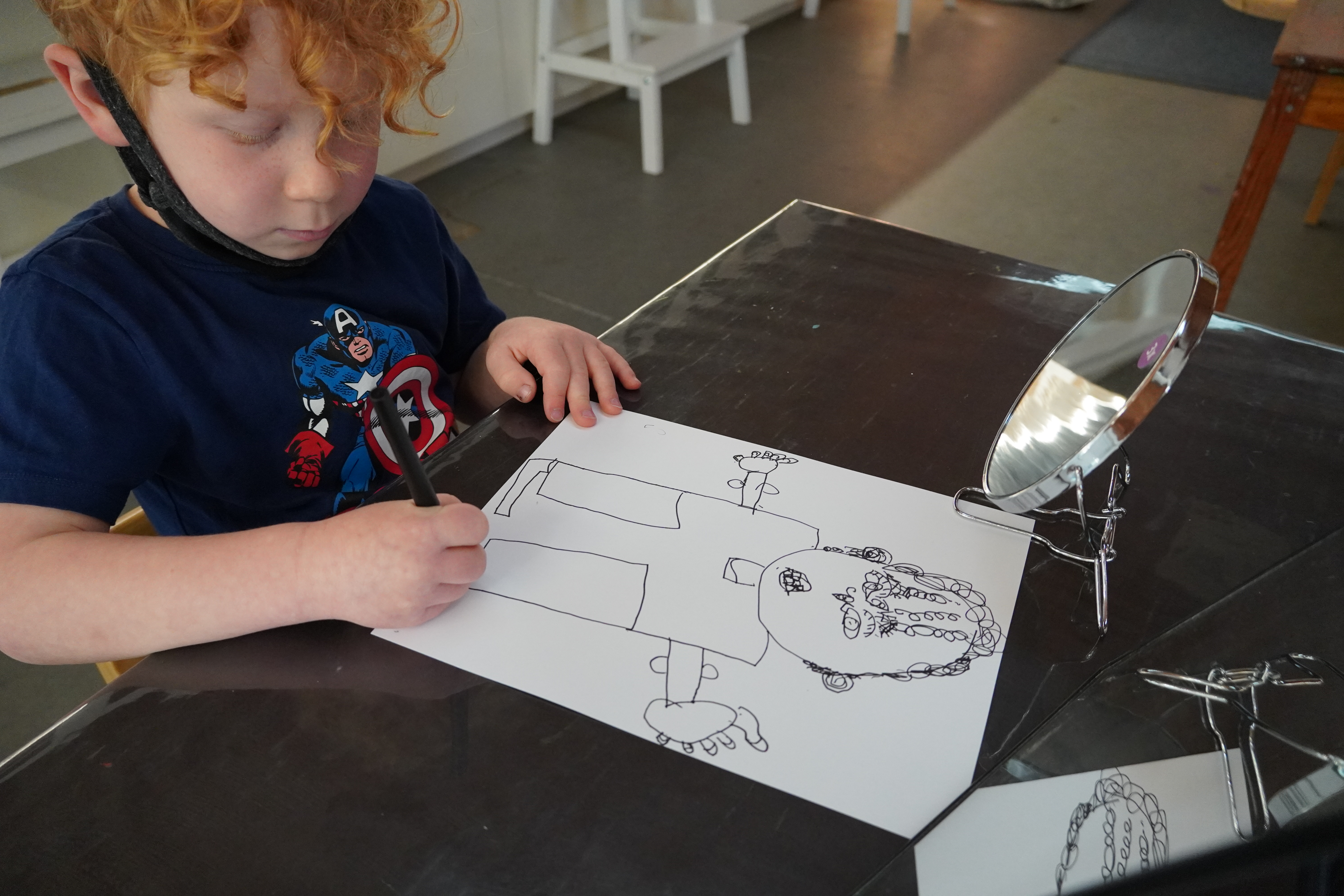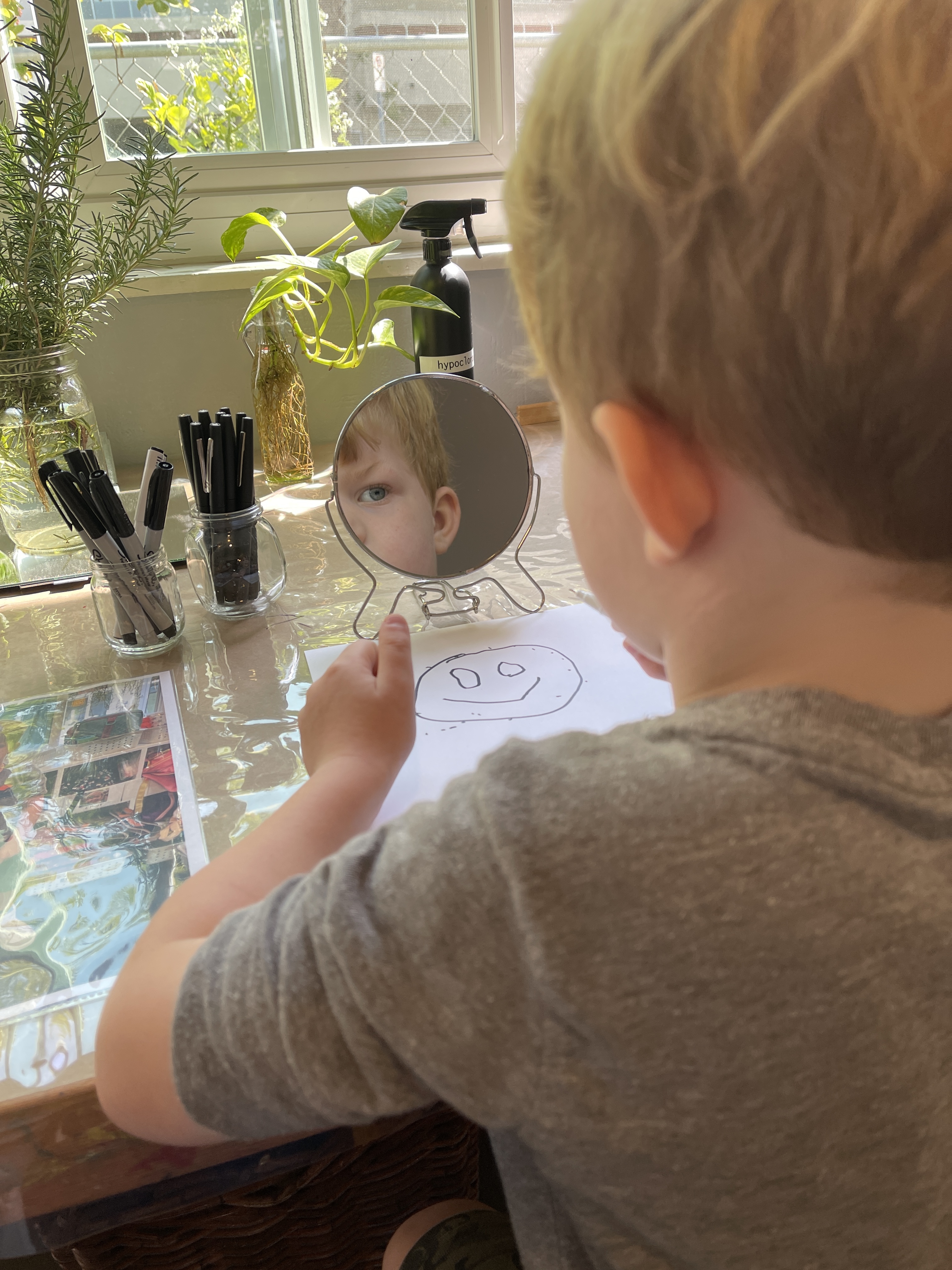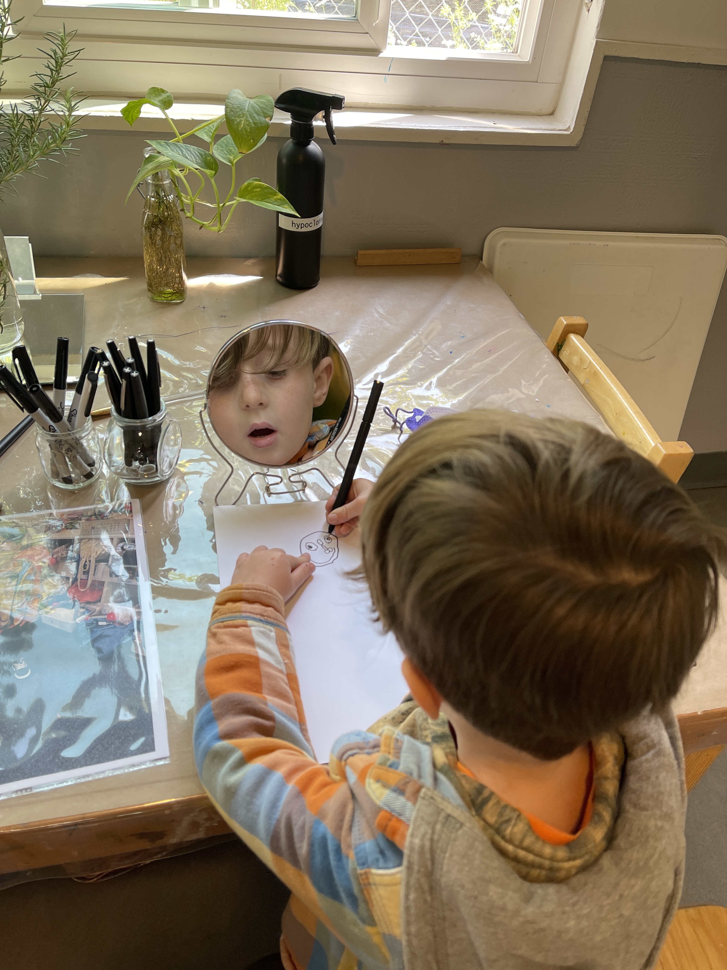 As the children made their self portraits we observed some of them scaffolding techniques for each other. By listening to each other’s narrative process, the children who weren’t really voicing their questions and ideas were able to apply a similar process to their own experiences. Chloe and Mason reminded us of the importance of having children work side by side to offer the opportunity to see a different way to tackle a similar challenge. When working in a group they built on each other’s ideas adding to the whole group’s knowledge and developing a sense of community.