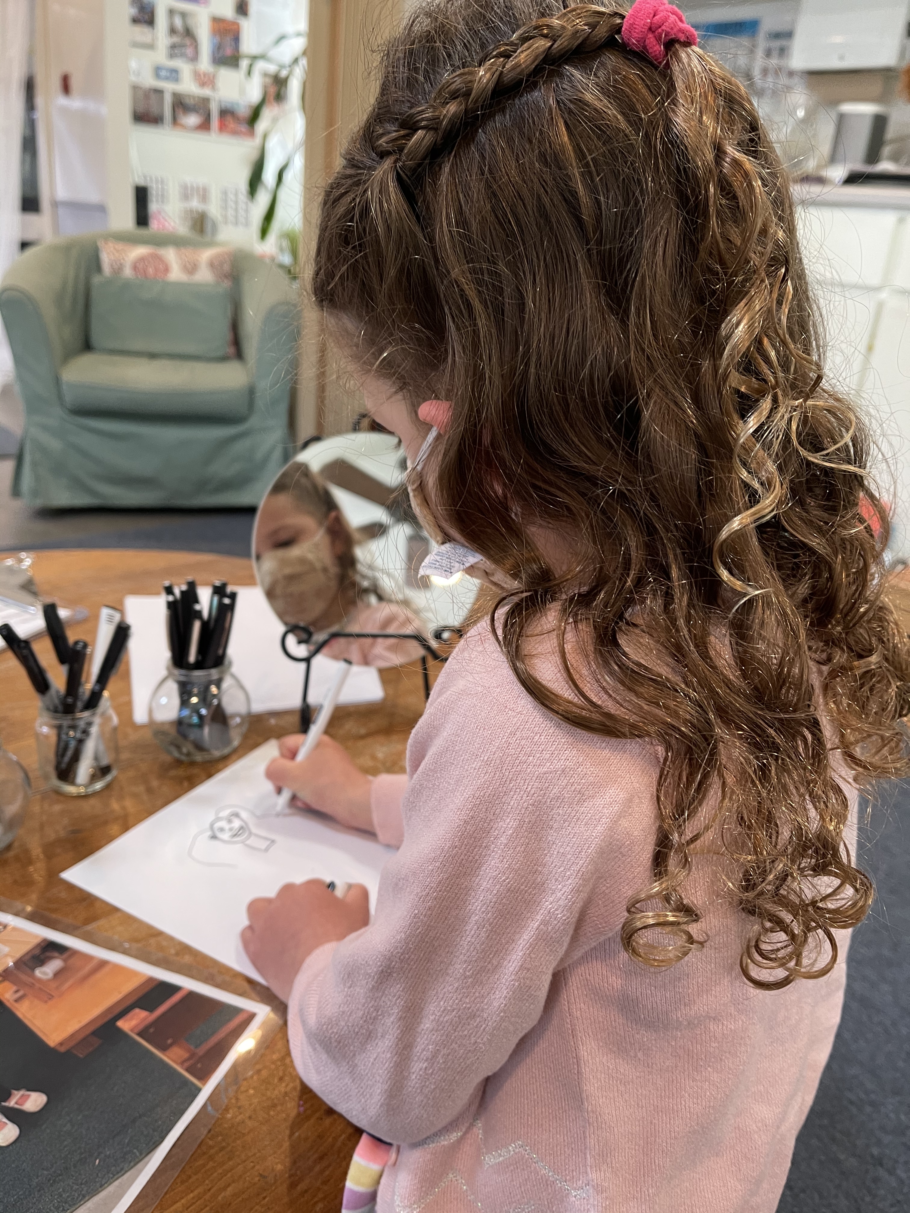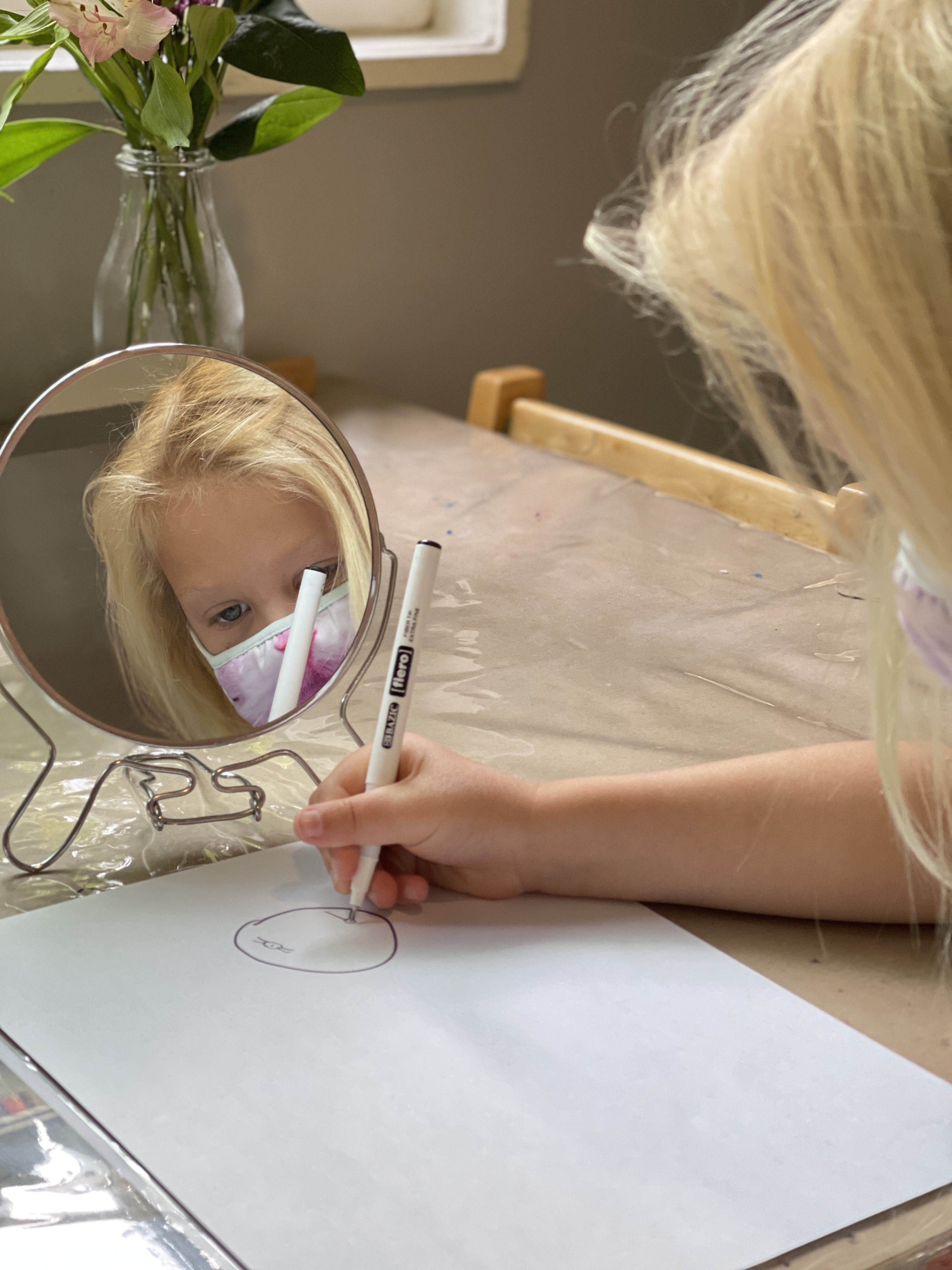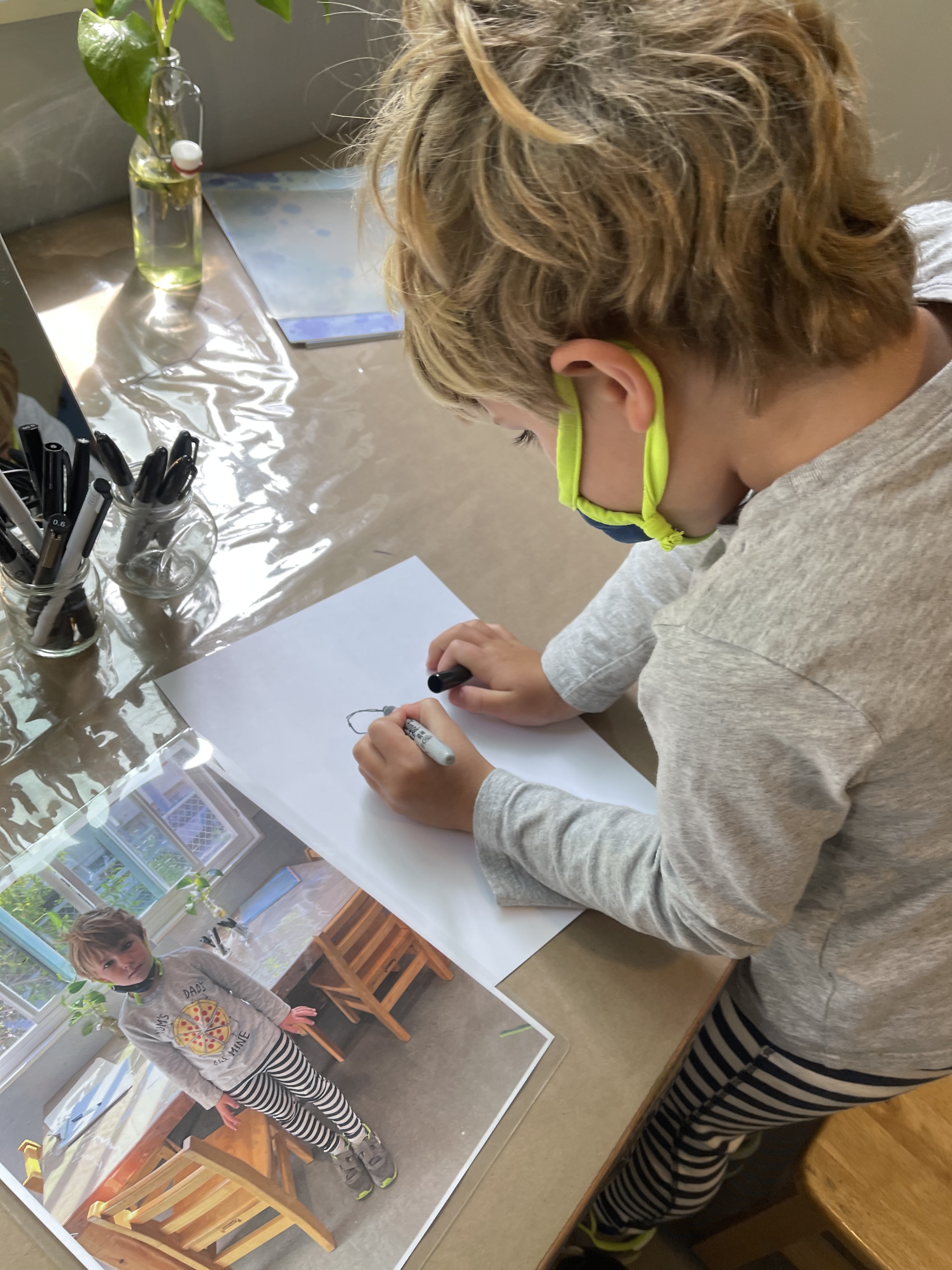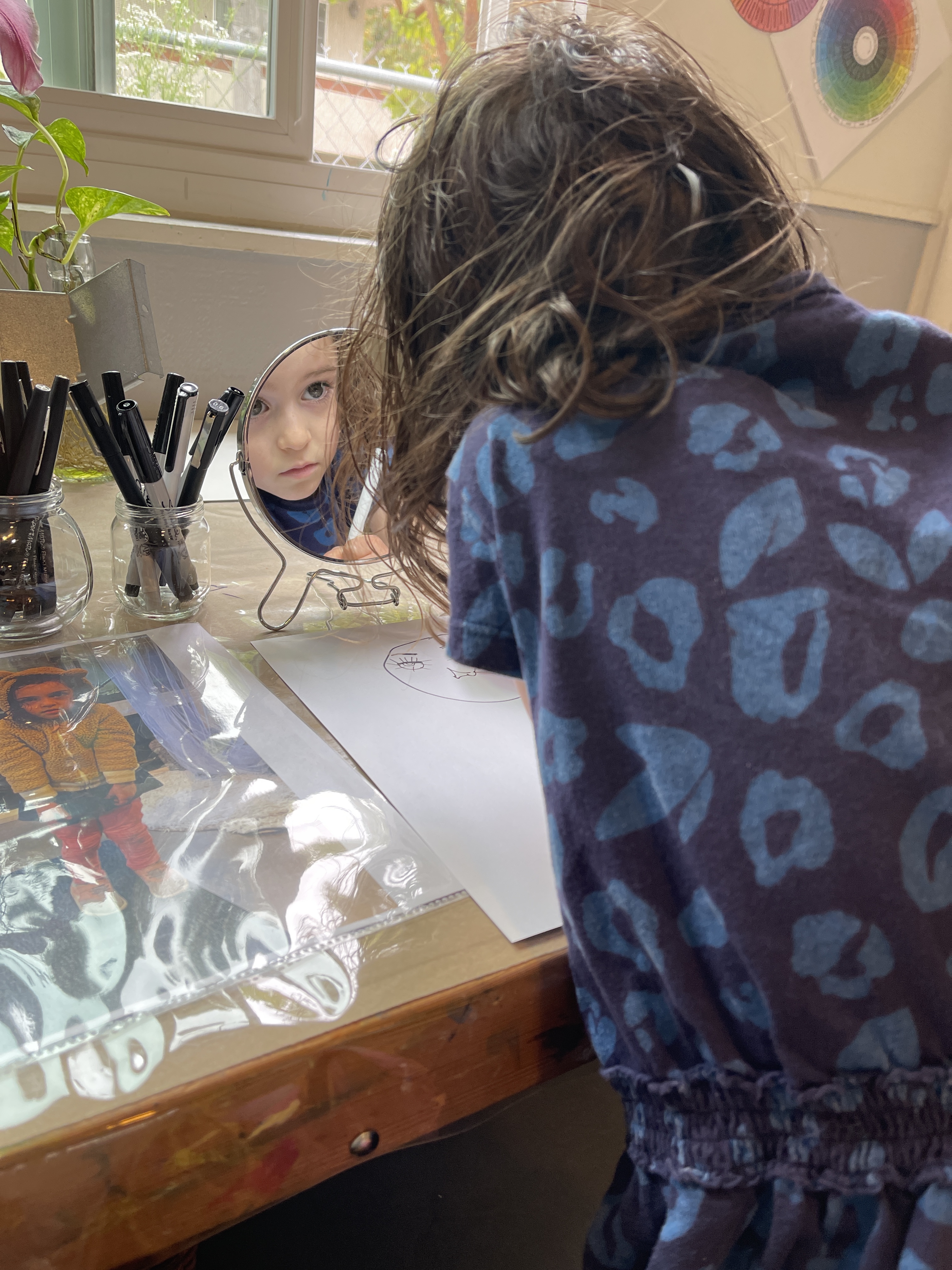 From the moment the children enter the school, we intentionally design a curriculum to express their internal and external uniqueness so that they begin to recognize the different elements that contribute to their identities and its effect on our group identity. These expressions are captured in their ID panels. We have revisited their ID panels multiple times from different perspectives, giving the children an opportunity to express what makes them who they are. During their West Wing year, the children spent time with mirrors looking at their faces, their whole bodies, and taking pictures of different expressions that they used. As we entered the East Wing year, we set up different independent areas where the children could look at themselves and use multiple line tools to create self-portraits. Children revisited their work independently and other times with a peer. We supported the children to find the right organic moment where one child at a time removed the face cover mask and the other child would comment on the details to add to the self-portrait. Photos of the children were used as a tool to support expressions that we couldn’t hold for long in the mirror. Below you’ll find a glimpse of the support process.