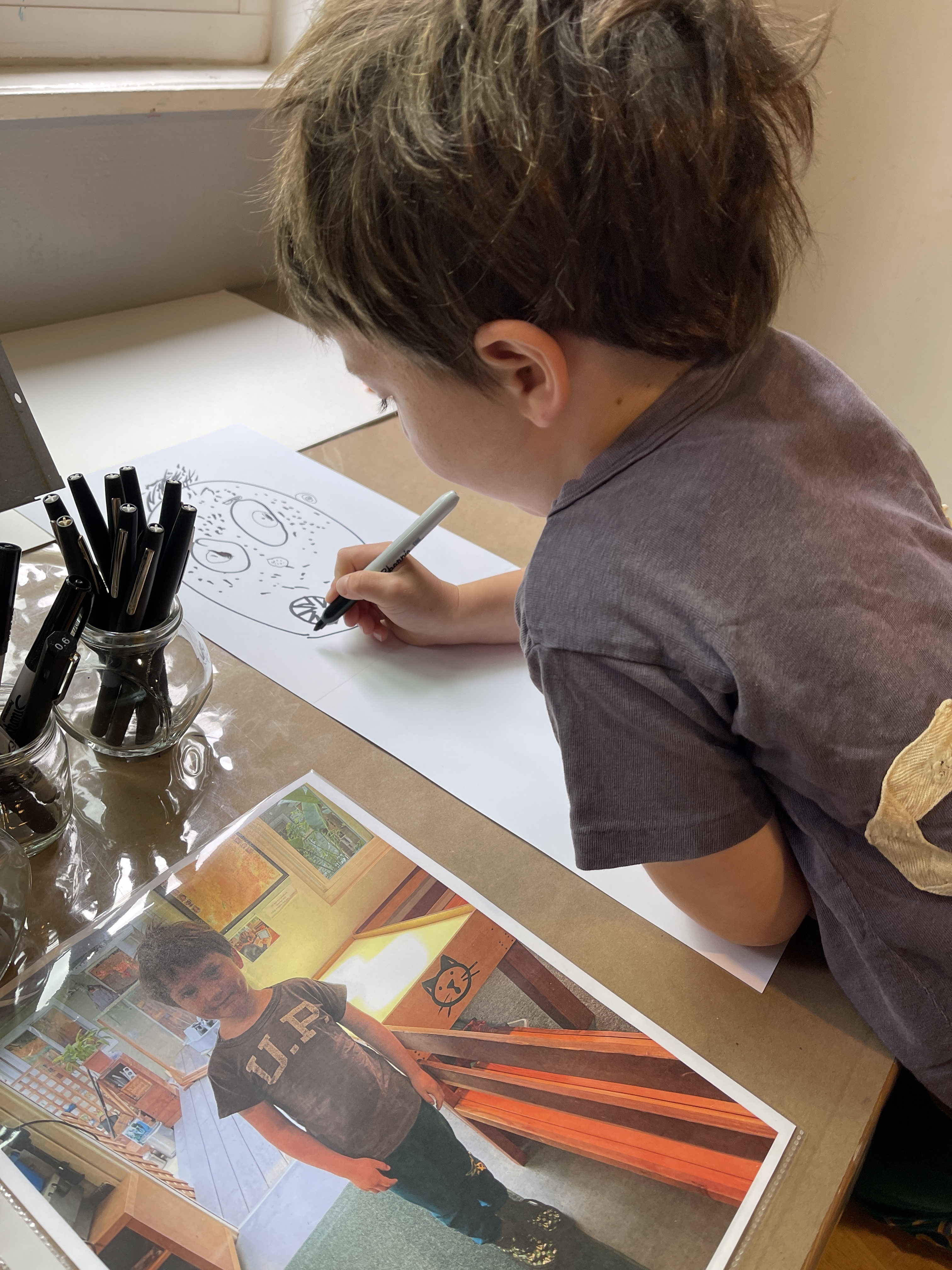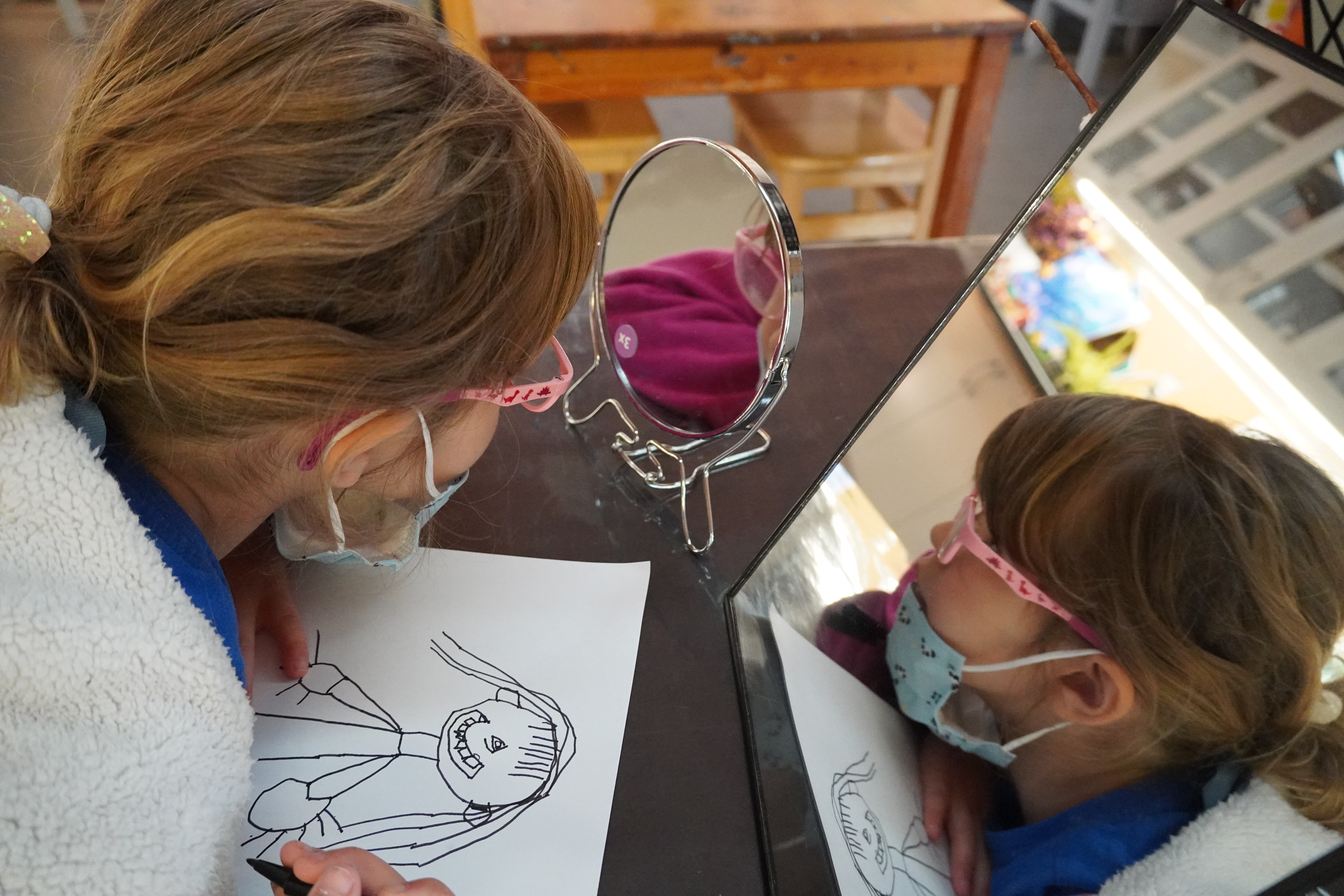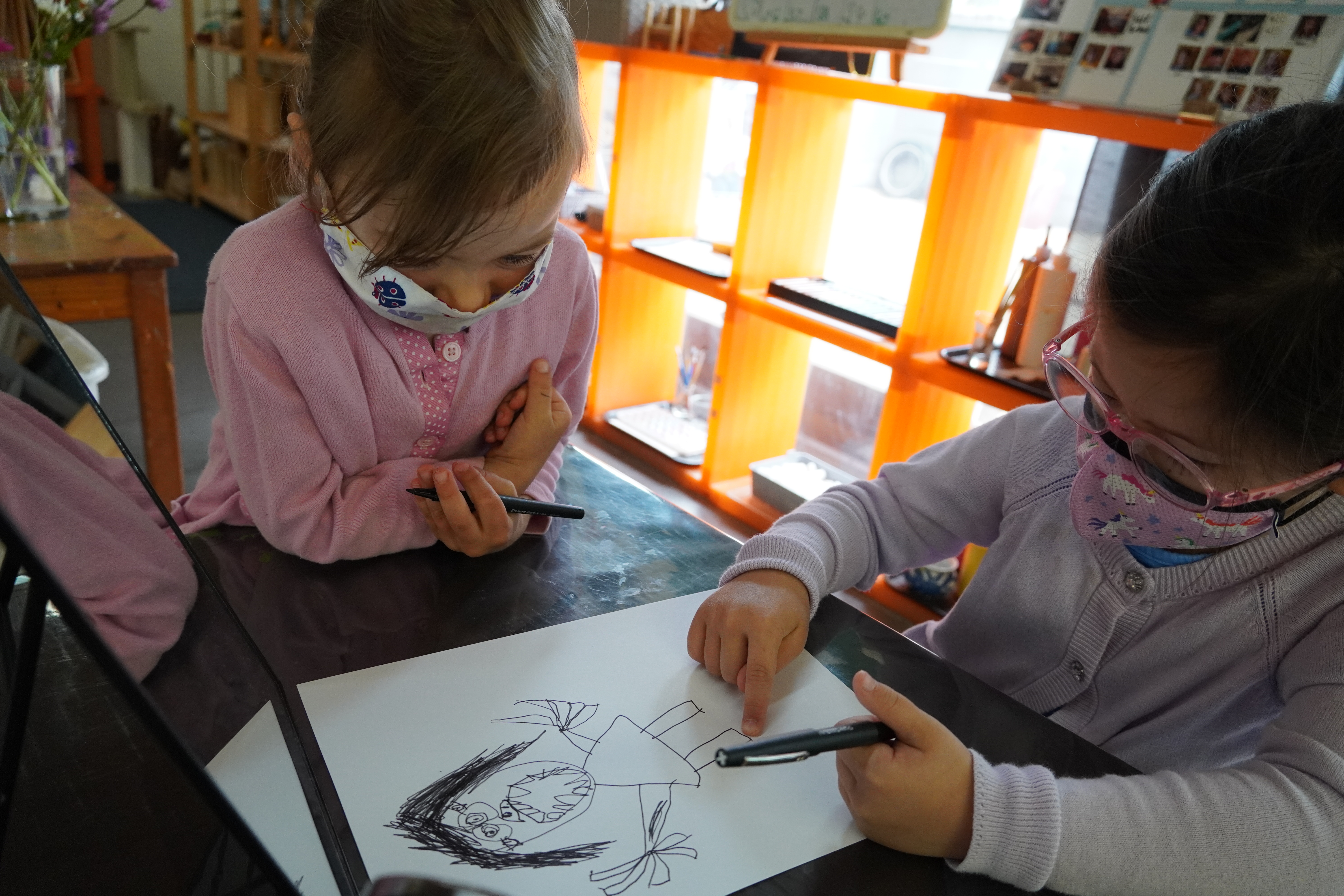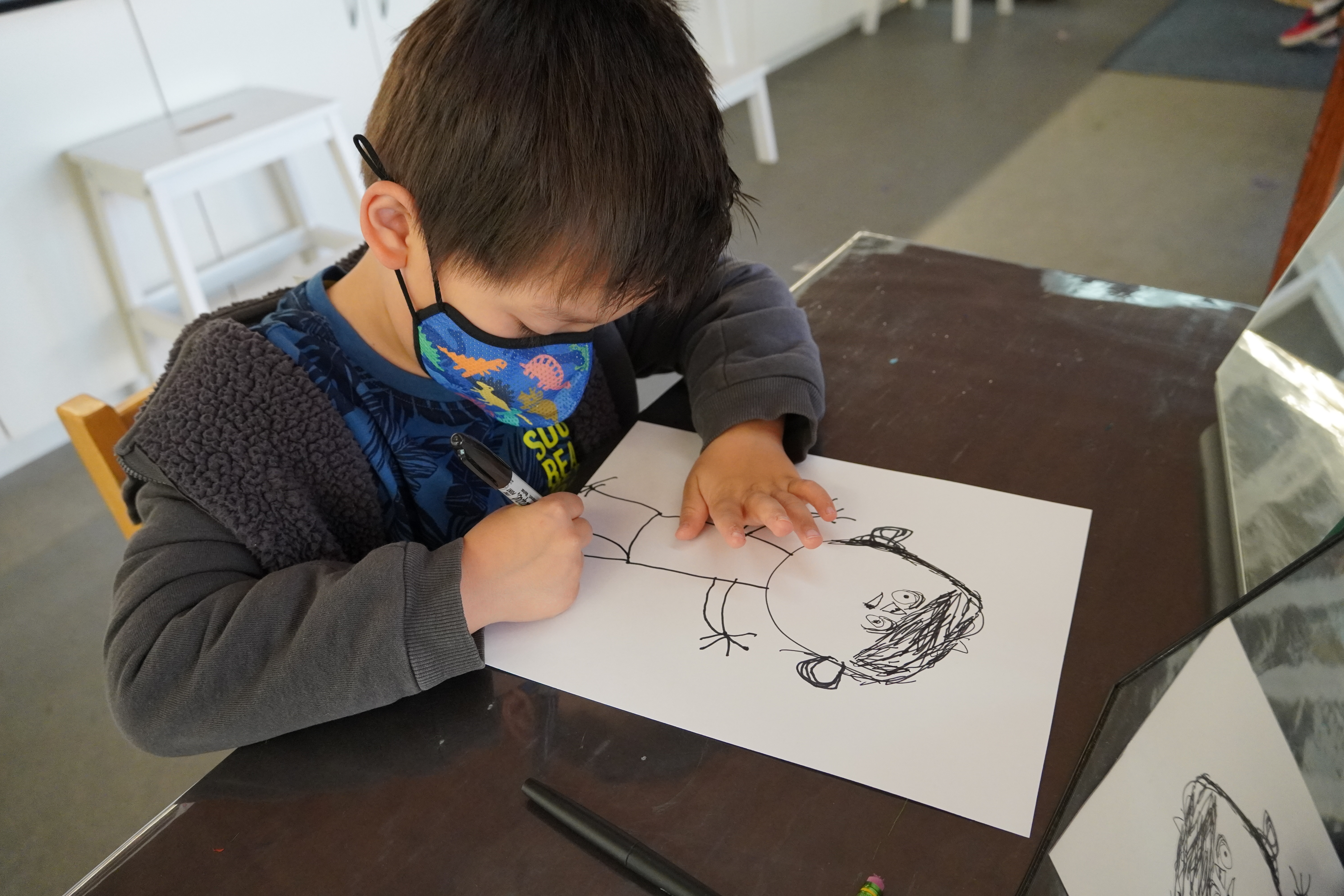 From the moment the children enter the school, we intentionally design a curriculum to express their internal and external uniqueness so that they begin to recognize the different elements that contribute to their identities and its effect on our group identity. These expressions are captured in their ID panels. We have revisited their ID panels multiple times from different perspectives, giving the children an opportunity to express what makes them who they are. During their West Wing year, the children spent time with mirrors looking at their faces, their whole bodies, and taking pictures of different expressions that they used. As we entered the East Wing year, we set up different independent areas where the children could look at themselves and use multiple line tools to create self-portraits. Children revisited their work independently and other times with a peer. We supported the children to find the right organic moment where one child at a time removed the face cover mask and the other child would comment on the details to add to the self-portrait. Photos of the children were used as a tool to support expressions that we couldn’t hold for long in the mirror. Below you’ll find a glimpse of the support process.