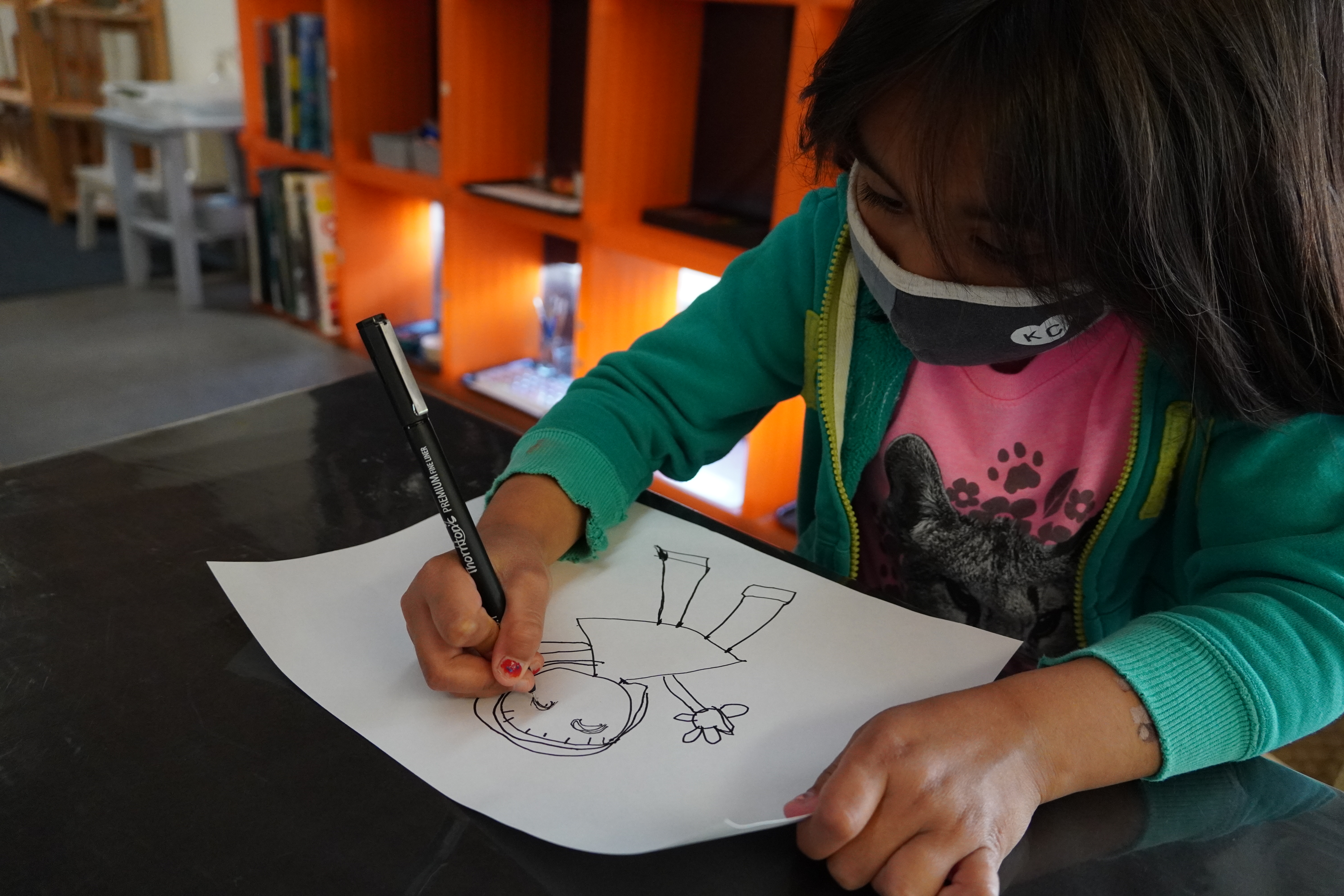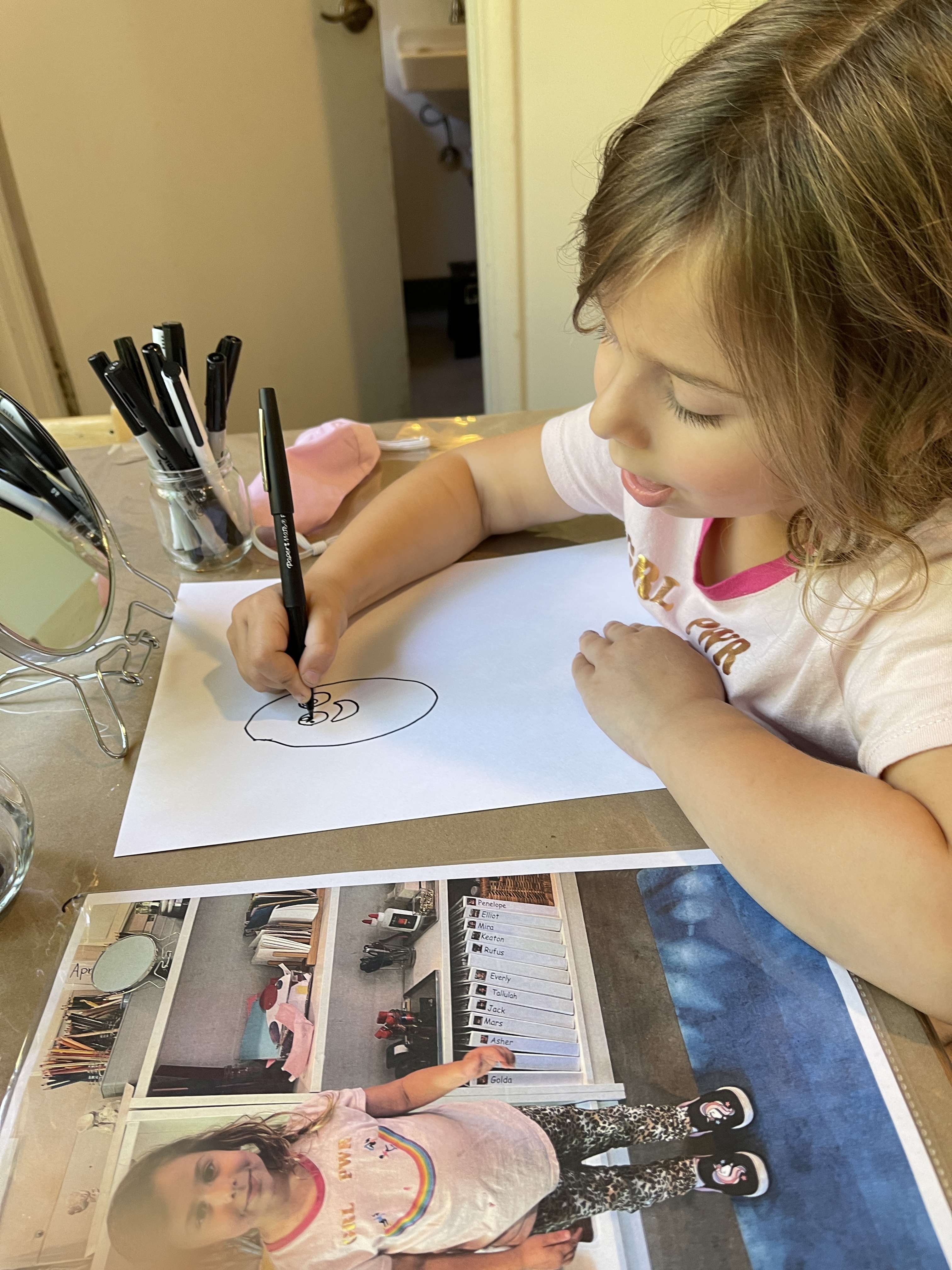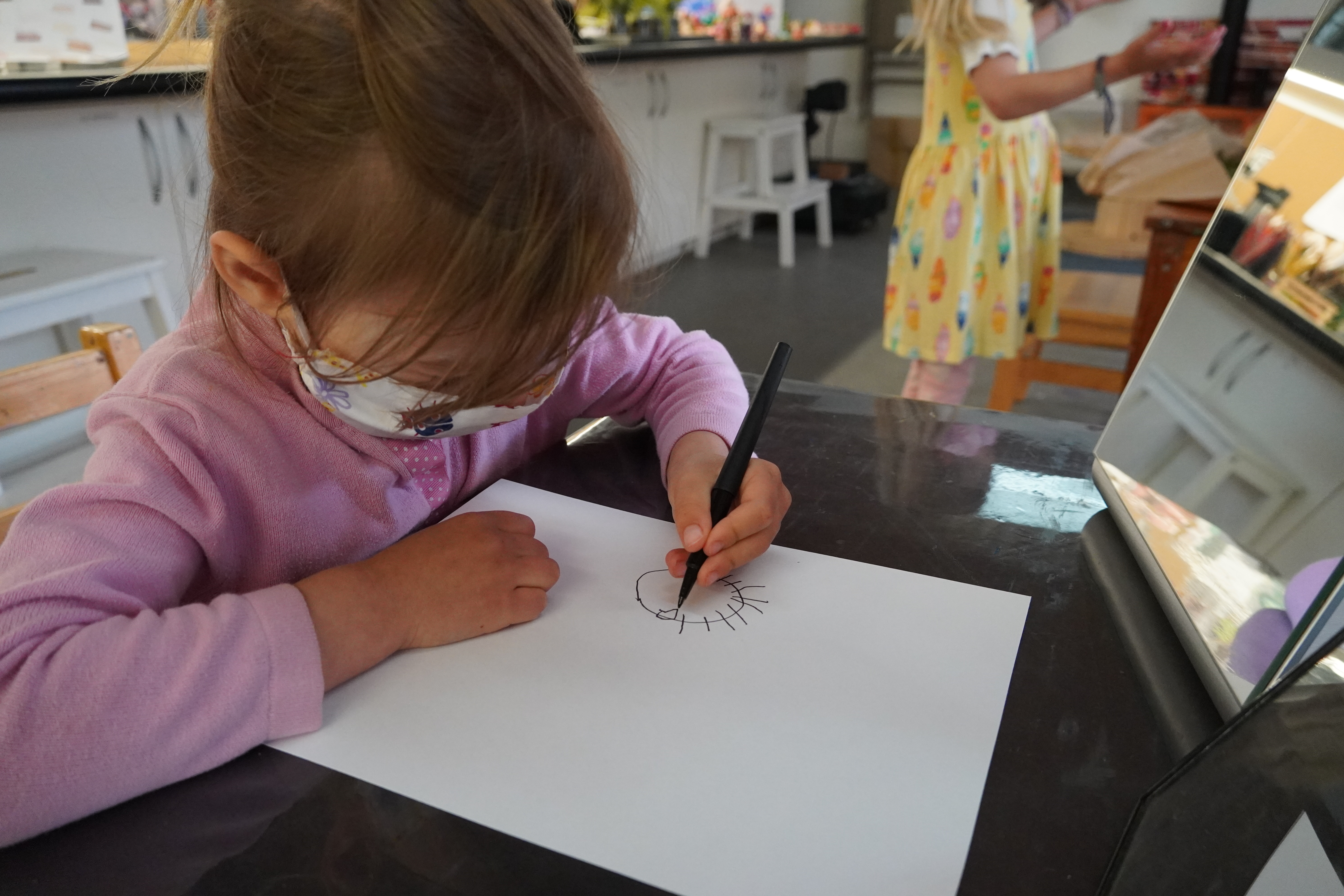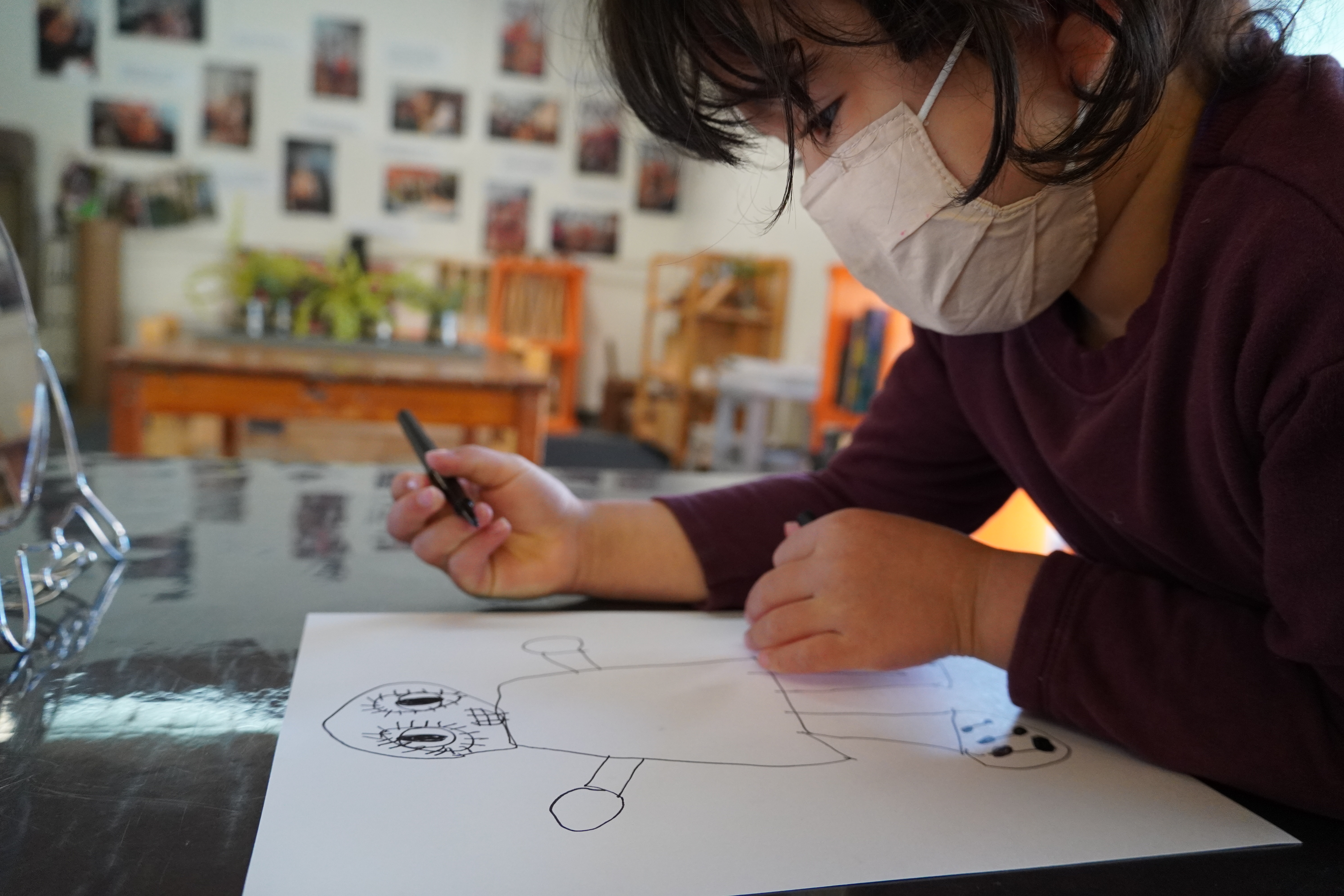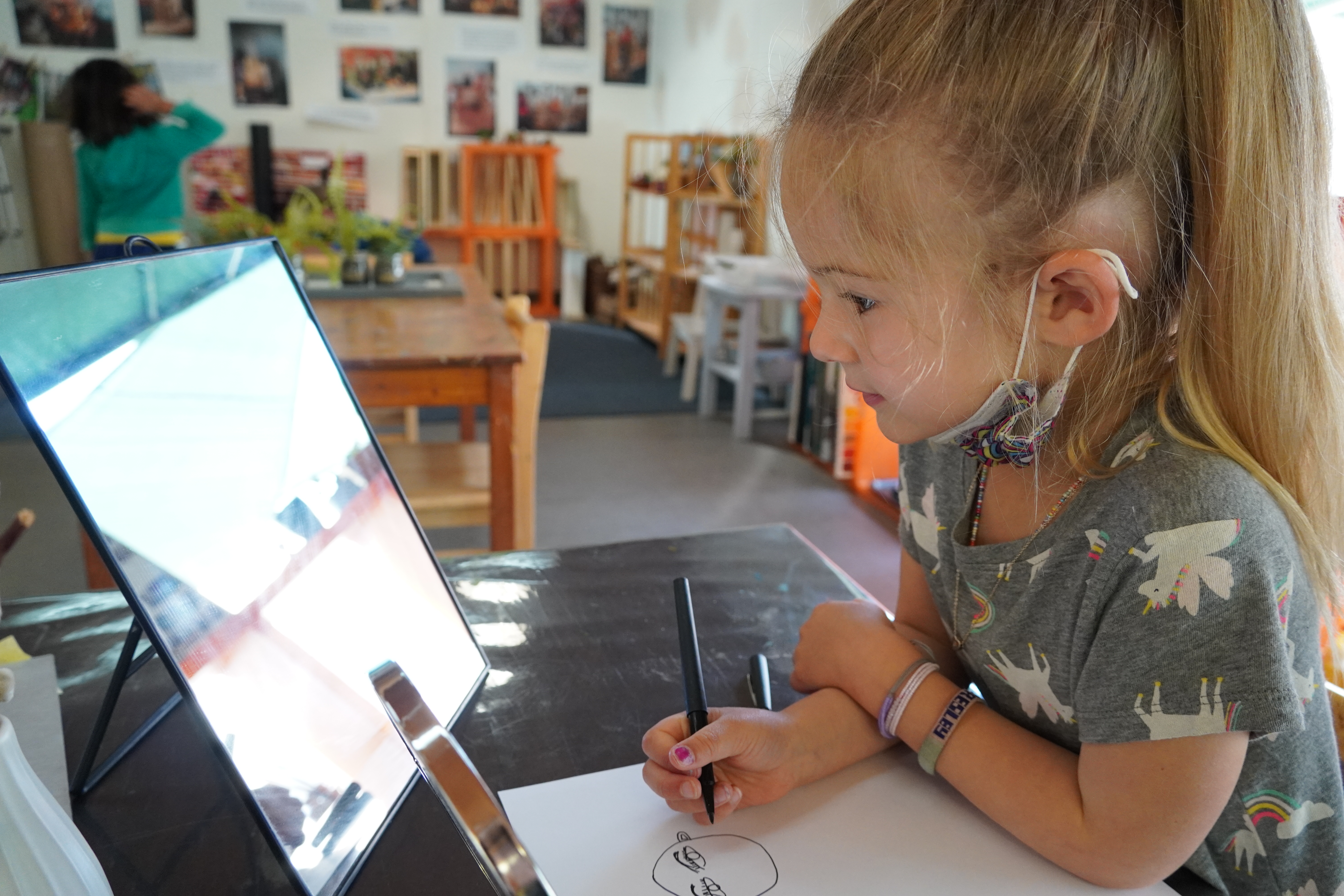 From the moment the children enter the school, we intentionally design a curriculum to express their internal and external uniqueness so that they begin to recognize the different elements that contribute to their identities and its effect on our group identity. These expressions are captured in their ID panels. We have revisited their ID panels multiple times from different perspectives, giving the children an opportunity to express what makes them who they are. During their West Wing year, the children spent time with mirrors looking at their faces, their whole bodies, and taking pictures of different expressions that they used. As we entered the East Wing year, we set up different independent areas where the children could look at themselves and use multiple line tools to create self-portraits. Children revisited their work independently and other times with a peer. We supported the children to find the right organic moment where one child at a time removed the face cover mask and the other child would comment on the details to add to the self-portrait. Photos of the children were used as a tool to support expressions that we couldn’t hold for long in the mirror. Below you’ll find a glimpse of the support process.