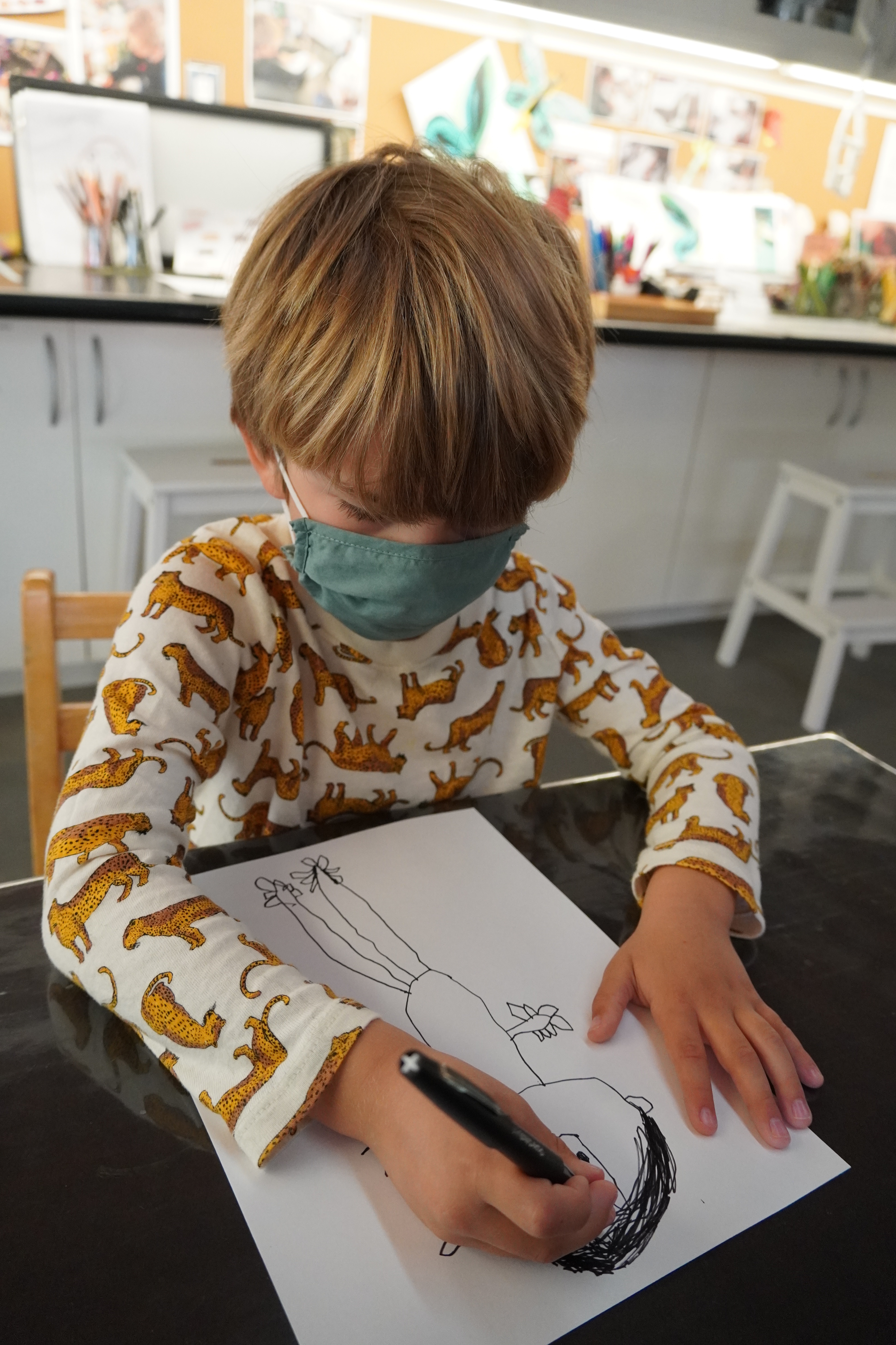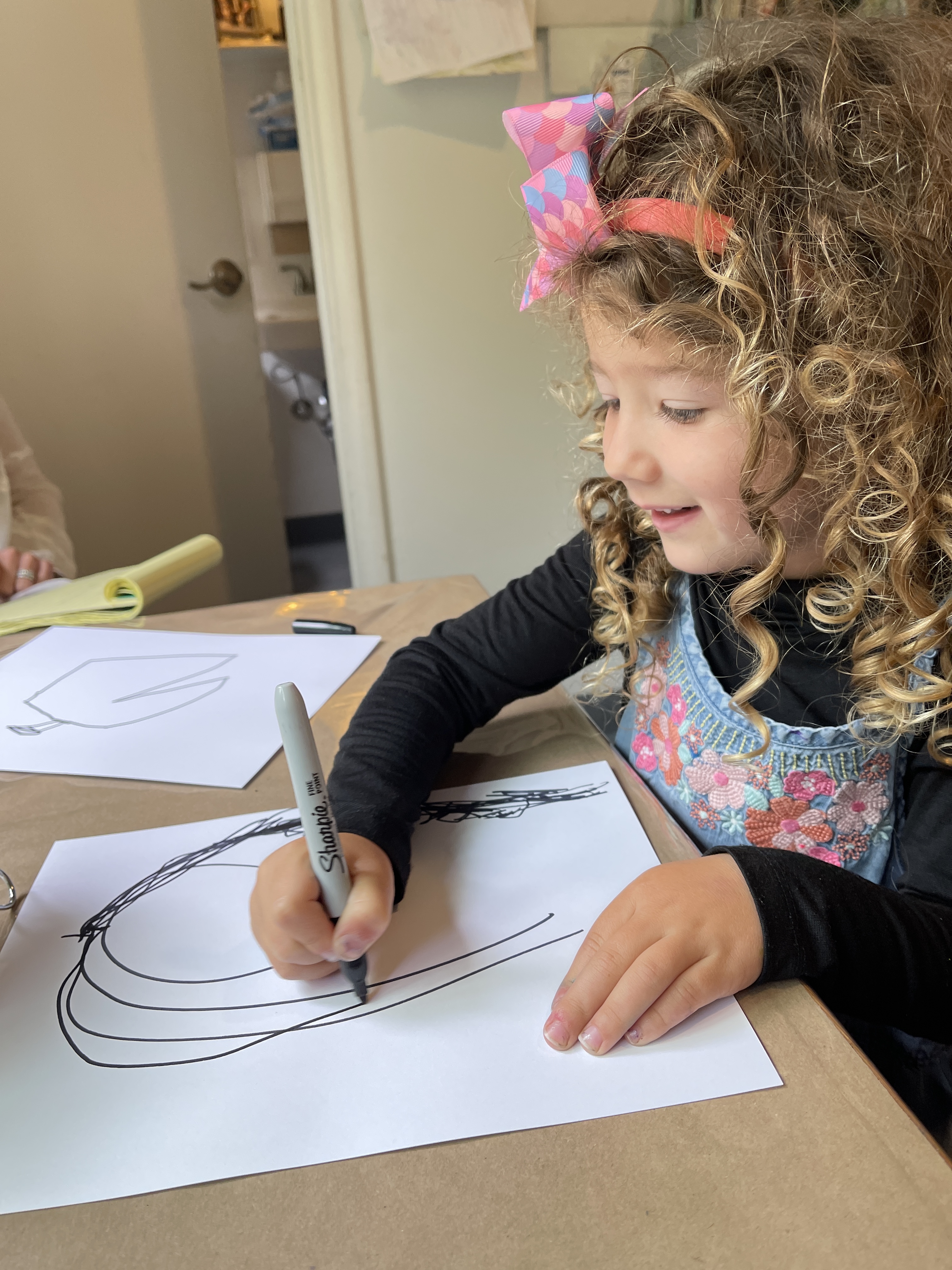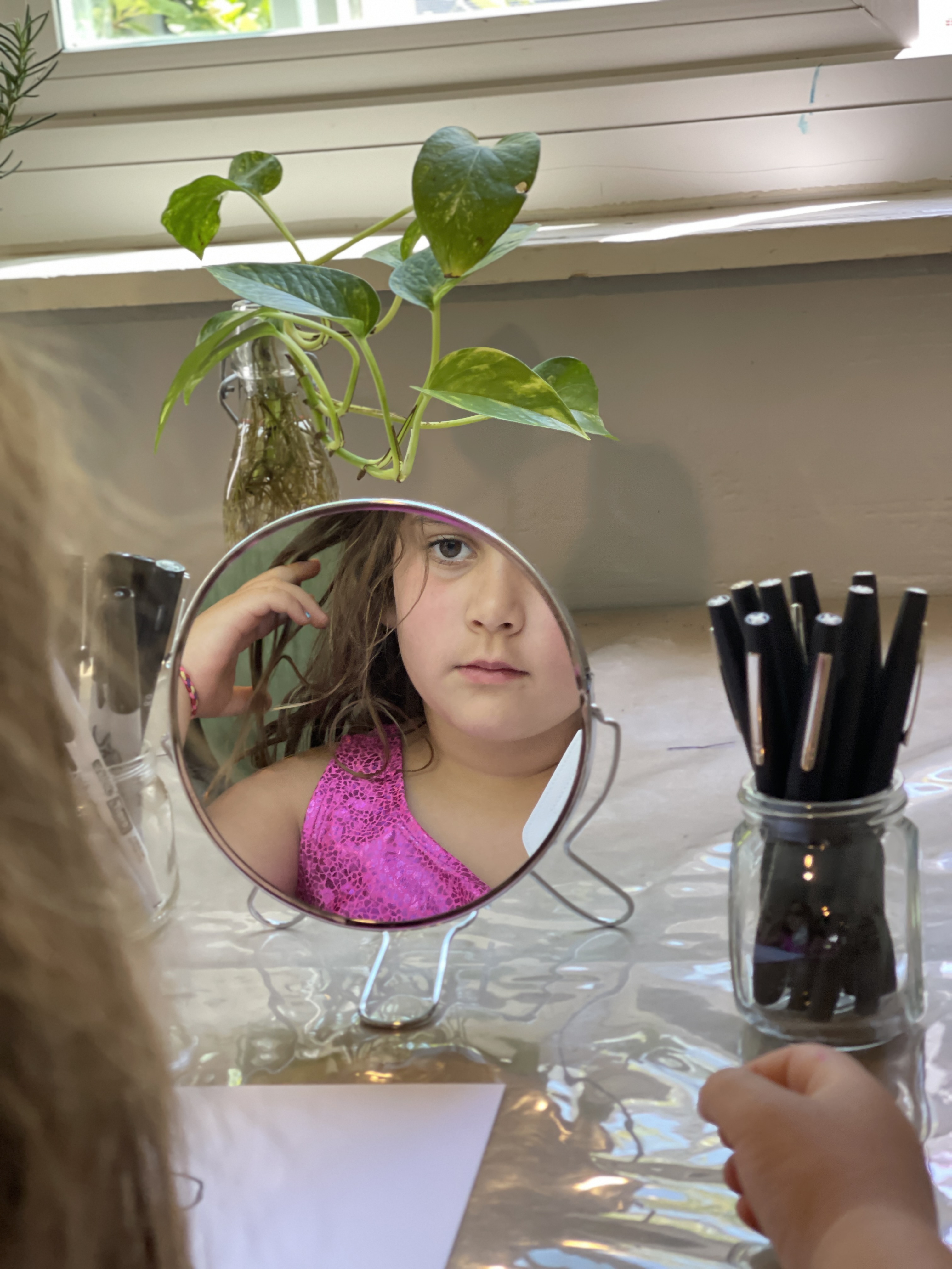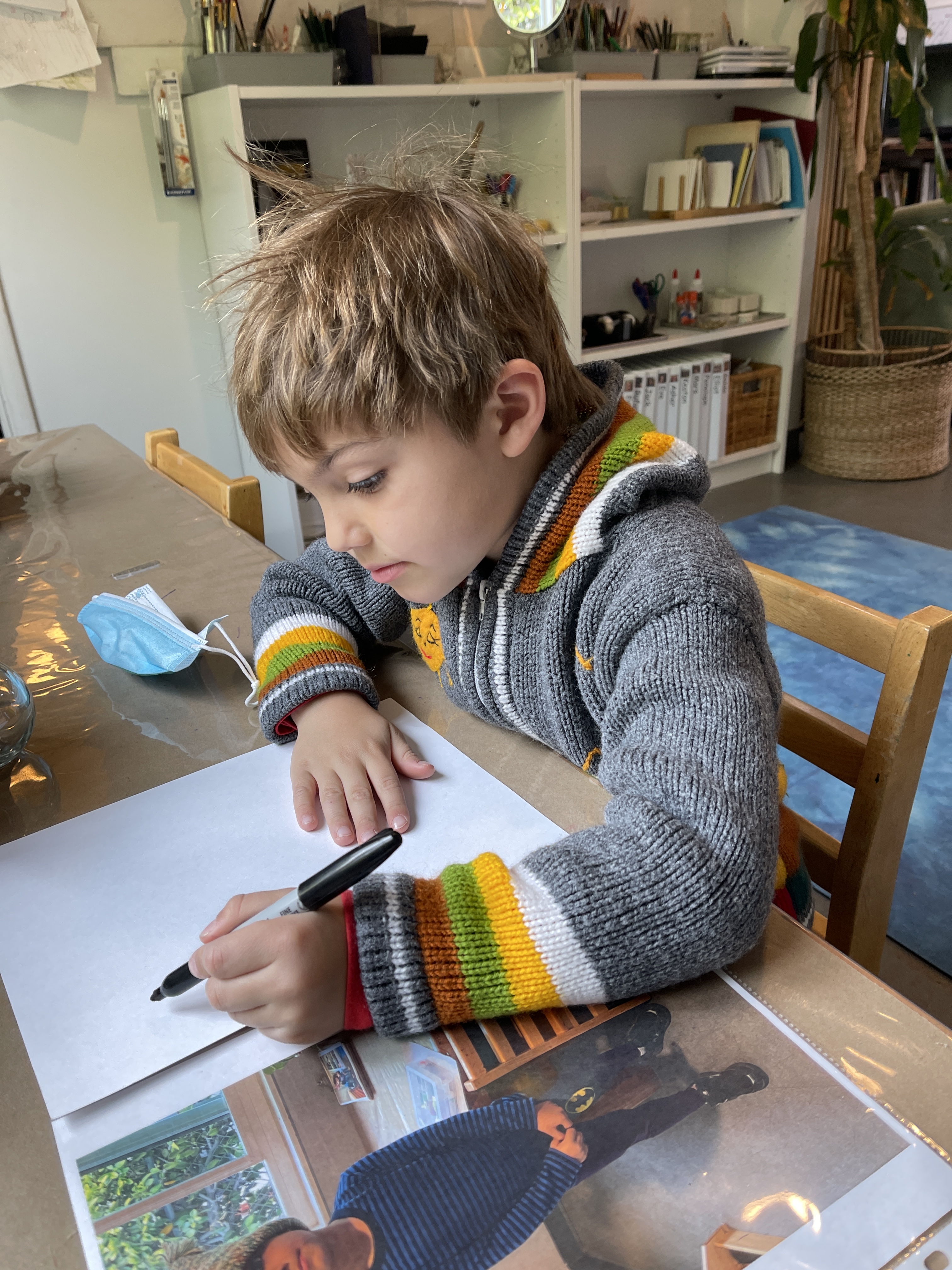 From the moment the children enter the school, we intentionally design a curriculum to express their internal and external uniqueness so that they begin to recognize the different elements that contribute to their identities and its effect on our group identity. These expressions are captured in their ID panels. We have revisited their ID panels multiple times from different perspectives, giving the children an opportunity to express what makes them who they are. During their West Wing year, the children spent time with mirrors looking at their faces, their whole bodies, and taking pictures of different expressions that they used. As we entered the East Wing year, we set up different independent areas where the children could look at themselves and use multiple line tools to create self-portraits. Children revisited their work independently and other times with a peer. We supported the children to find the right organic moment where one child at a time removed the face cover mask and the other child would comment on the details to add to the self-portrait. Photos of the children were used as a tool to support expressions that we couldn’t hold for long in the mirror. Below you’ll find a glimpse of the support process.