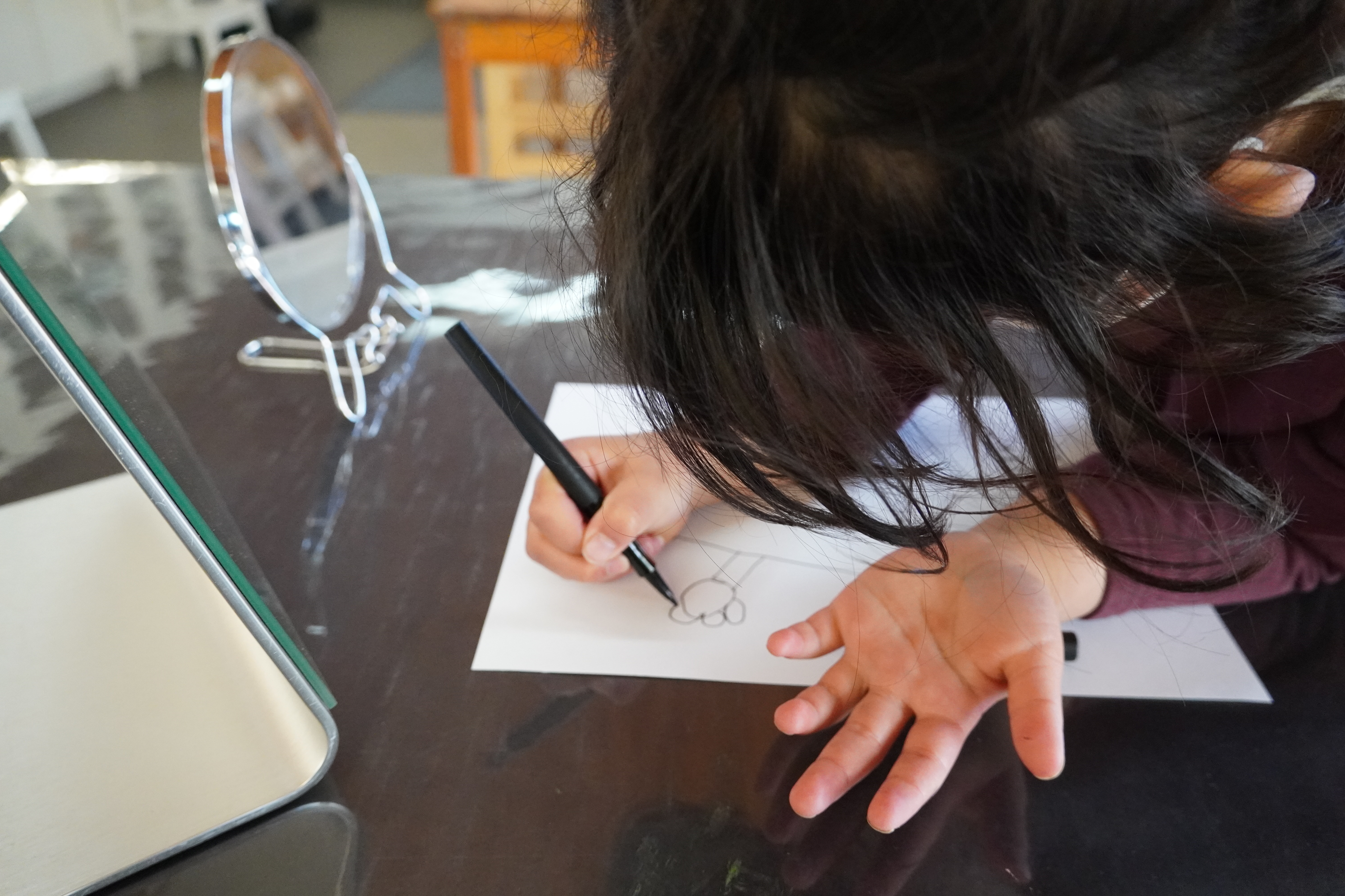 Amy: That was a great start. Let’s try again. Now think about the size of your head because it needs to have space for the details like your eyes. Think of the shape of them.