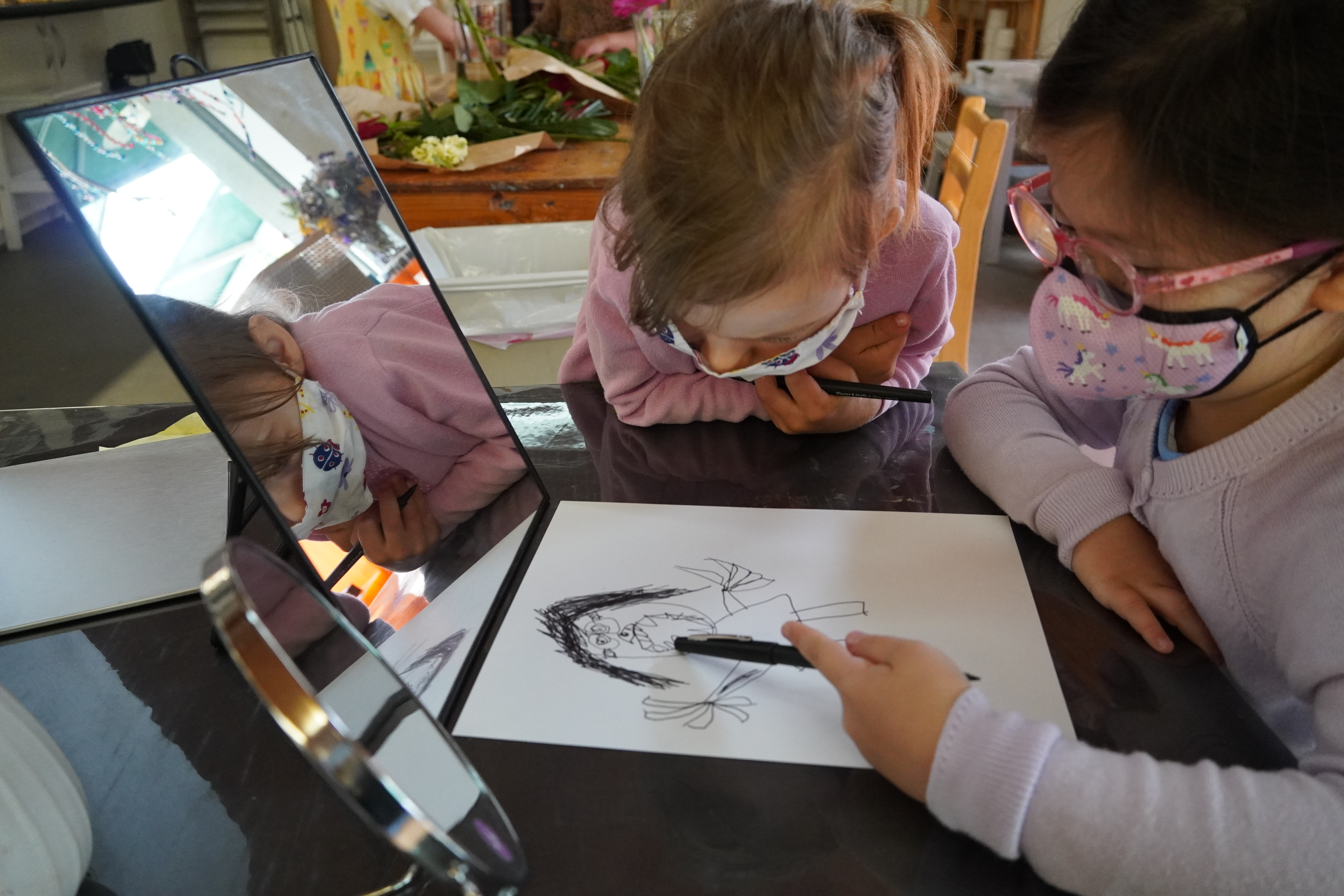Mia: (Noticing the details Christoph added to his ears) My ears have circles too. I am working on my eyes and then my ears.