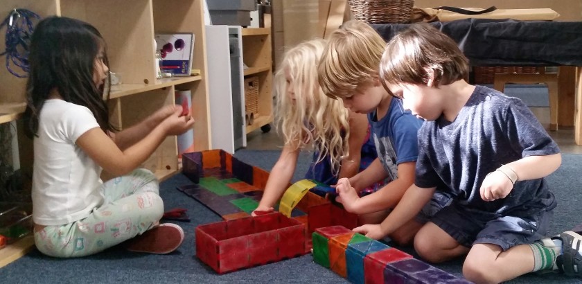 The East Wing Exploration Room has a constant goal of creating a track for balls. During an afternoon appointment, a group of children convened and discussed constructing a track and an abutting castle to capture the balls. Once at work, Amalia and Naia used magnet tiles to erect the castle. At the other end of the structure, Van and Cooper set a footstool on top of the building space platform and placed a rubber ramp on top, adding sandbags underneath to elevate the track. Then they added wooden tracks and incorporated magnet tiles for tunnels.