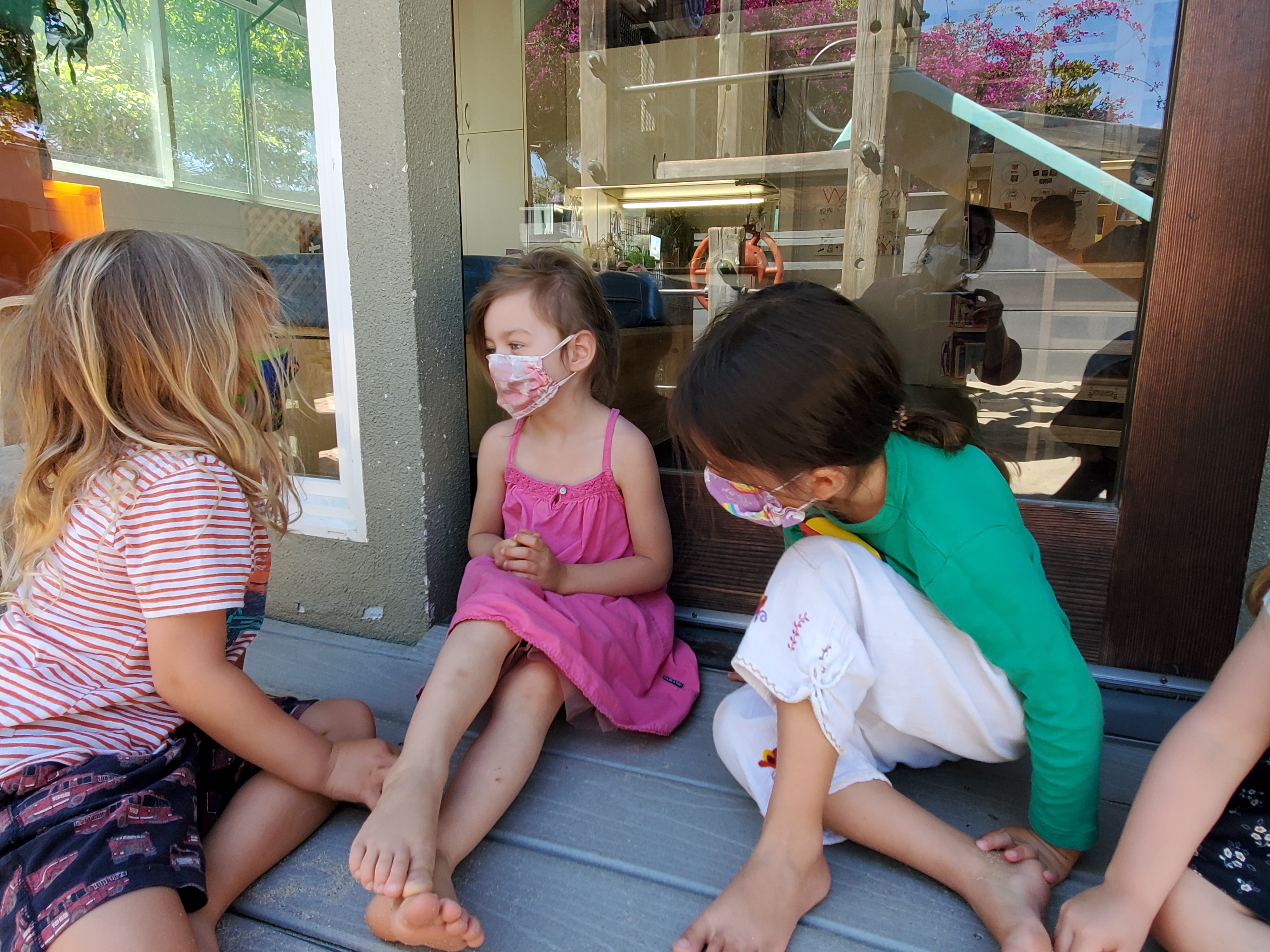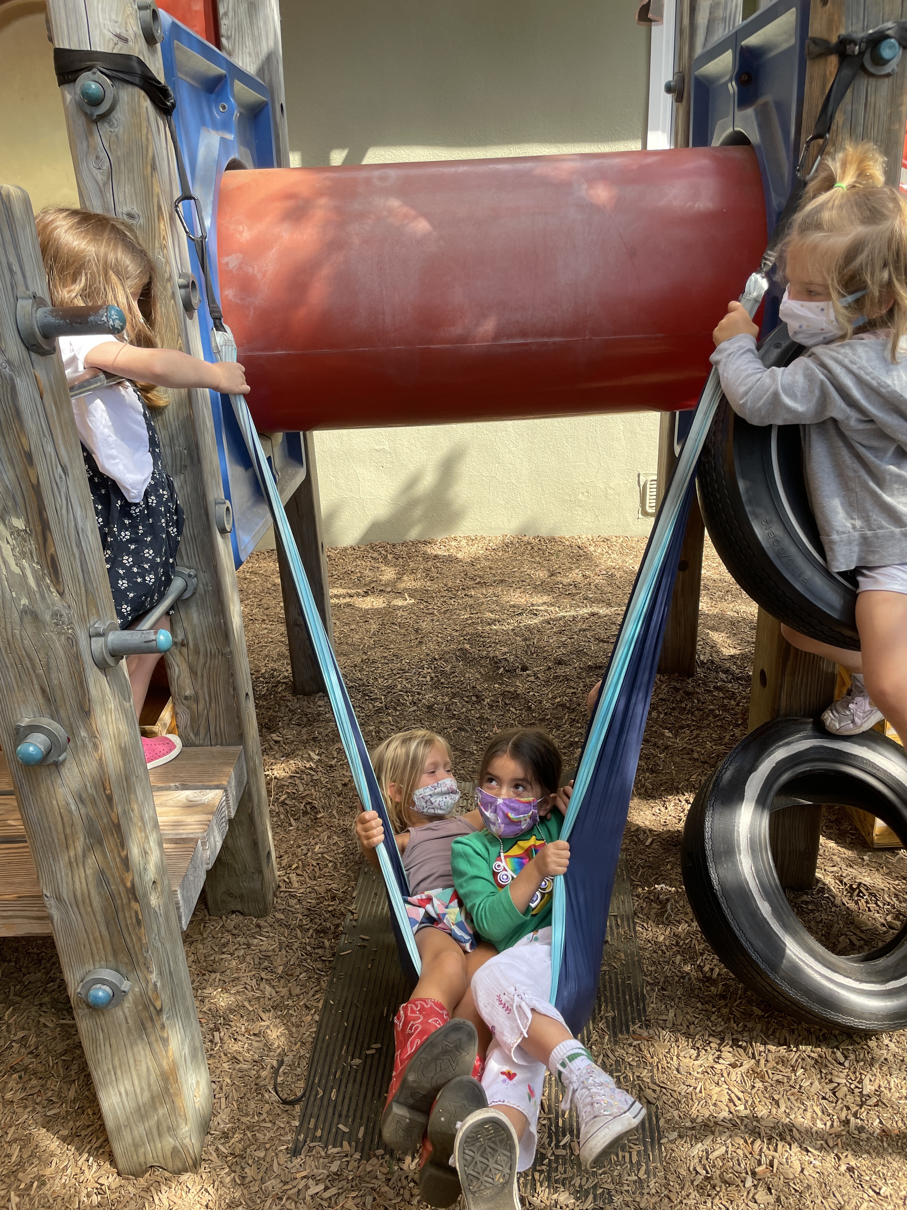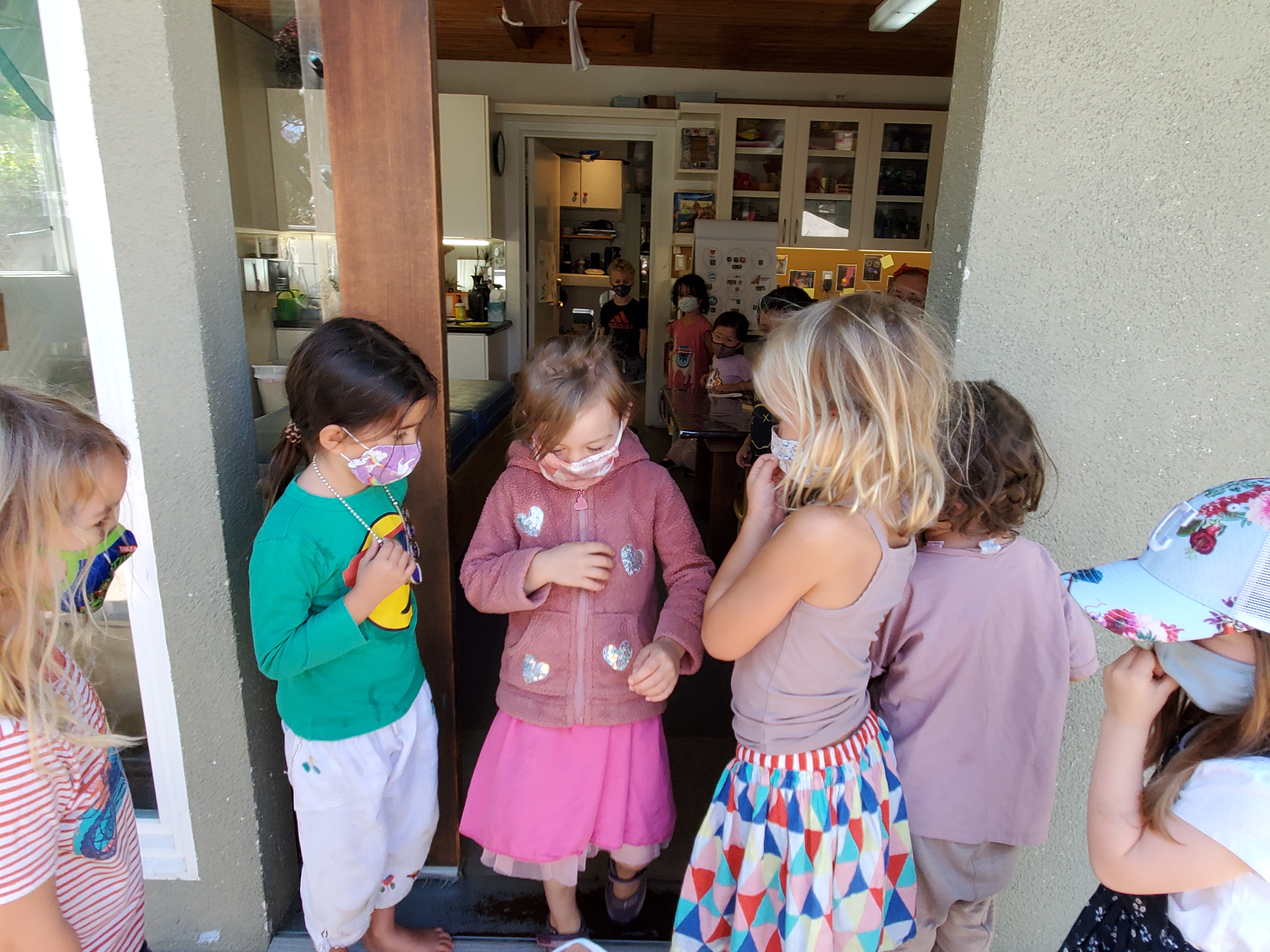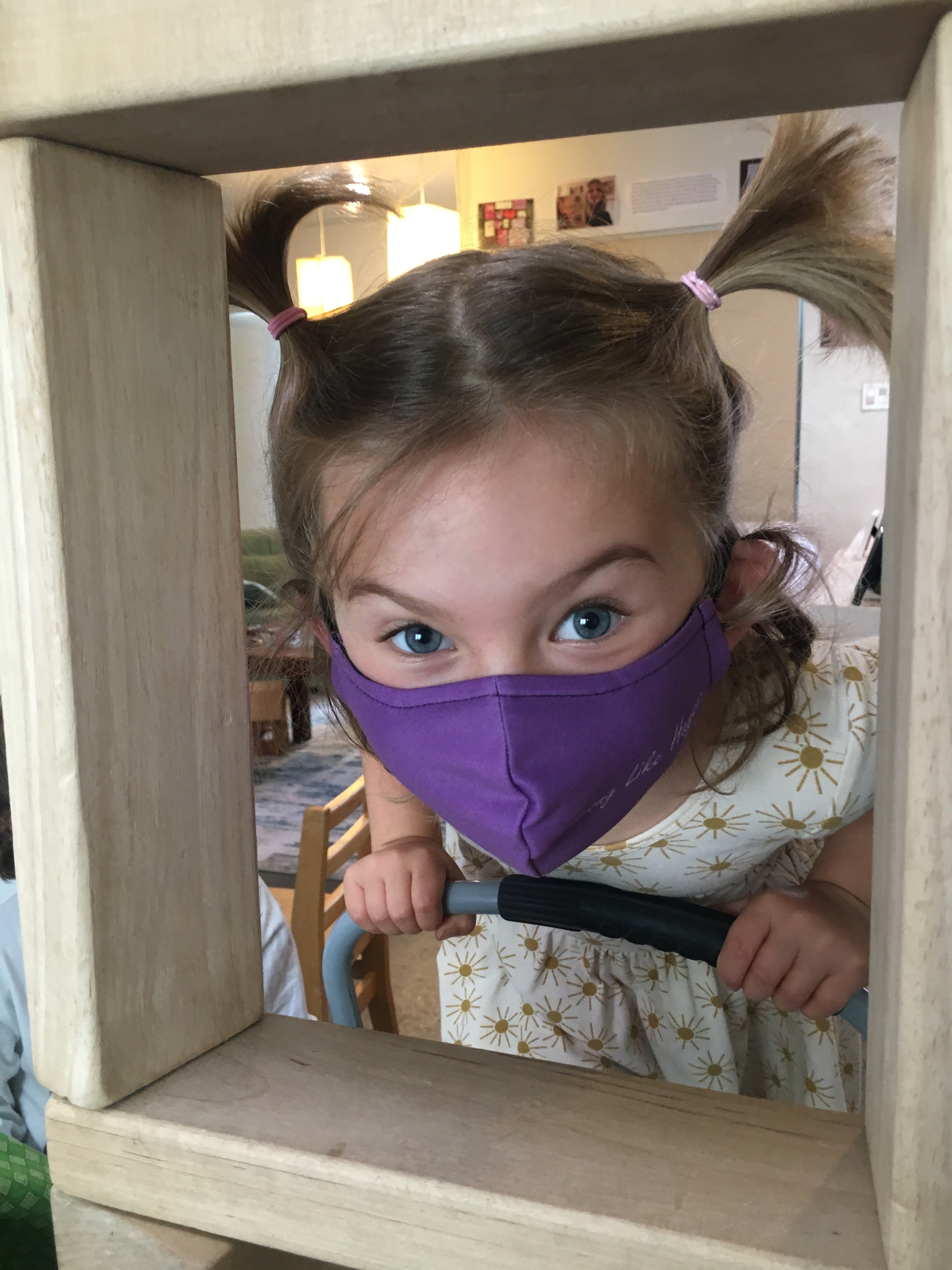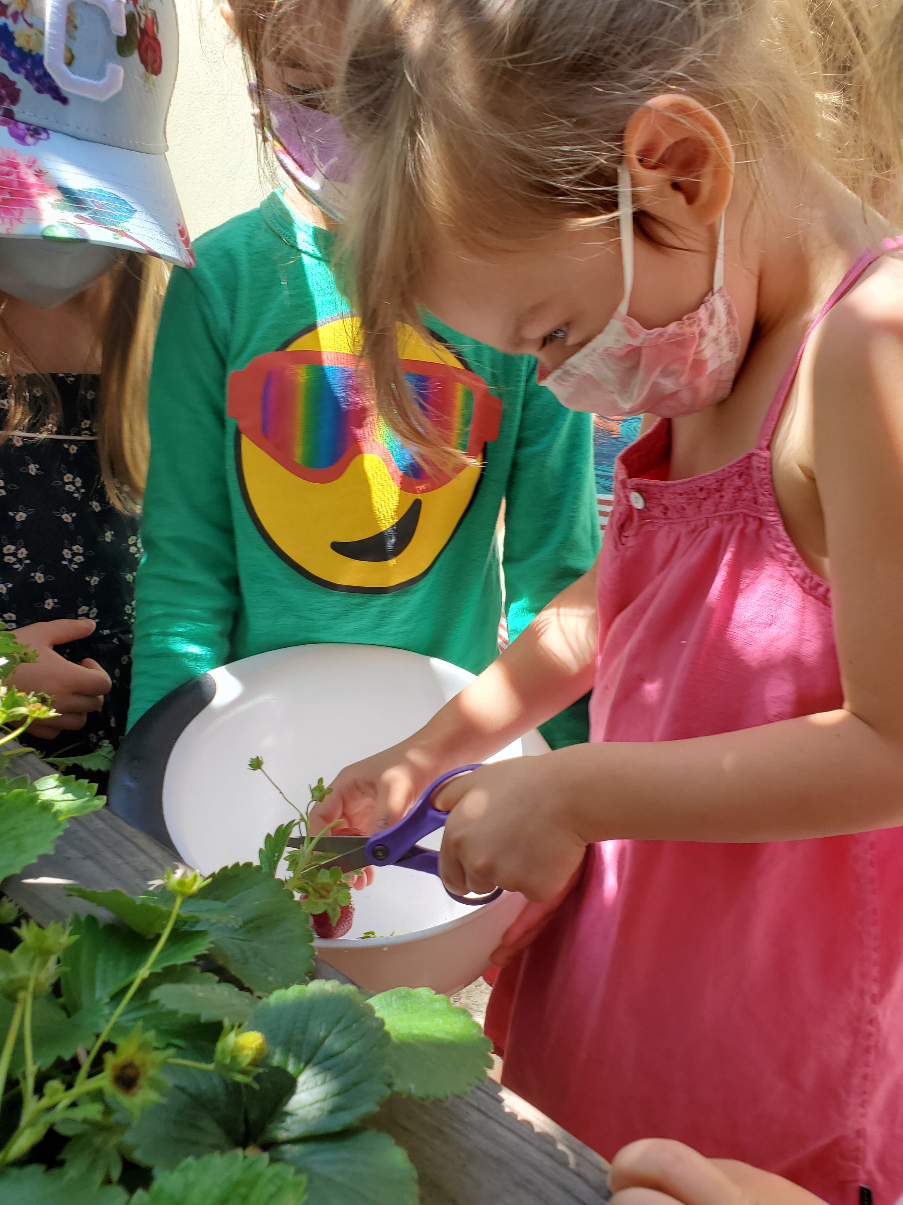 This week, our morning meetings have held space to share with the children that the Cilantros, Dandelions, Mints (NSW online group), and three current East Wingers will be the new East Wing group after summer break. The pod rosters were held side by side as a visual to symbolize coming together. Marley recognized the faces from the Mint group and introduced us to the children from his ‘ipad school.’ Part of our bridging relationships to get to know the children from the other pods has been to read aloud their new identity panels. As Mason’s was being read, hands shot up in the air to express that they too had similar interests. That same morning we welcomed Mason from the Aloe Vera group to our very first real time play experience together. The children were beside themselves when the atelier sliding door opened to greet Mason in the Sand Area. Just a glimpse of our year-long barrier opening filled us all with hope for more connected magical moments. Mason played with the friends, showed us how to go up the bars, and we invited her to the Community Garden to harvest strawberries. We are so excited for Mason to join us in our outdoor play Wednesday and Friday mornings. It will be fun to see new friendships blossom!
