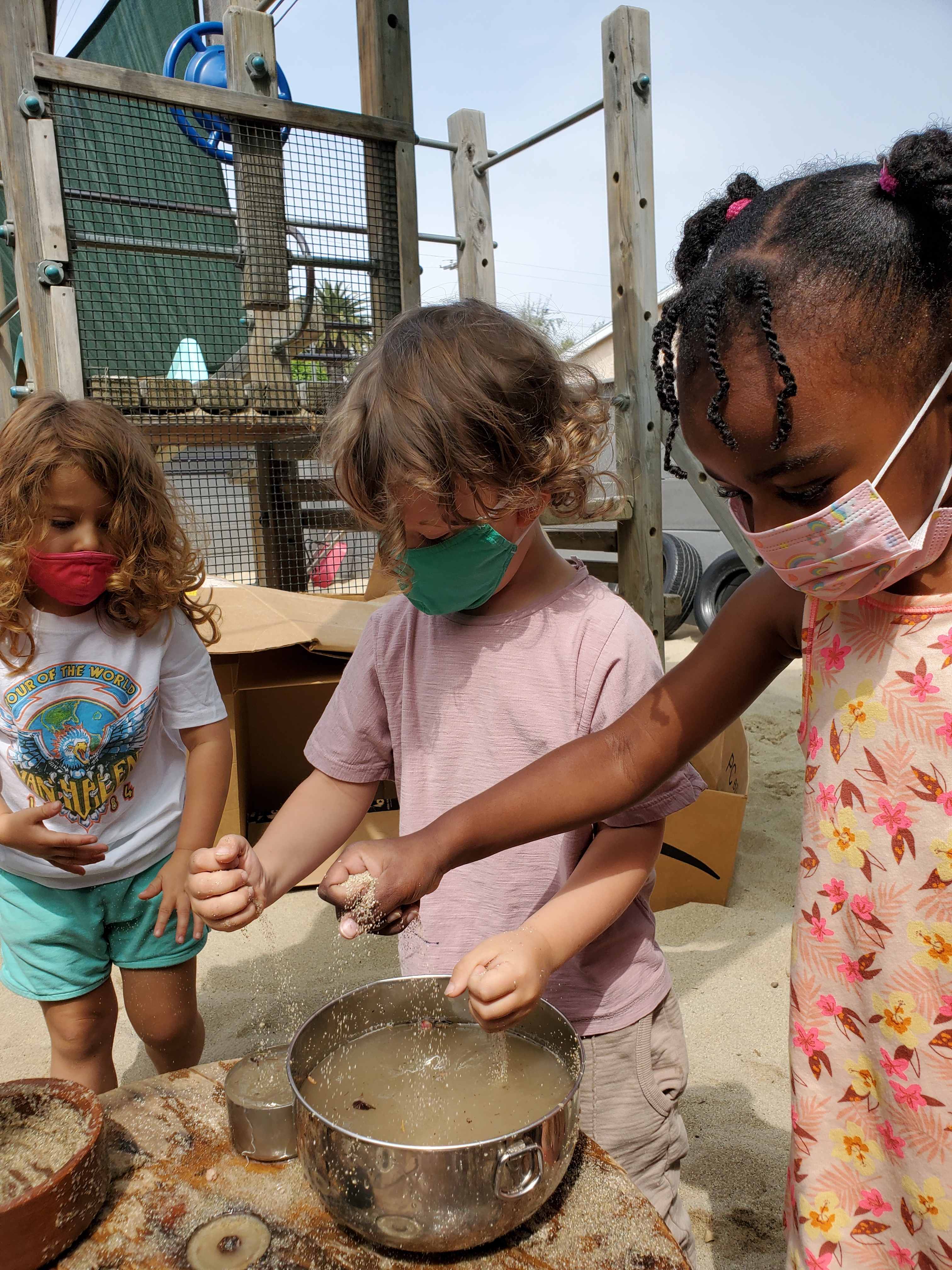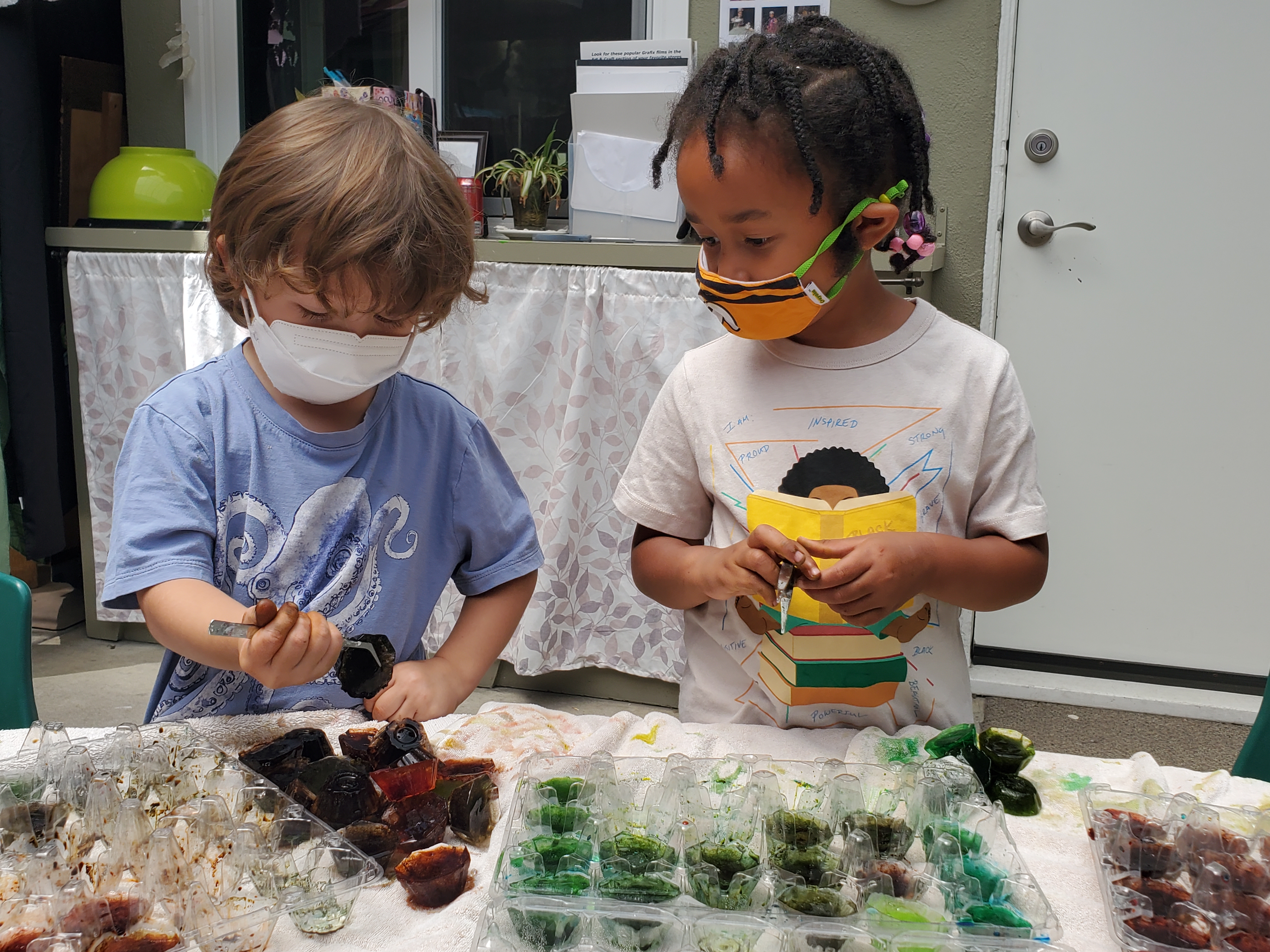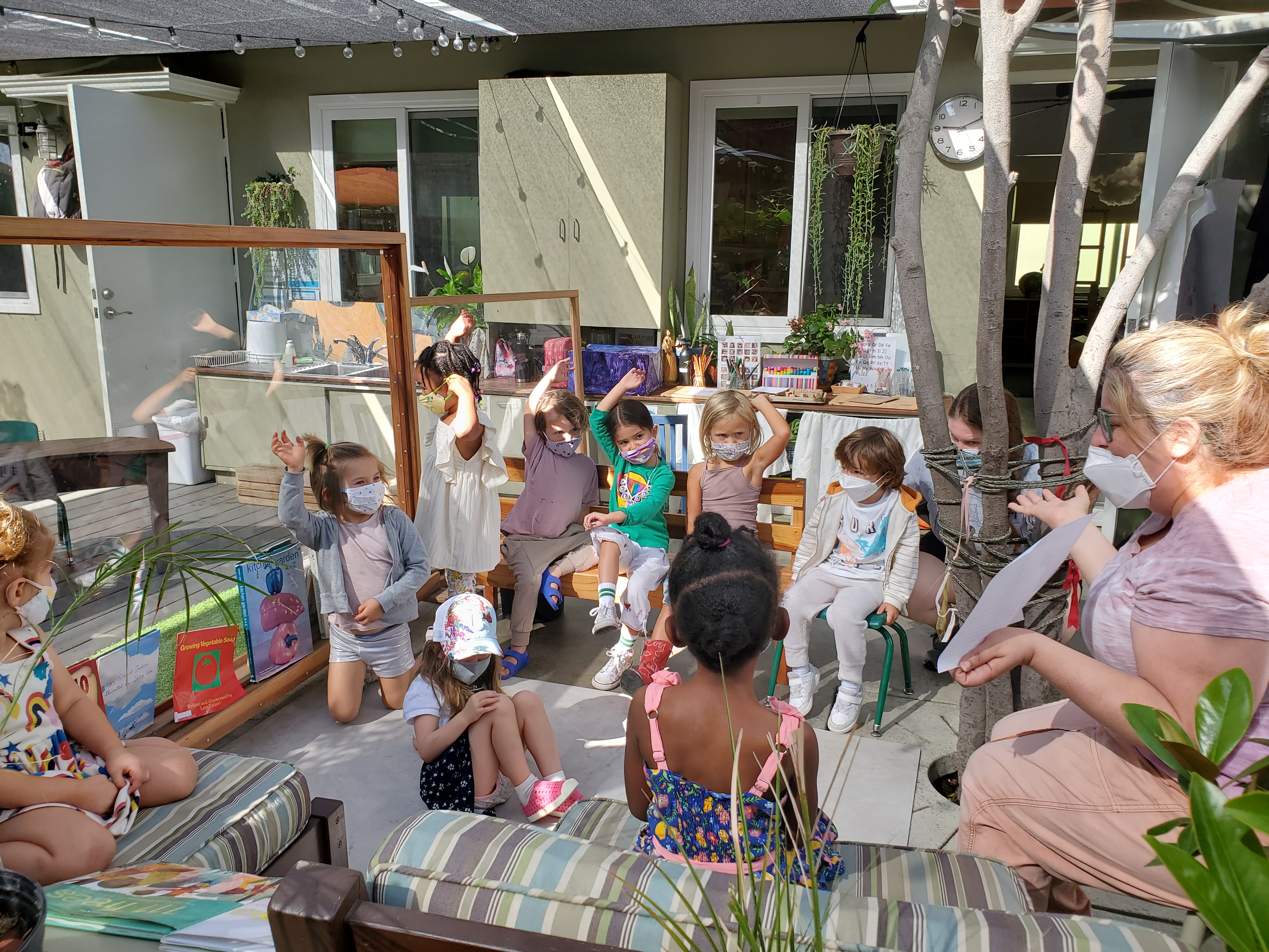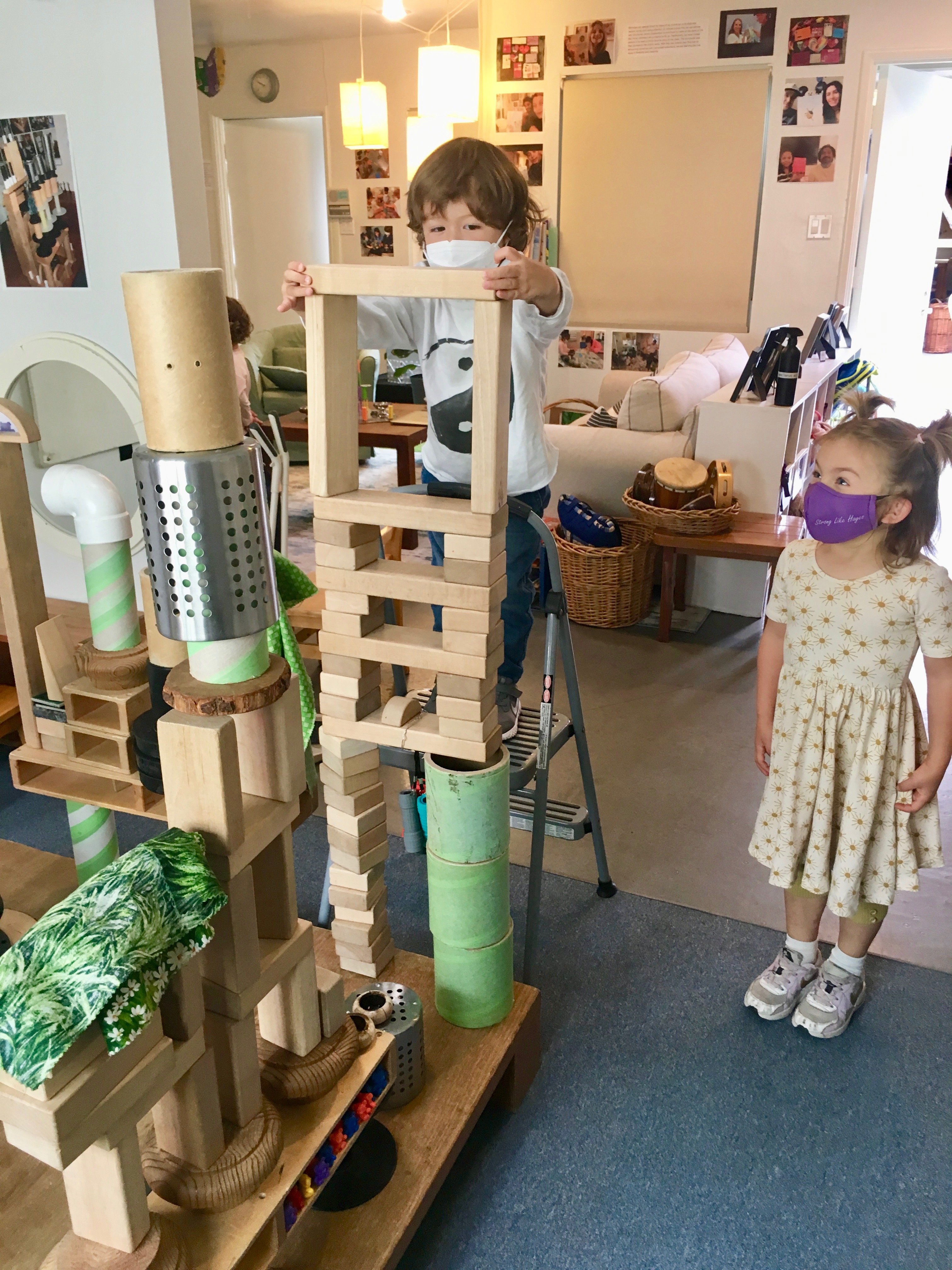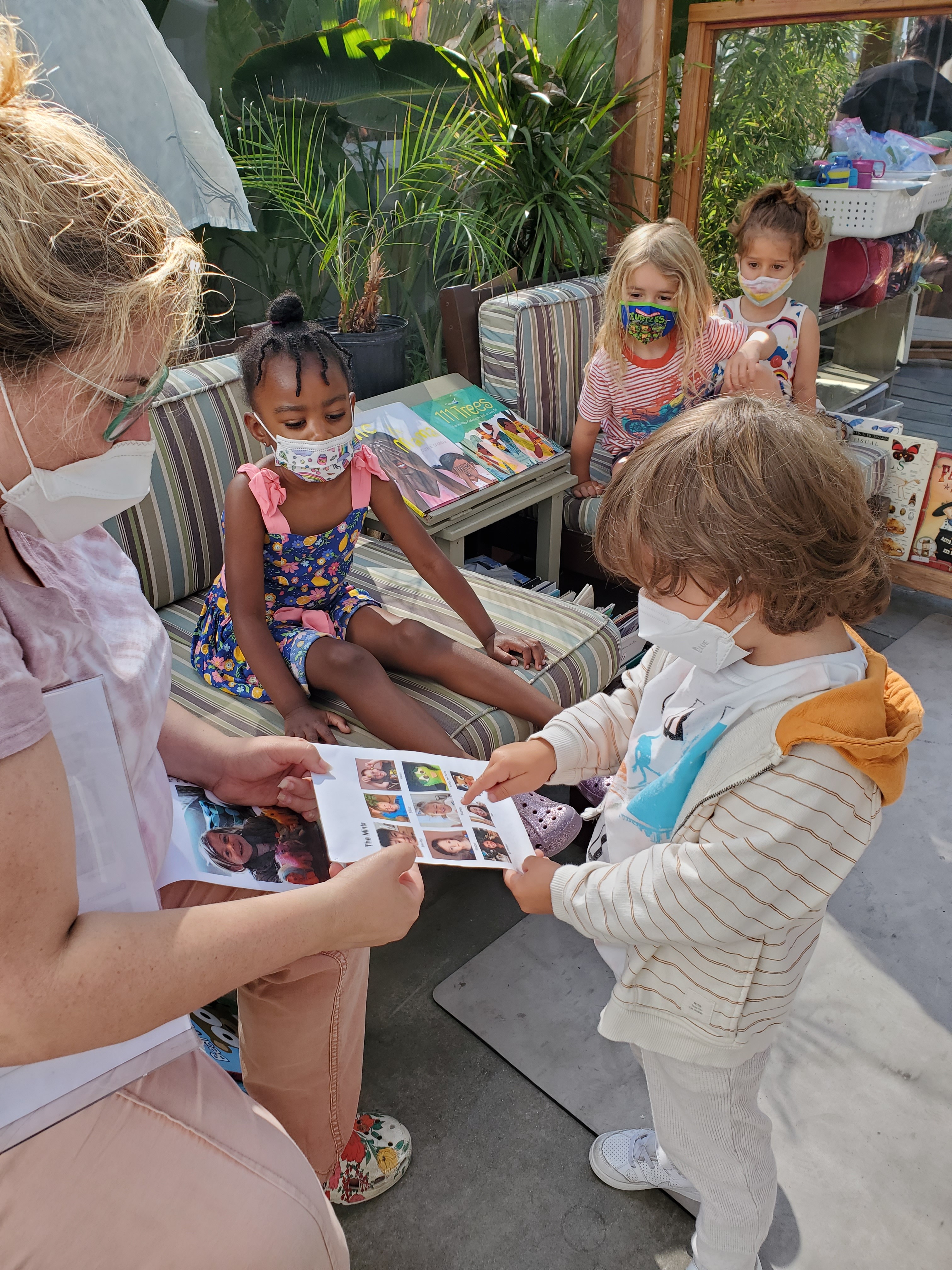 This week, our morning meetings have held space to share with the children that the Cilantros, Dandelions, Mints (NSW online group), and three current East Wingers will be the new East Wing group after summer break. The pod rosters were held side by side as a visual to symbolize coming together. Marley recognized the faces from the Mint group and introduced us to the children from his ‘ipad school.’ Part of our bridging relationships to get to know the children from the other pods has been to read aloud their new identity panels. As Mason’s was being read, hands shot up in the air to express that they too had similar interests. That same morning we welcomed Mason from the Aloe Vera group to our very first real time play experience together. The children were beside themselves when the atelier sliding door opened to greet Mason in the Sand Area. Just a glimpse of our year-long barrier opening filled us all with hope for more connected magical moments. Mason played with the friends, showed us how to go up the bars, and we invited her to the Community Garden to harvest strawberries. We are so excited for Mason to join us in our outdoor play Wednesday and Friday mornings. It will be fun to see new friendships blossom!