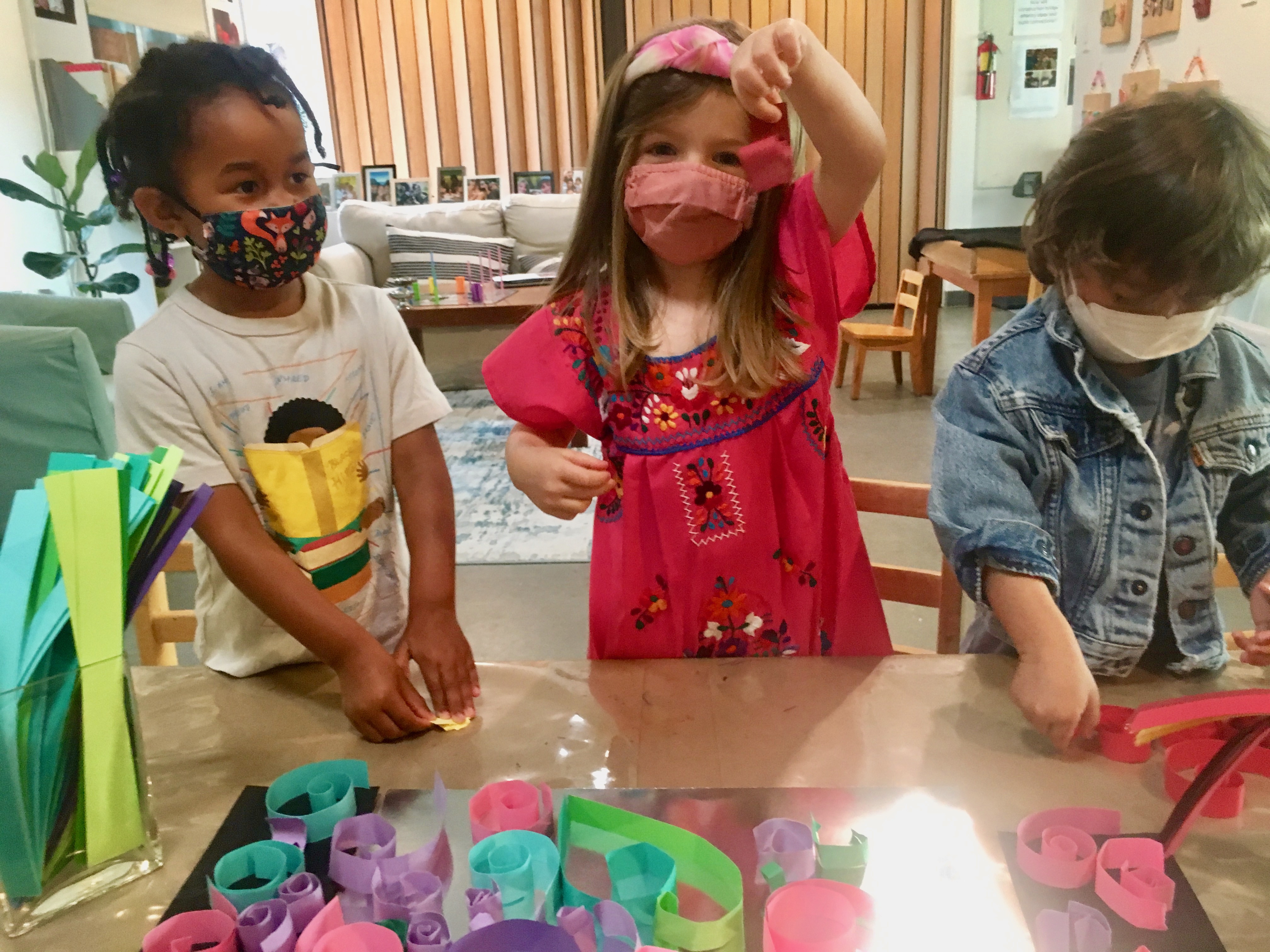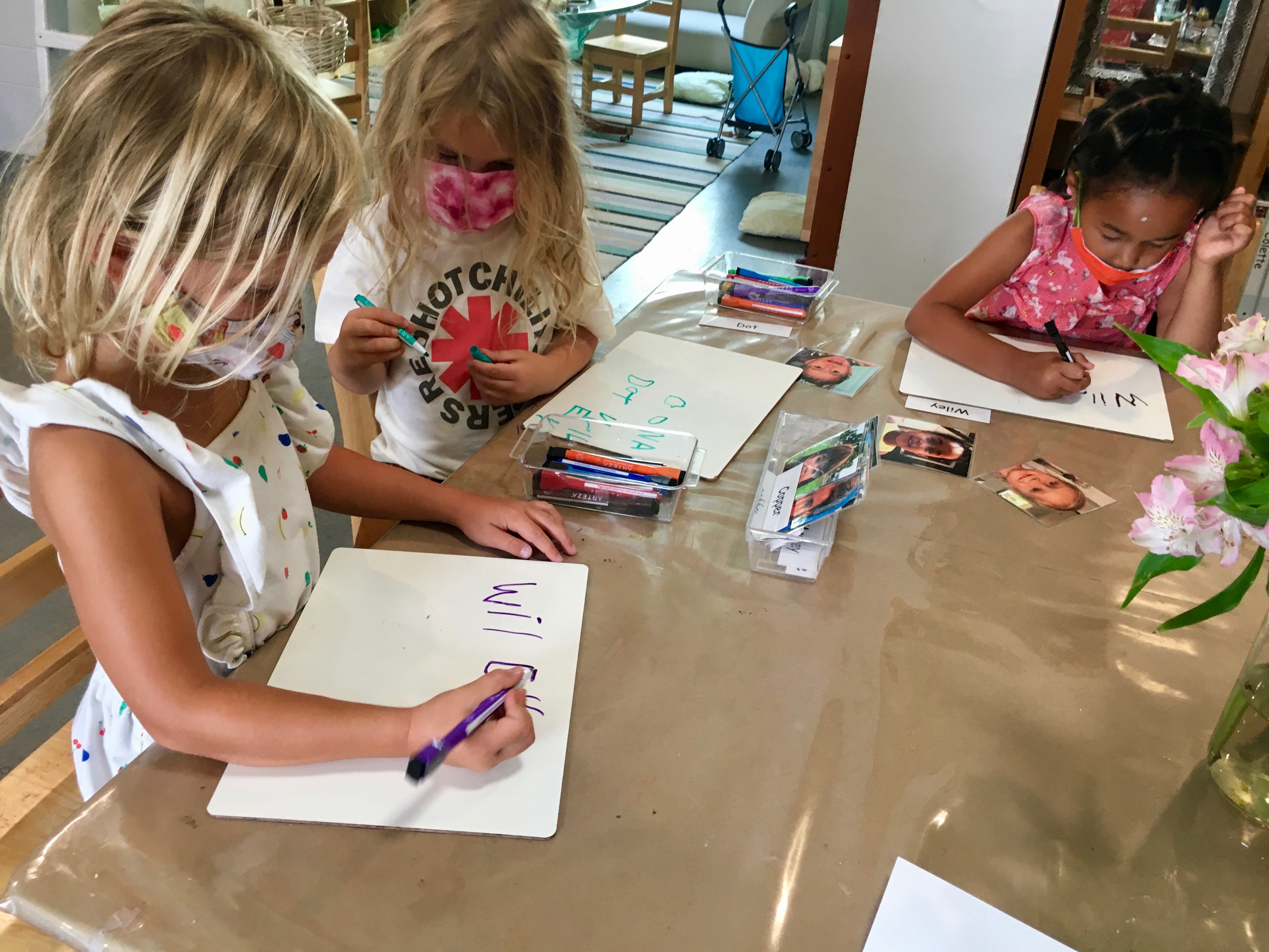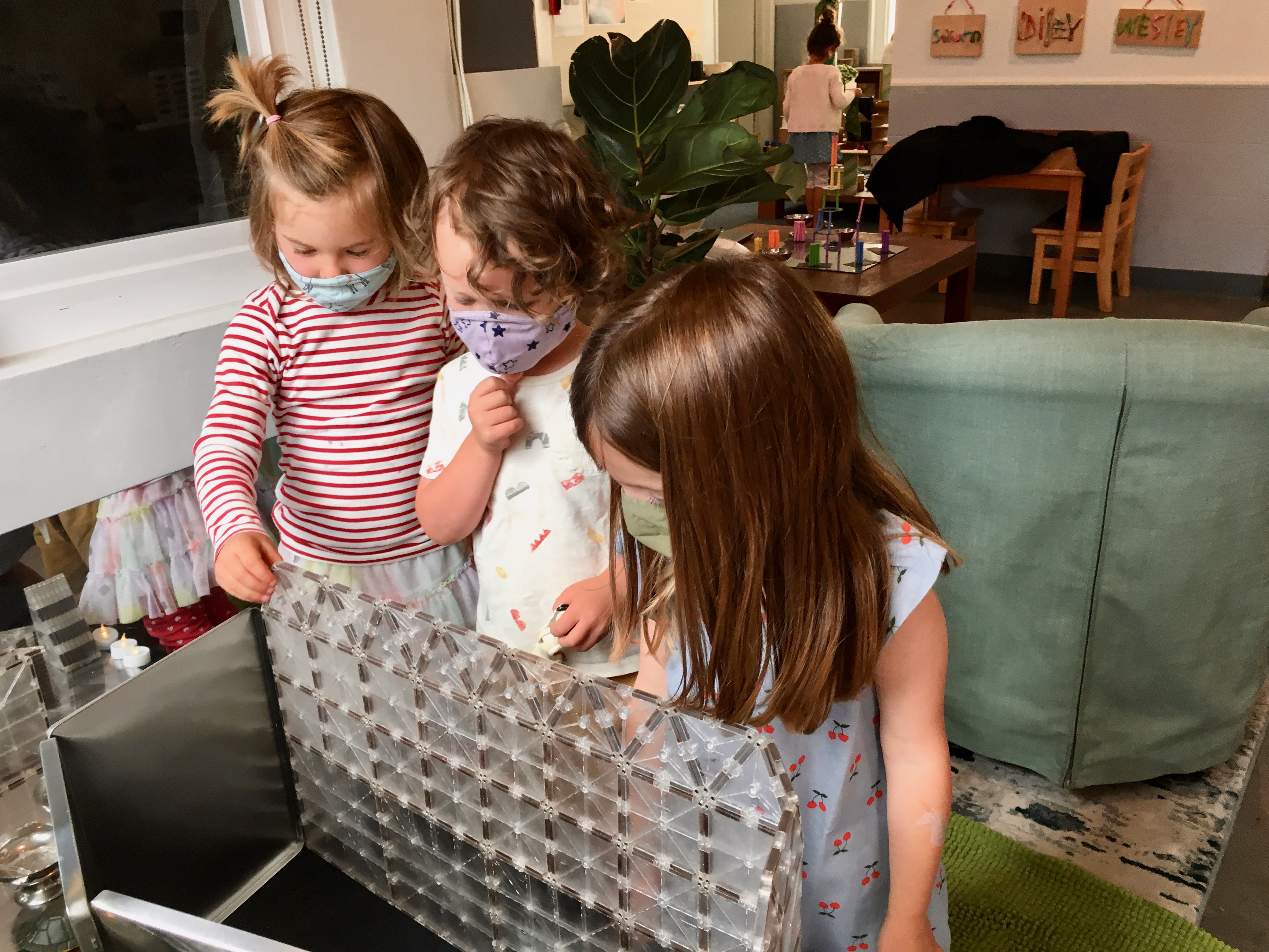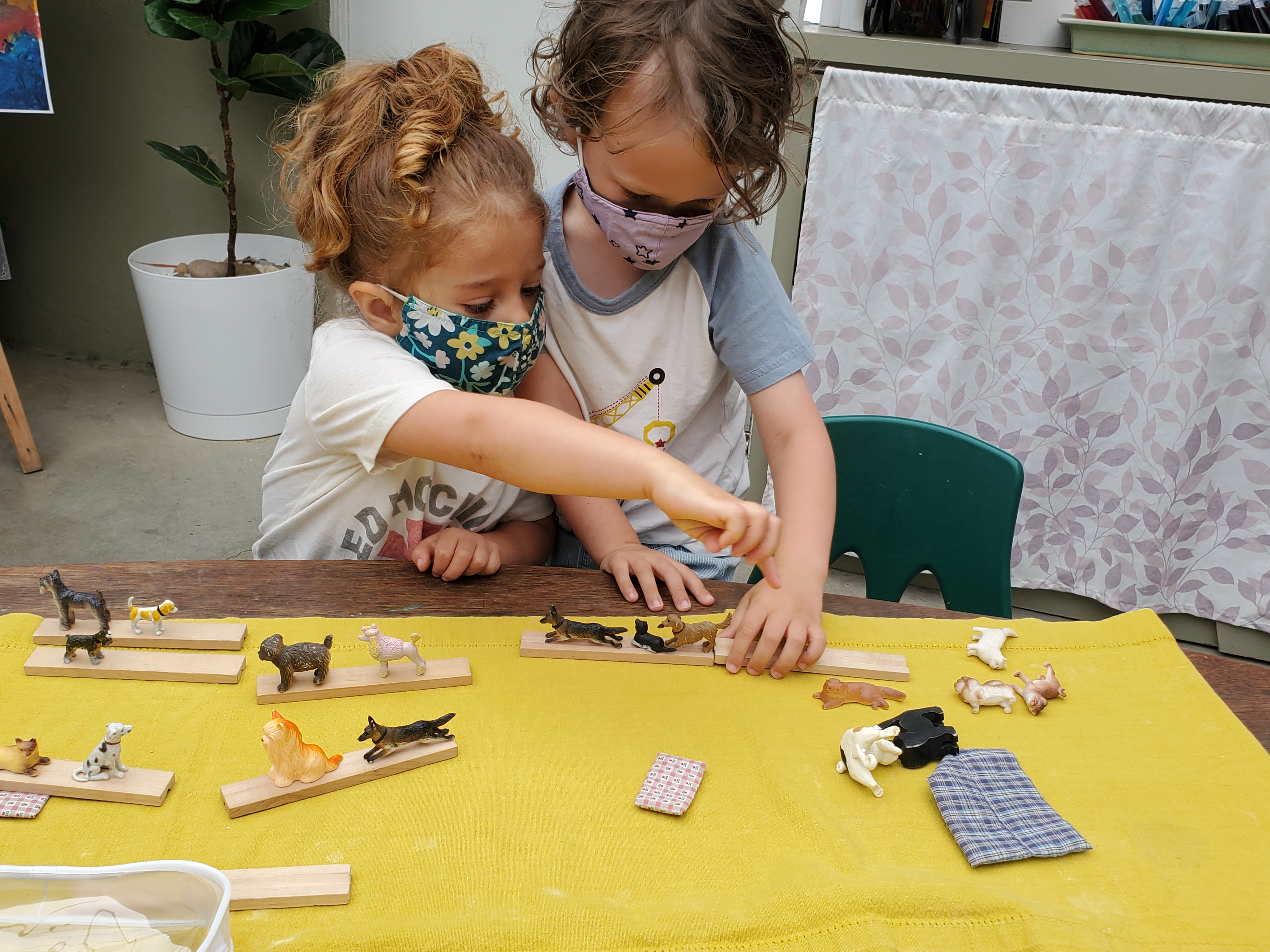 This week, our morning meetings have held space to share with the children that the Cilantros, Dandelions, Mints (NSW online group), and three current East Wingers will be the new East Wing group after summer break. The pod rosters were held side by side as a visual to symbolize coming together. Marley recognized the faces from the Mint group and introduced us to the children from his ‘ipad school.’ Part of our bridging relationships to get to know the children from the other pods has been to read aloud their new identity panels. As Mason’s was being read, hands shot up in the air to express that they too had similar interests. That same morning we welcomed Mason from the Aloe Vera group to our very first real time play experience together. The children were beside themselves when the atelier sliding door opened to greet Mason in the Sand Area. Just a glimpse of our year-long barrier opening filled us all with hope for more connected magical moments. Mason played with the friends, showed us how to go up the bars, and we invited her to the Community Garden to harvest strawberries. We are so excited for Mason to join us in our outdoor play Wednesday and Friday mornings. It will be fun to see new friendships blossom!