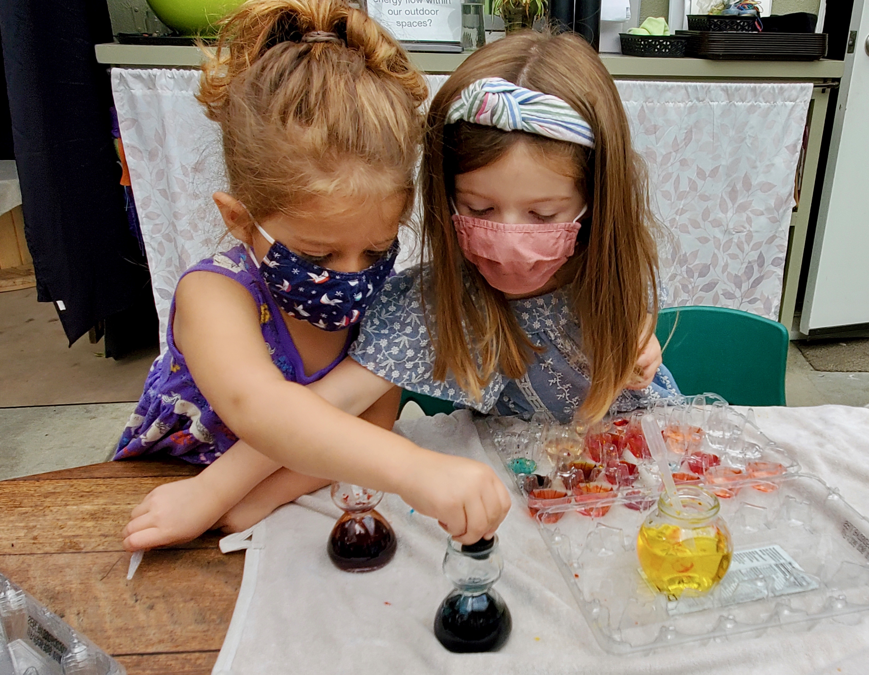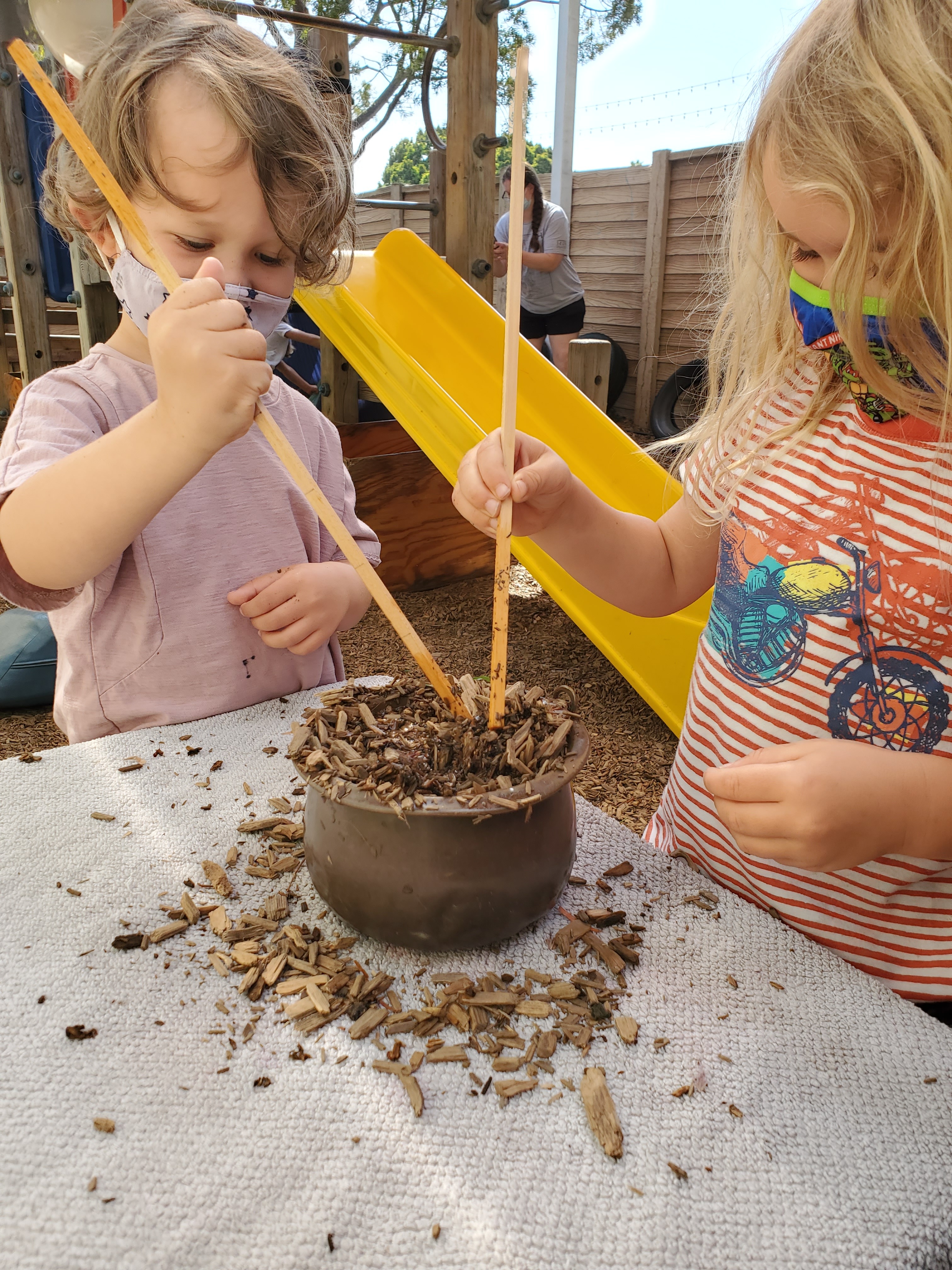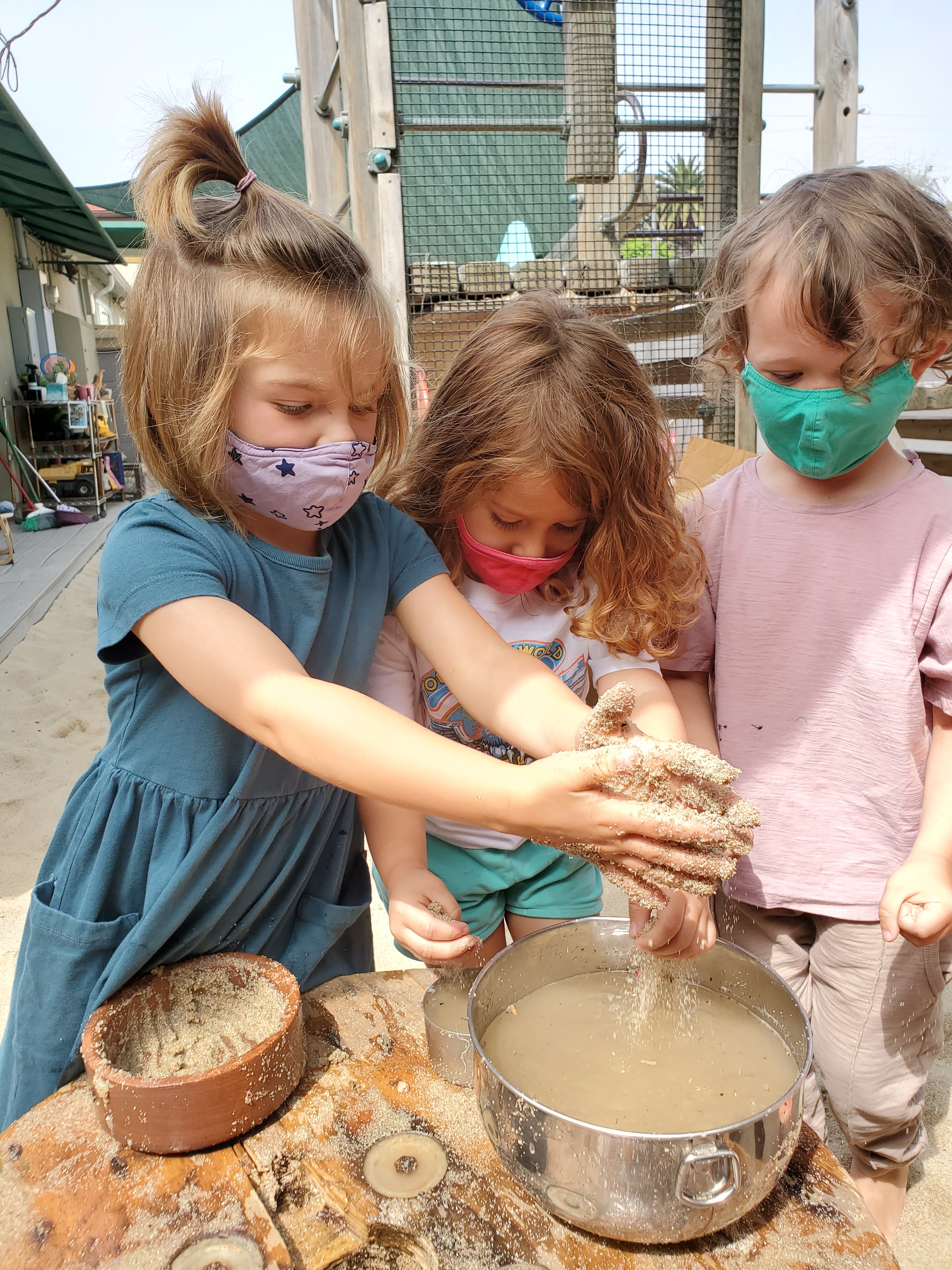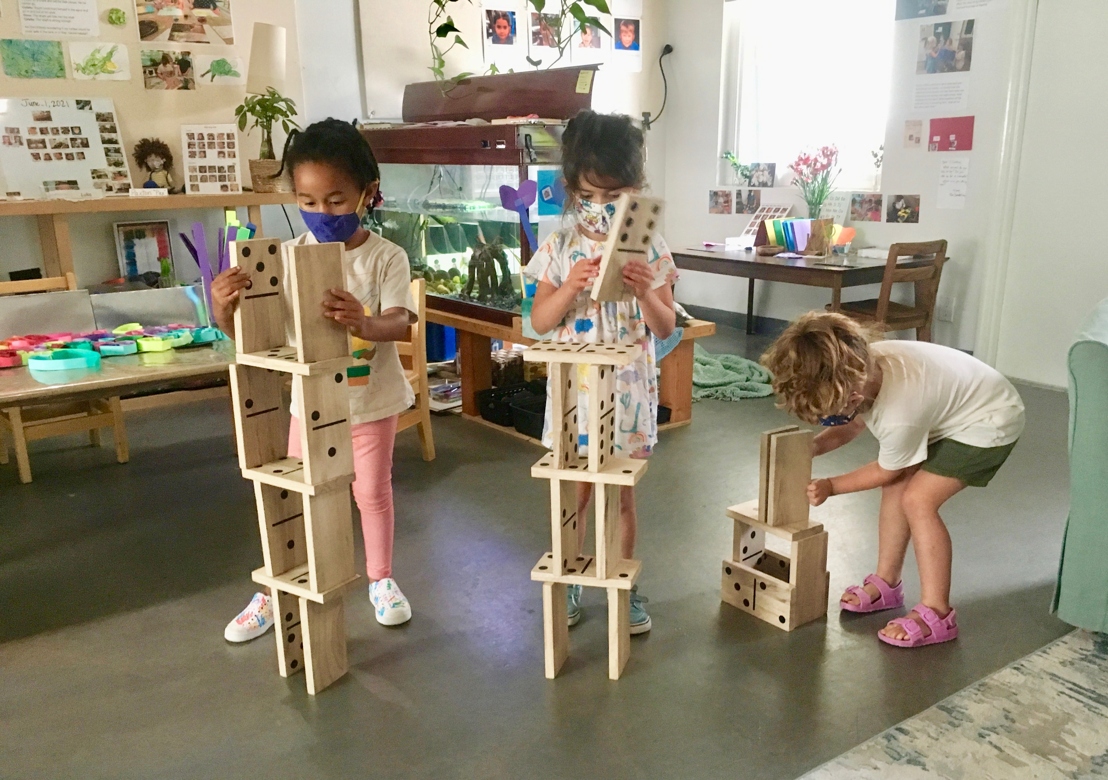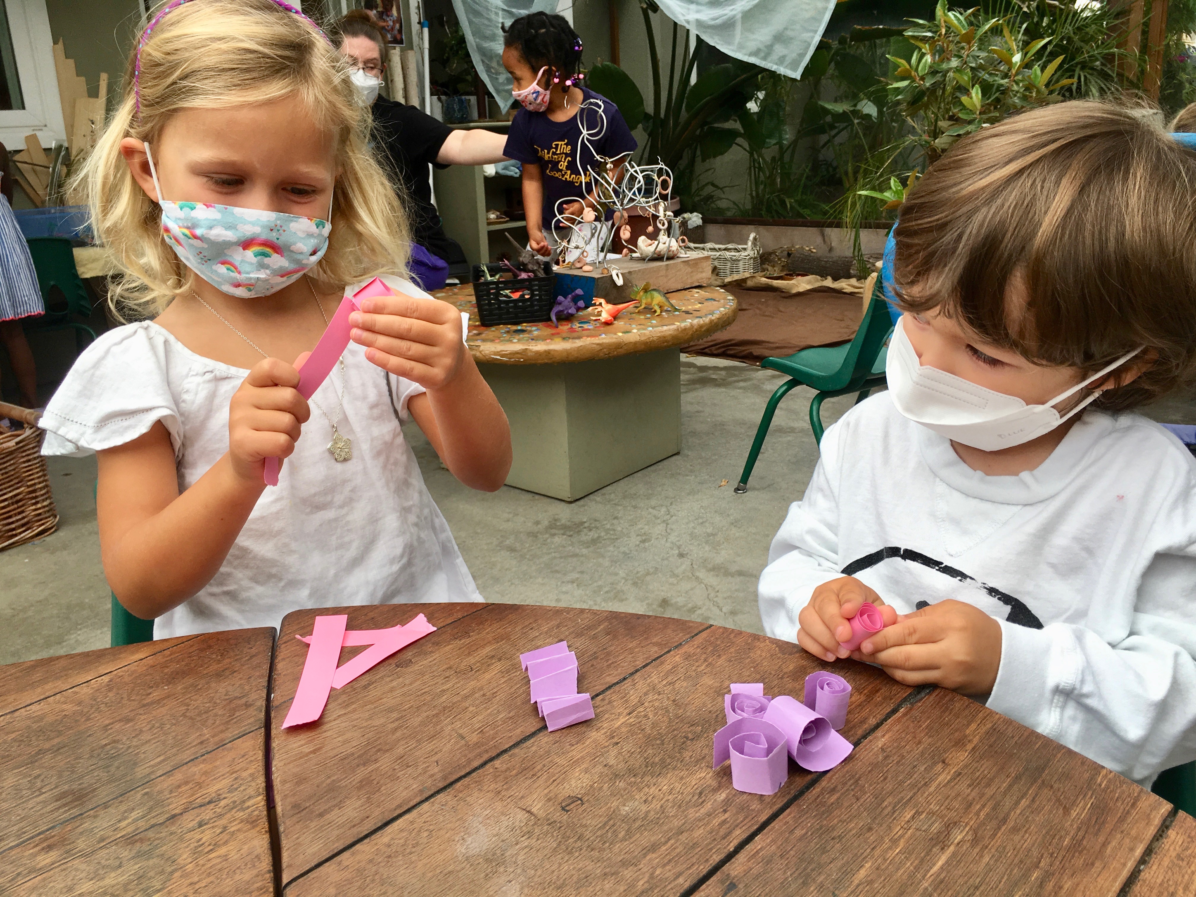 This week, our morning meetings have held space to share with the children that the Cilantros, Dandelions, Mints (NSW online group), and three current East Wingers will be the new East Wing group after summer break. The pod rosters were held side by side as a visual to symbolize coming together. Marley recognized the faces from the Mint group and introduced us to the children from his ‘ipad school.’ Part of our bridging relationships to get to know the children from the other pods has been to read aloud their new identity panels. As Mason’s was being read, hands shot up in the air to express that they too had similar interests. That same morning we welcomed Mason from the Aloe Vera group to our very first real time play experience together. The children were beside themselves when the atelier sliding door opened to greet Mason in the Sand Area. Just a glimpse of our year-long barrier opening filled us all with hope for more connected magical moments. Mason played with the friends, showed us how to go up the bars, and we invited her to the Community Garden to harvest strawberries. We are so excited for Mason to join us in our outdoor play Wednesday and Friday mornings. It will be fun to see new friendships blossom!
