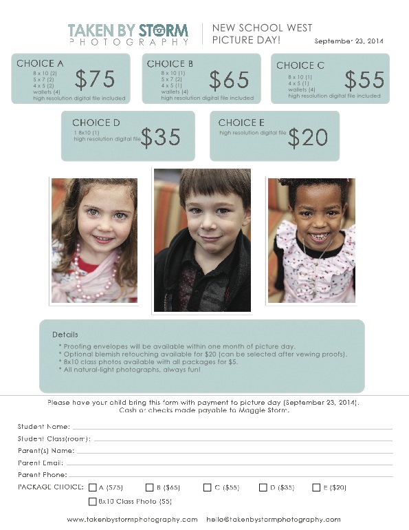 Meet at NSW at 8:30am East Wing and 8:45am West Wing for PICTURE DAY. This timing is for the group photo. If you don’t come on Tuesdays, please try to come to this group photo event or know that we will schedule a makeup (and photoshop) group picture day. Individual photos will be taken all morning and all orders for photos go through, Maggie Storm.