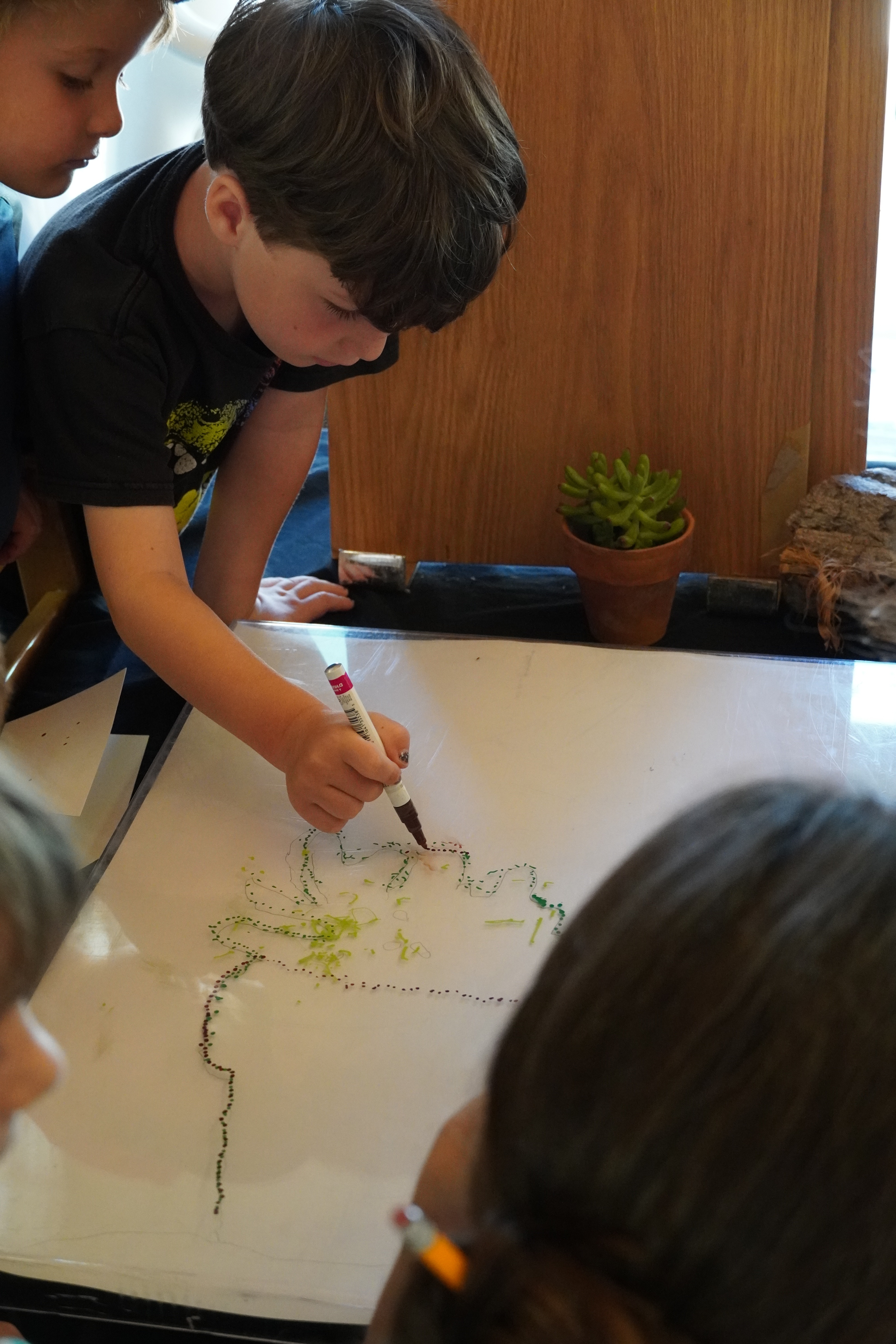 The children patiently waited while they connected the outline with pencil around the table of seated friends. Referencing the succulent, the group agreed on the color scheme and together they worked with the oil paint pens to begin the representation of the plant. The new surface of the Plexi was slippery and the first attempts of a dot were not as easy as expected for the children.