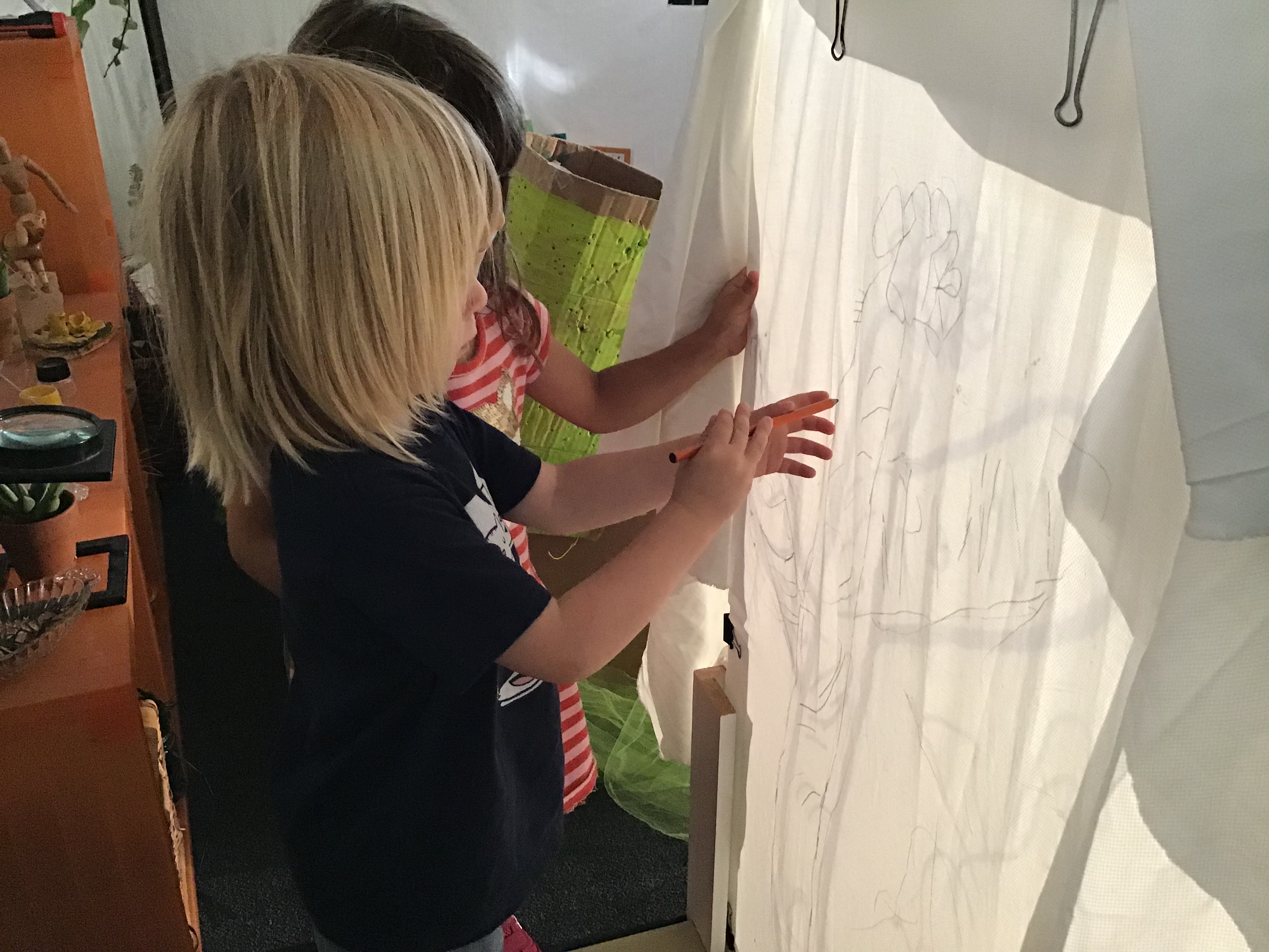 The children patiently waited while they connected the outline with pencil around the table of seated friends. Referencing the succulent, the group agreed on the color scheme and together they worked with the oil paint pens to begin the representation of the plant. The new surface of the Plexi was slippery and the first attempts of a dot were not as easy as expected for the children.